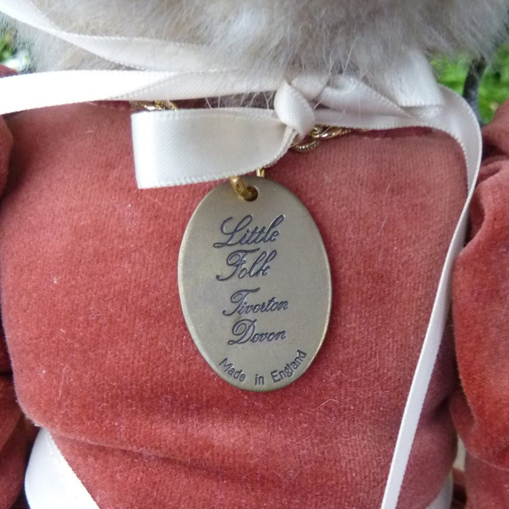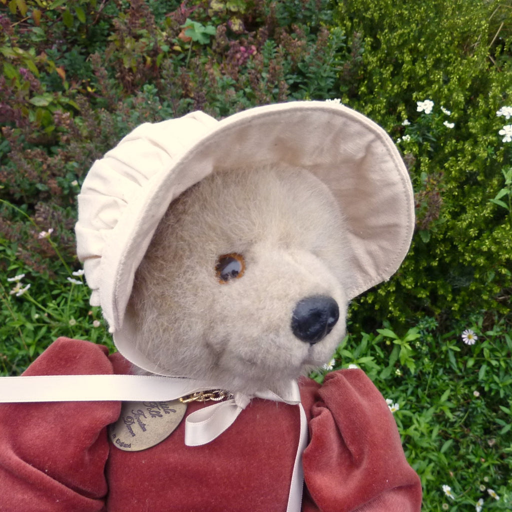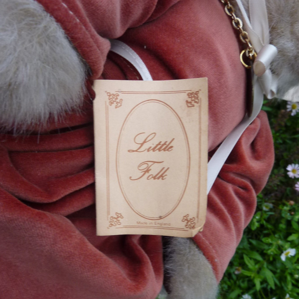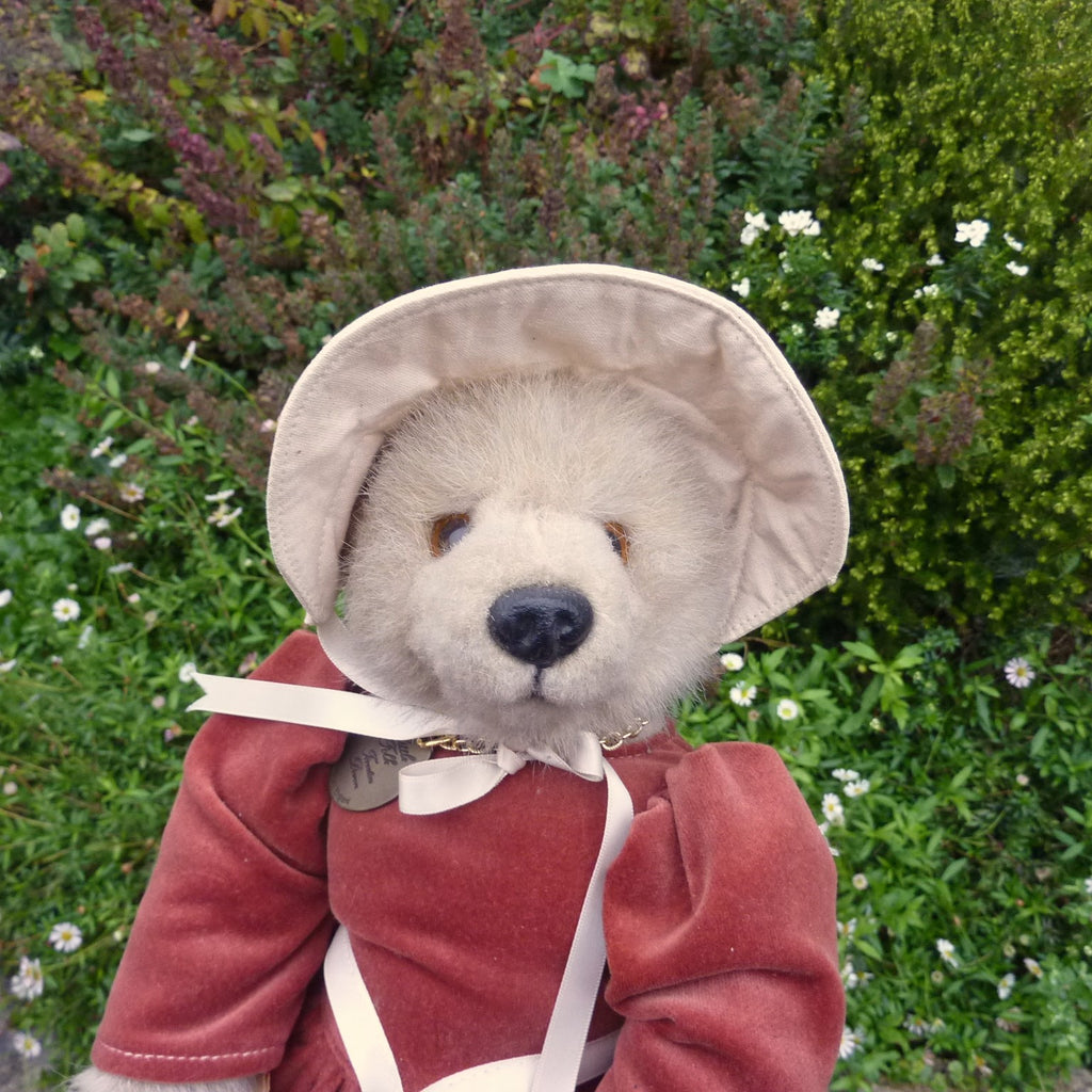 This iconic Little Folk bear is made of soft and dense, high quality, oatmeal, manmade plush with black plastic eyes, a moulded plastic nose and faux suede paw pads. She wears a removable Edwardian-style velvet dress and a cream cotton bonnet. The label is slightly aged but the bear is in very good condition.