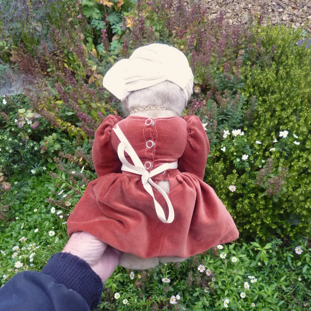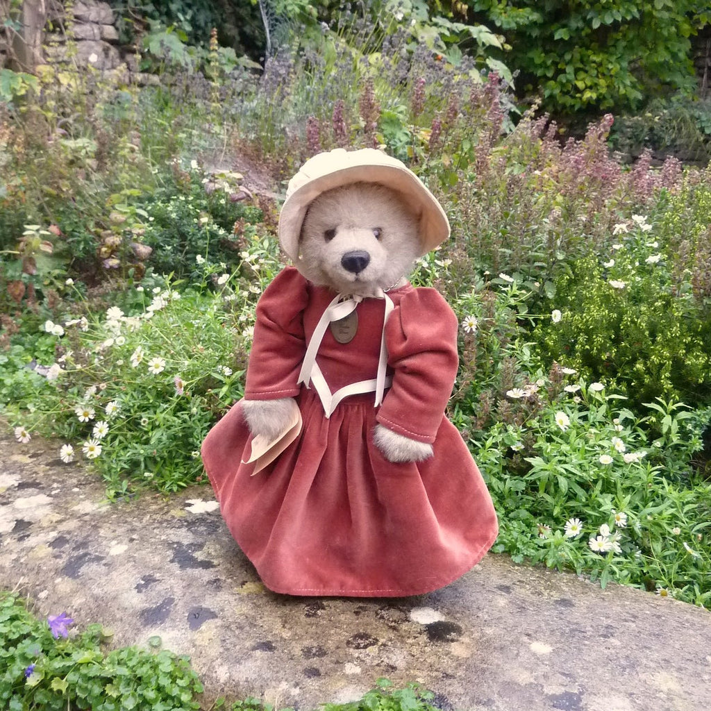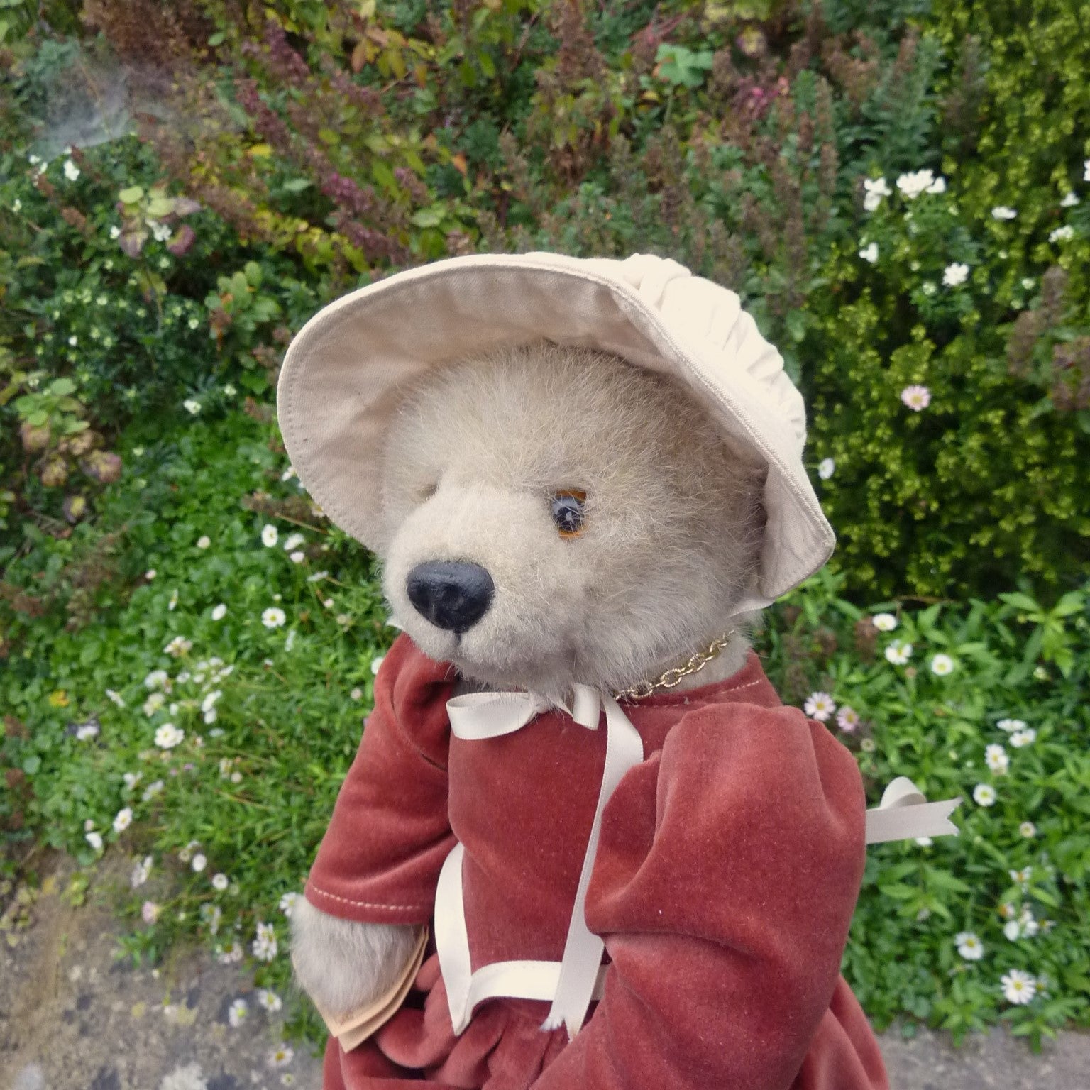 This iconic Little Folk bear is made of soft and dense, high quality, oatmeal, manmade plush with black plastic eyes, a moulded plastic nose and faux suede paw pads. She wears a removable Edwardian-style velvet dress and a cream cotton bonnet. The label is slightly aged but the bear is in very good condition.