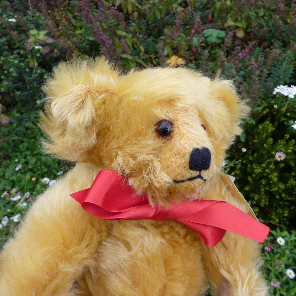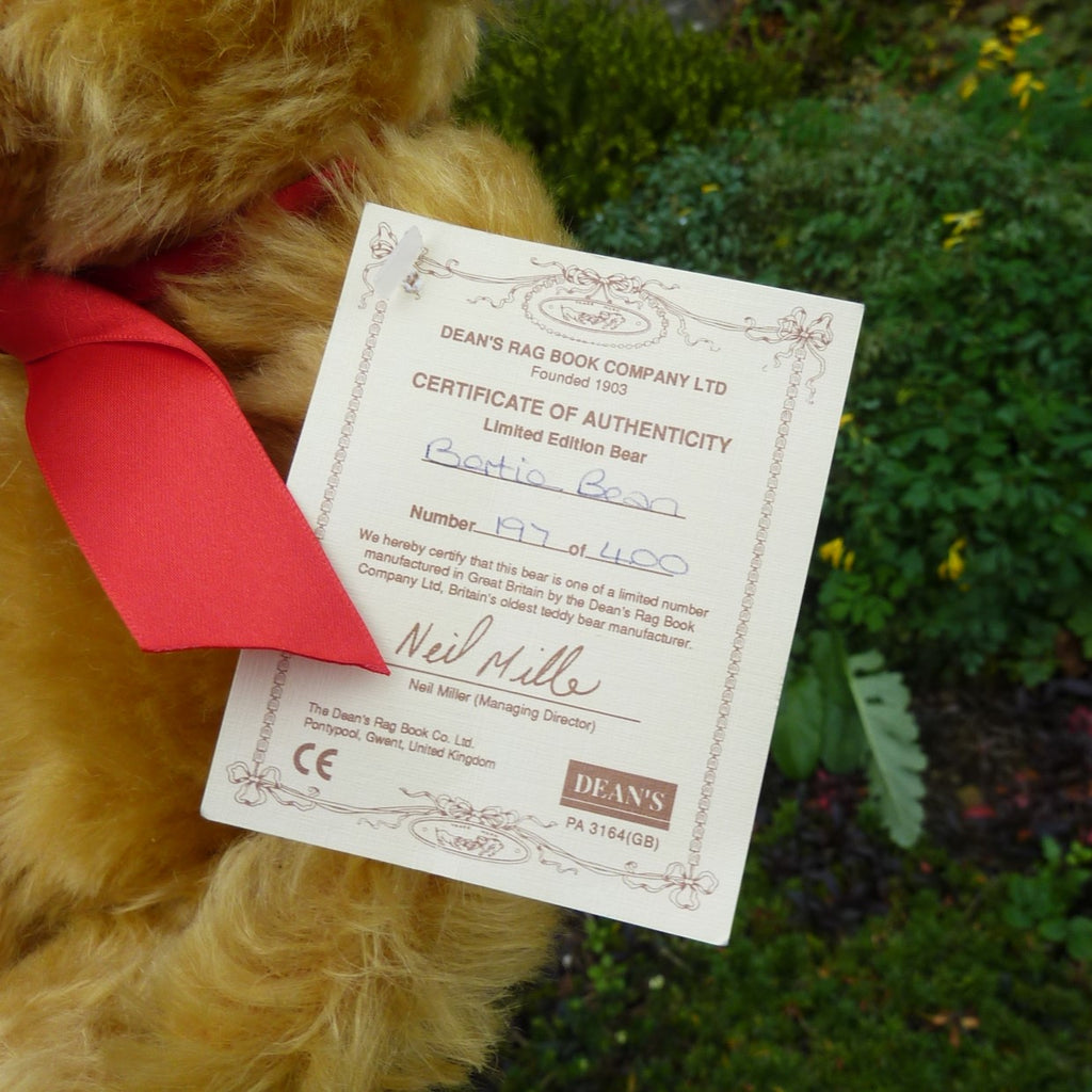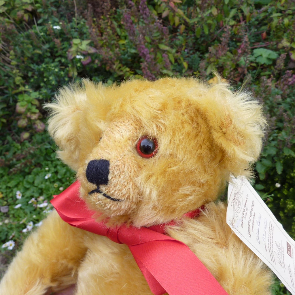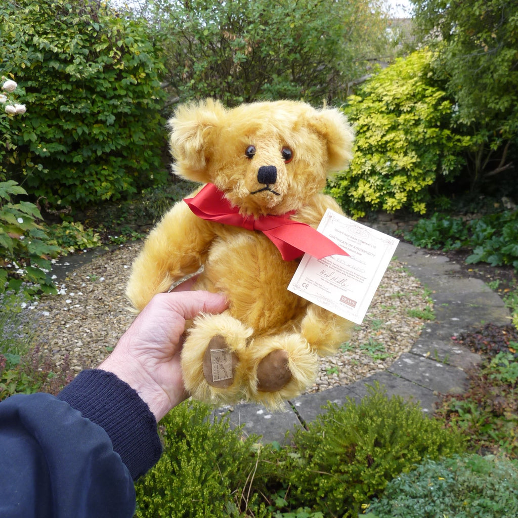 This softly pellet-filled bear is modelled on Bertie, a circa 1938 formerly in the museum in Witney. Made of long pile gold mohair, he has amber and black safety eyes and faux suede paw pads. This very tactile bear, number 197 of the edition, is as new with certificate.