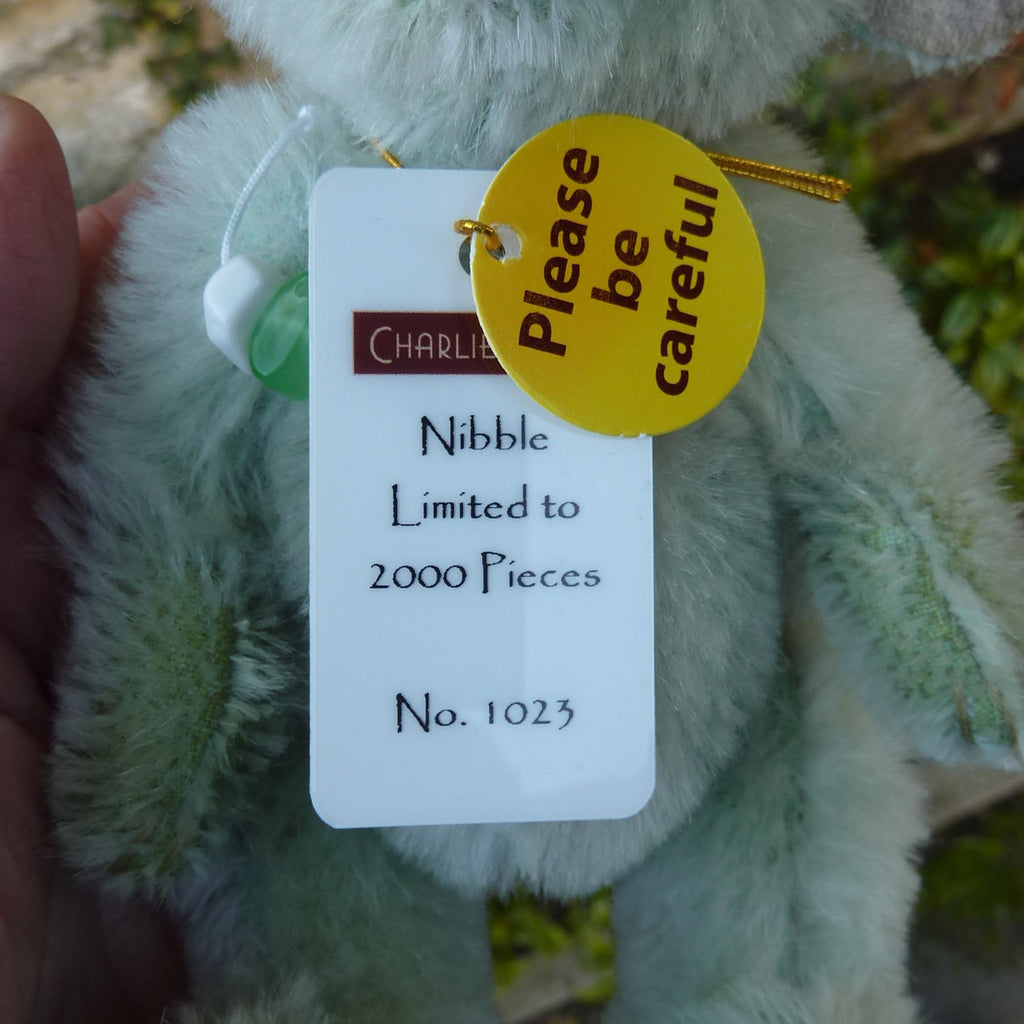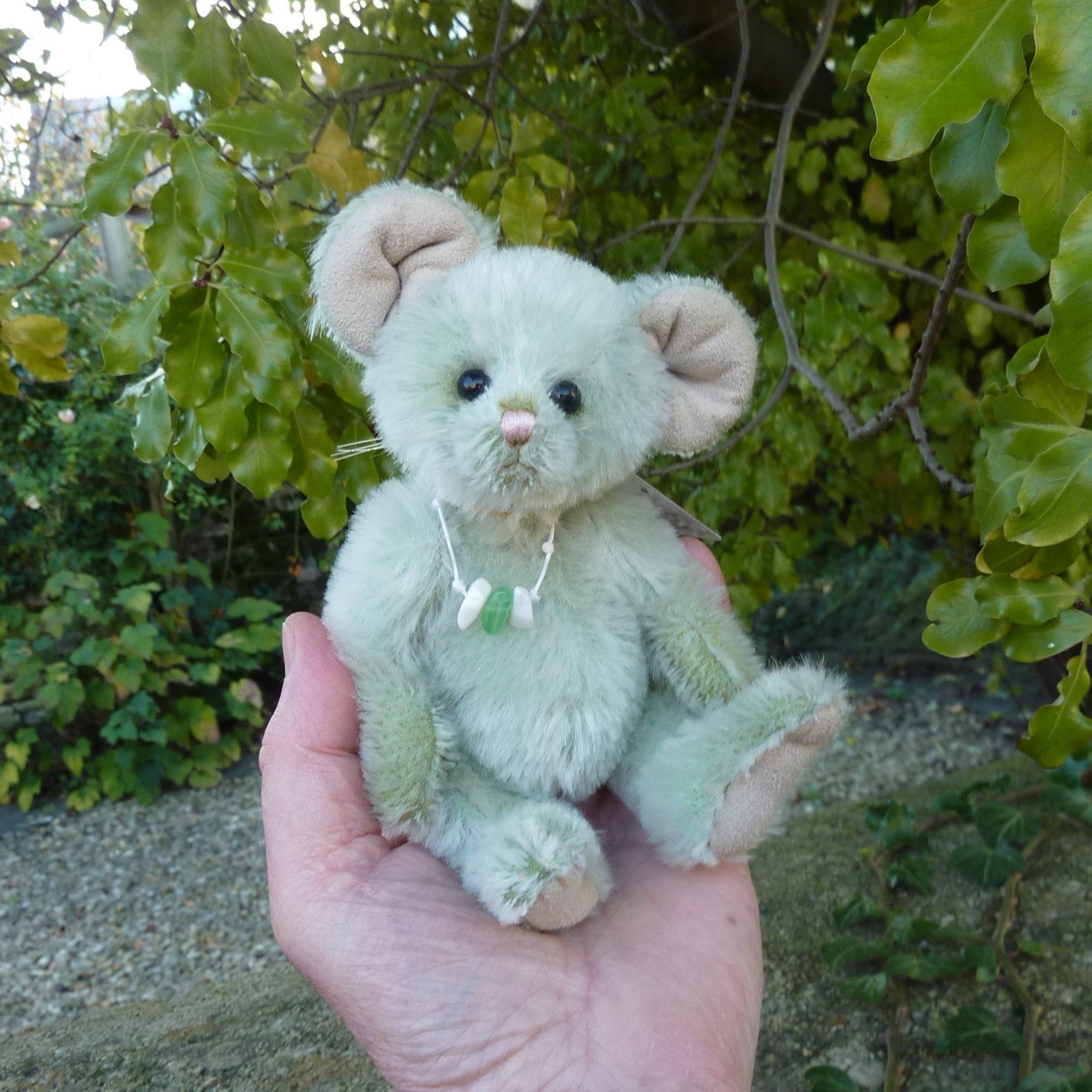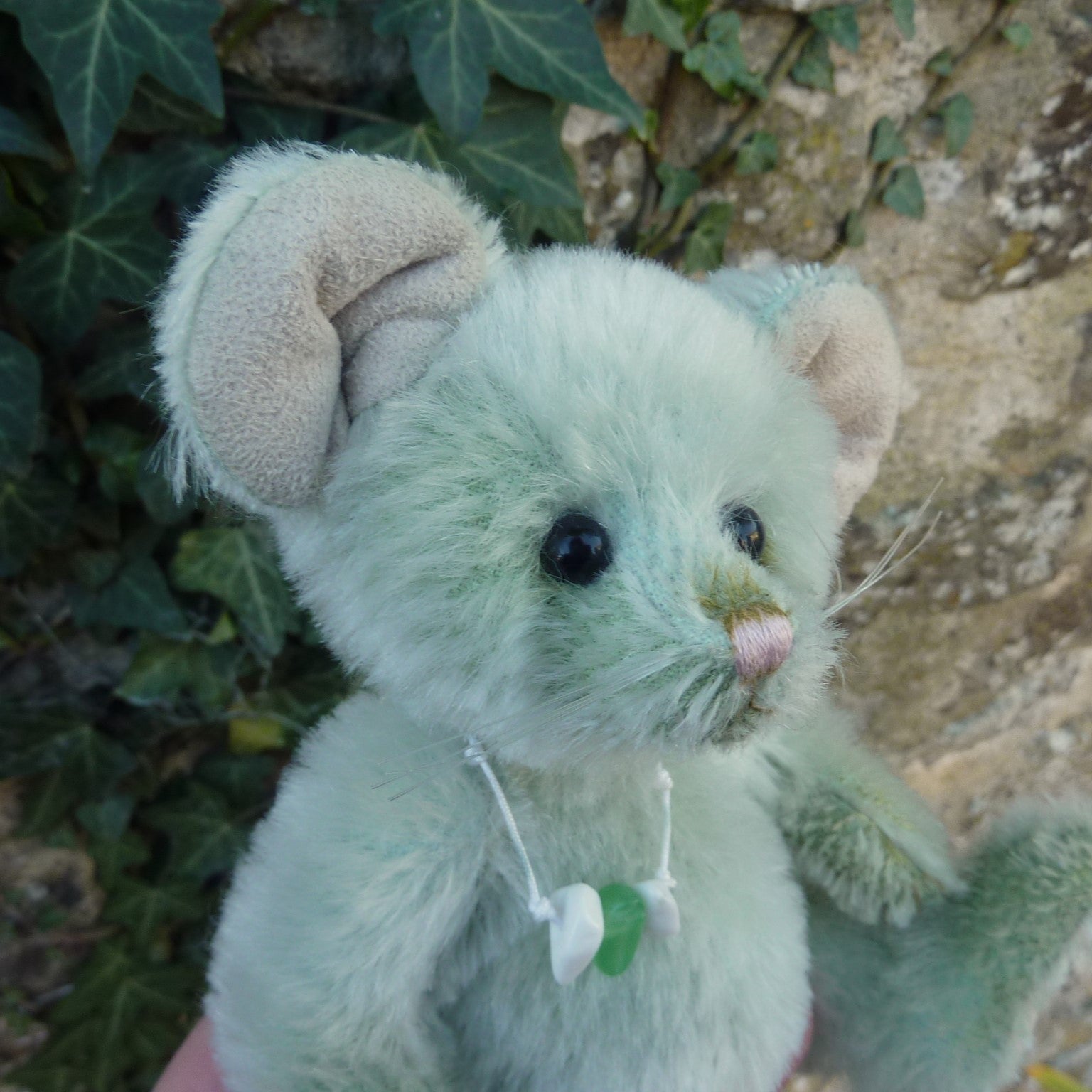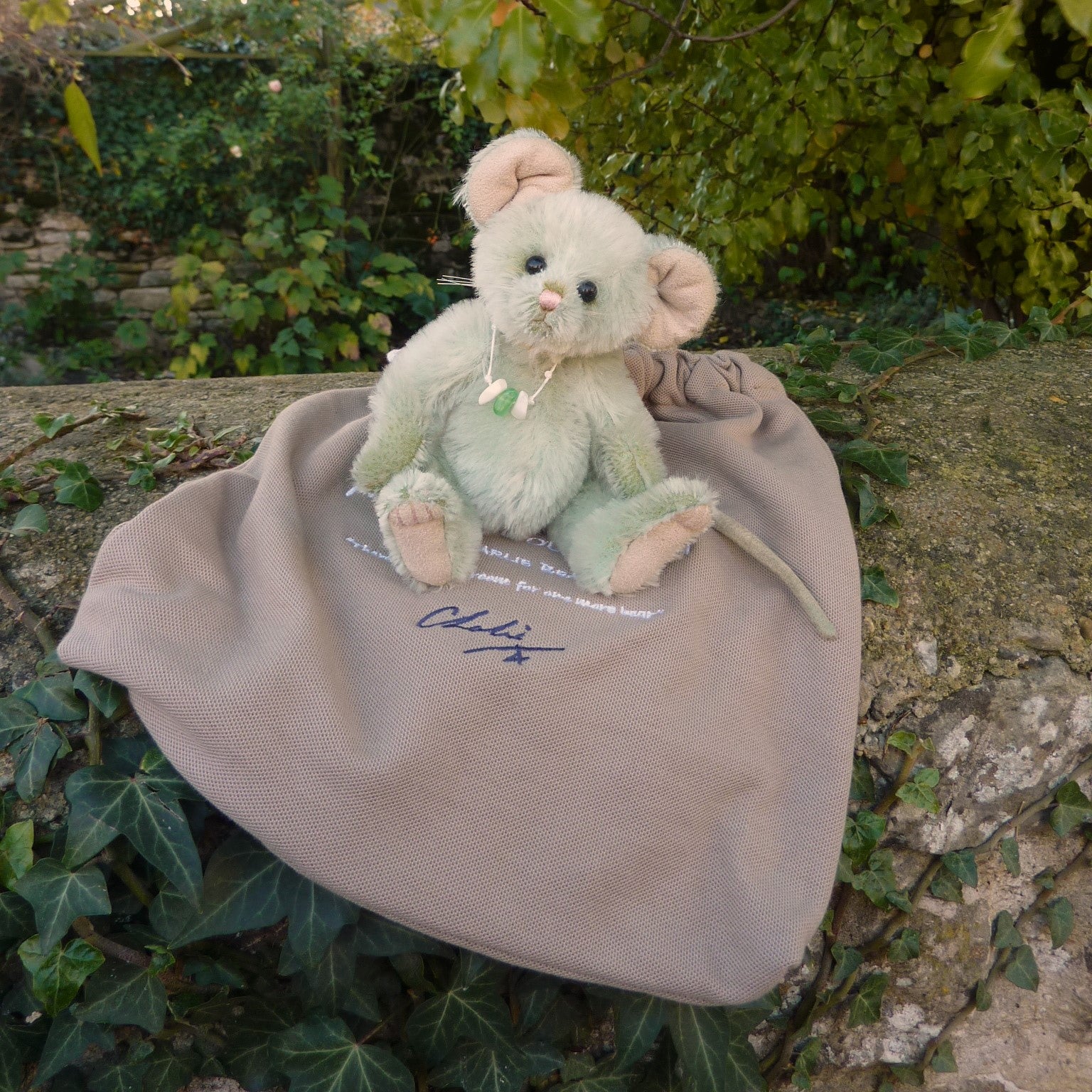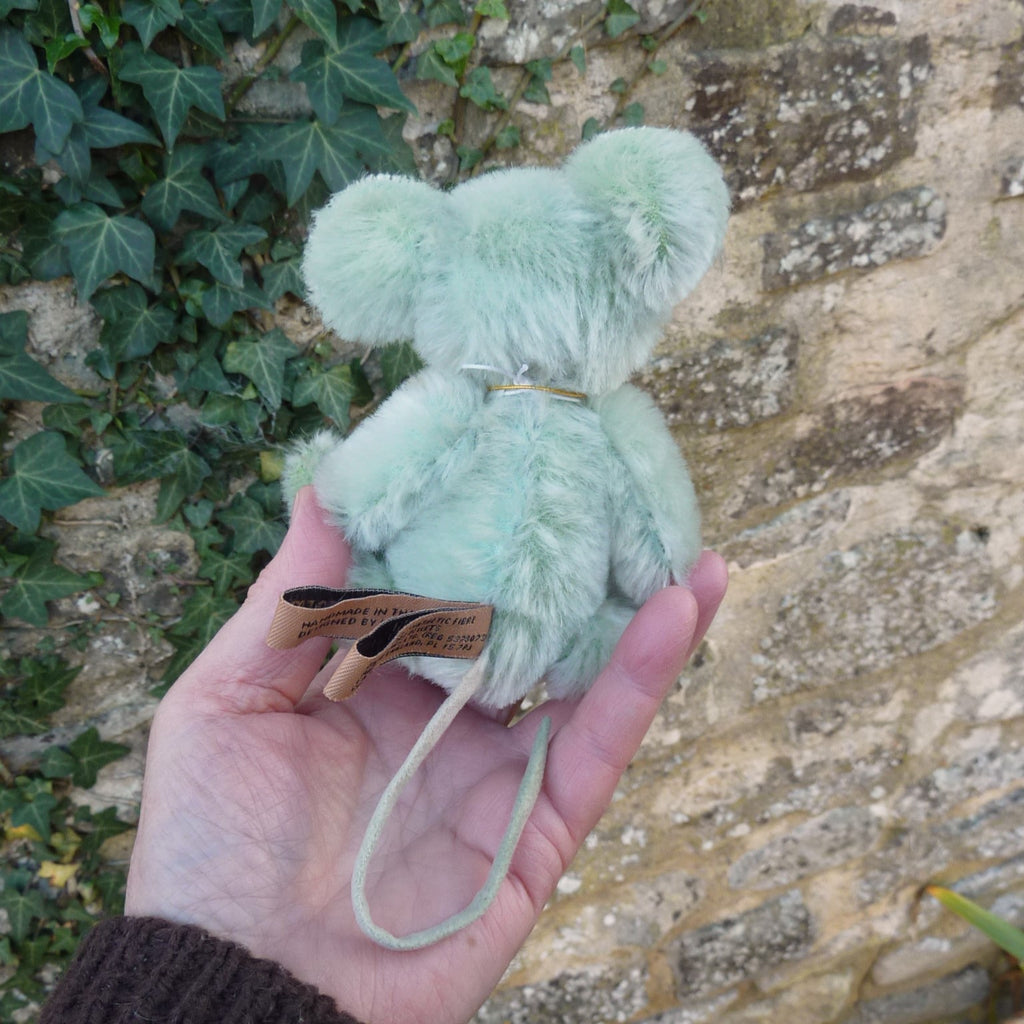 This delightful mouse is made of fresh, pale green mohair with shiny black button eyes, faux suede inner ears and paw pads and a felt tail. Designed by Isabelle Lee and Charlie Morris, she has a pink stitched nose and mouth and long whiskers. Number 1023 of the edition, Nibble comes with a Minimo Collection drawstring bag.