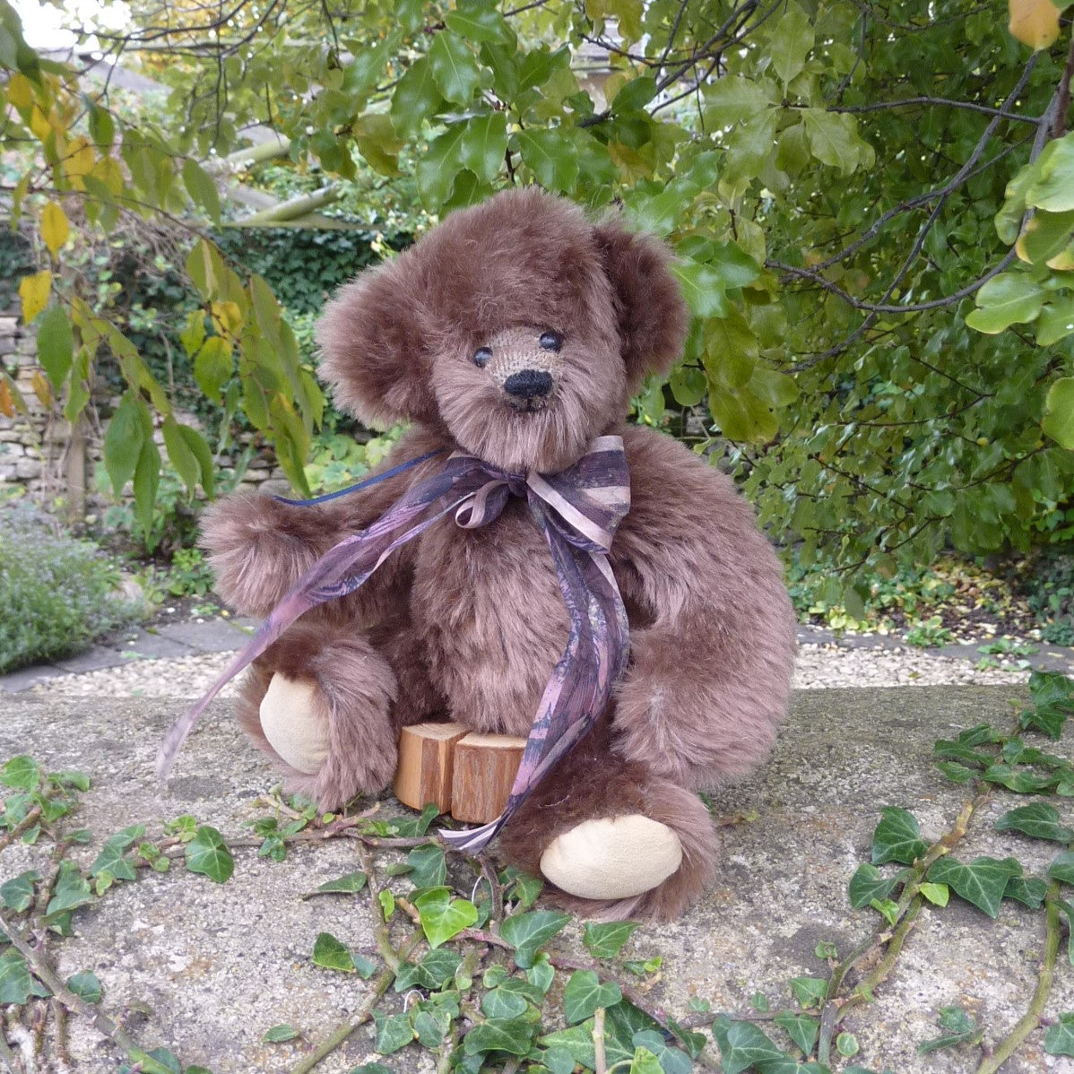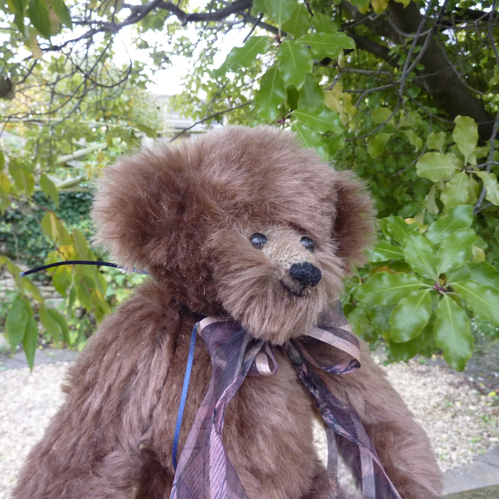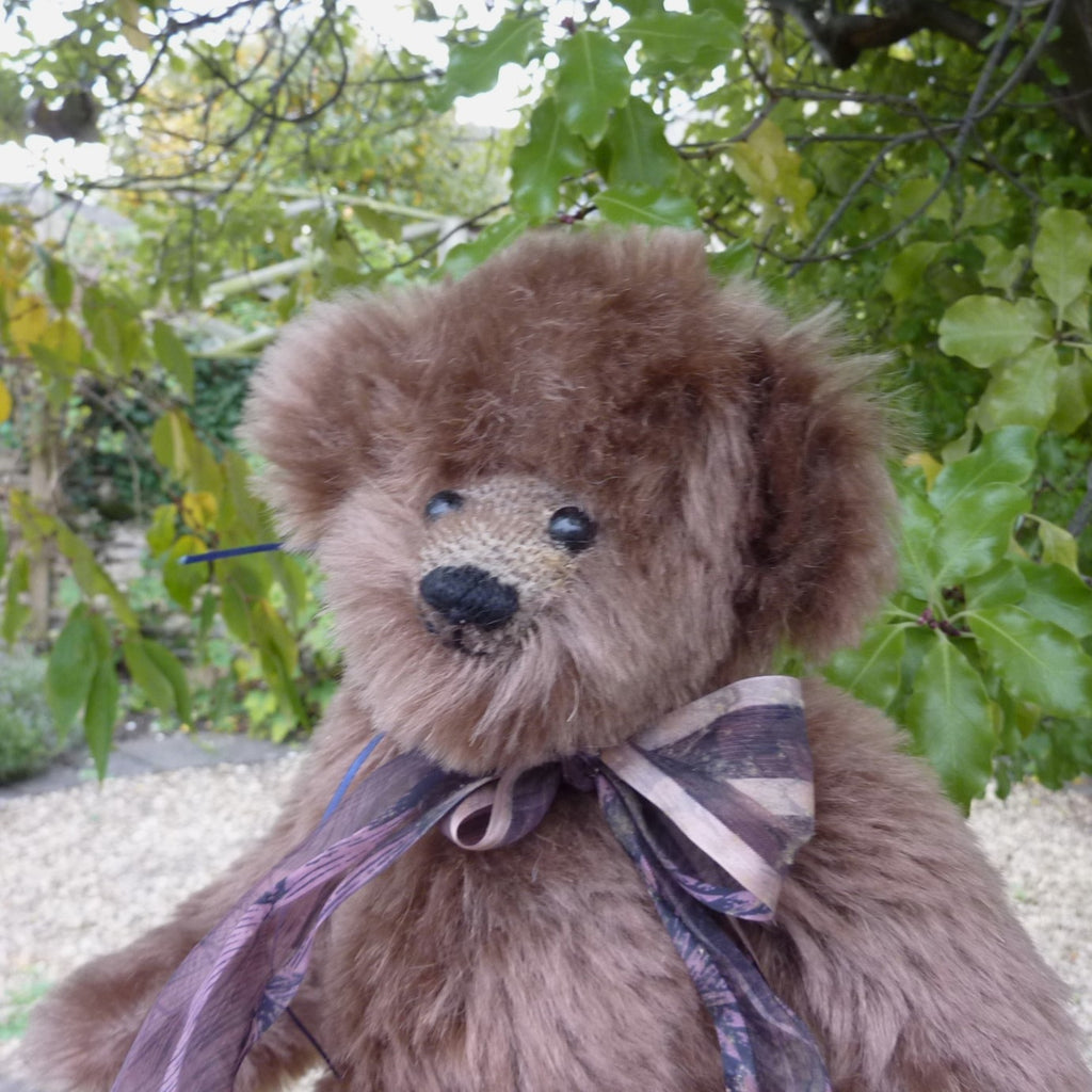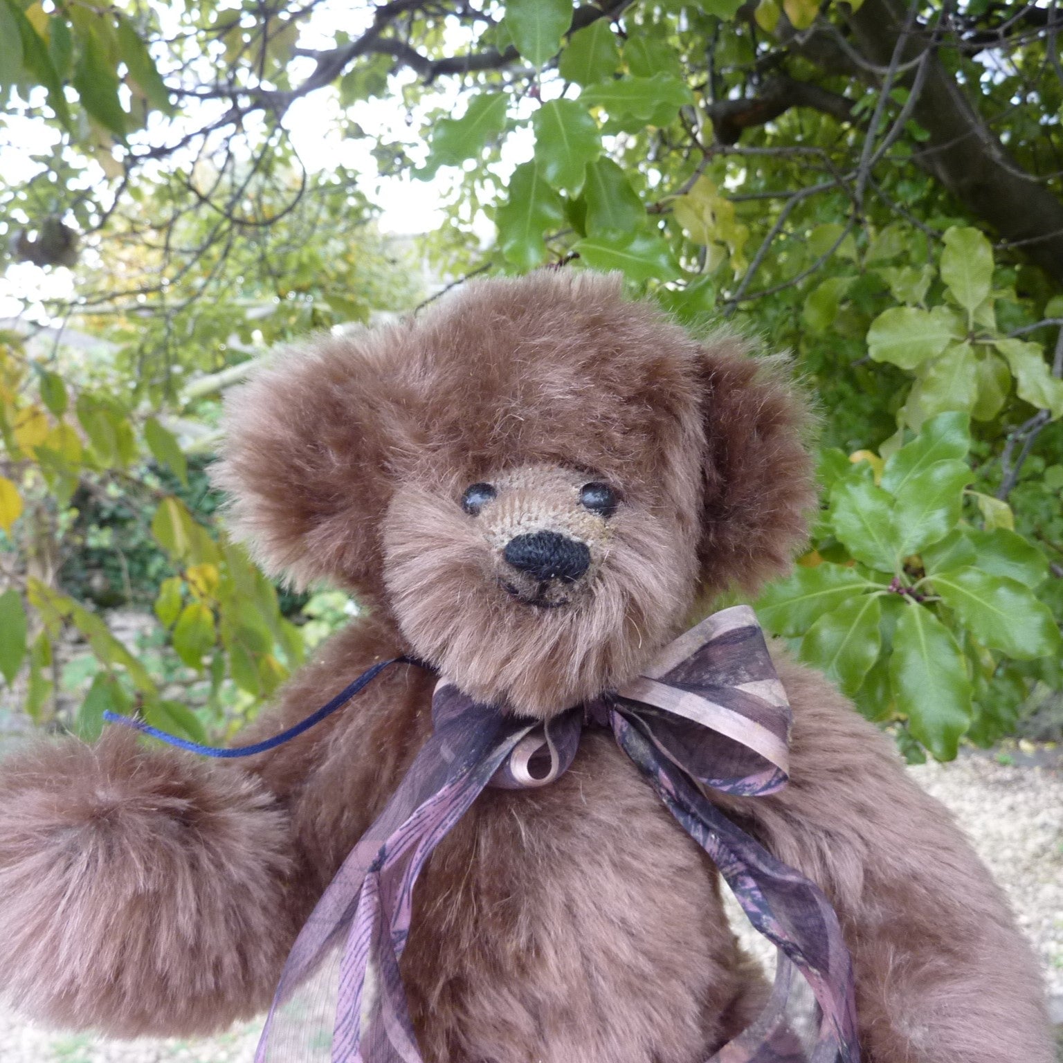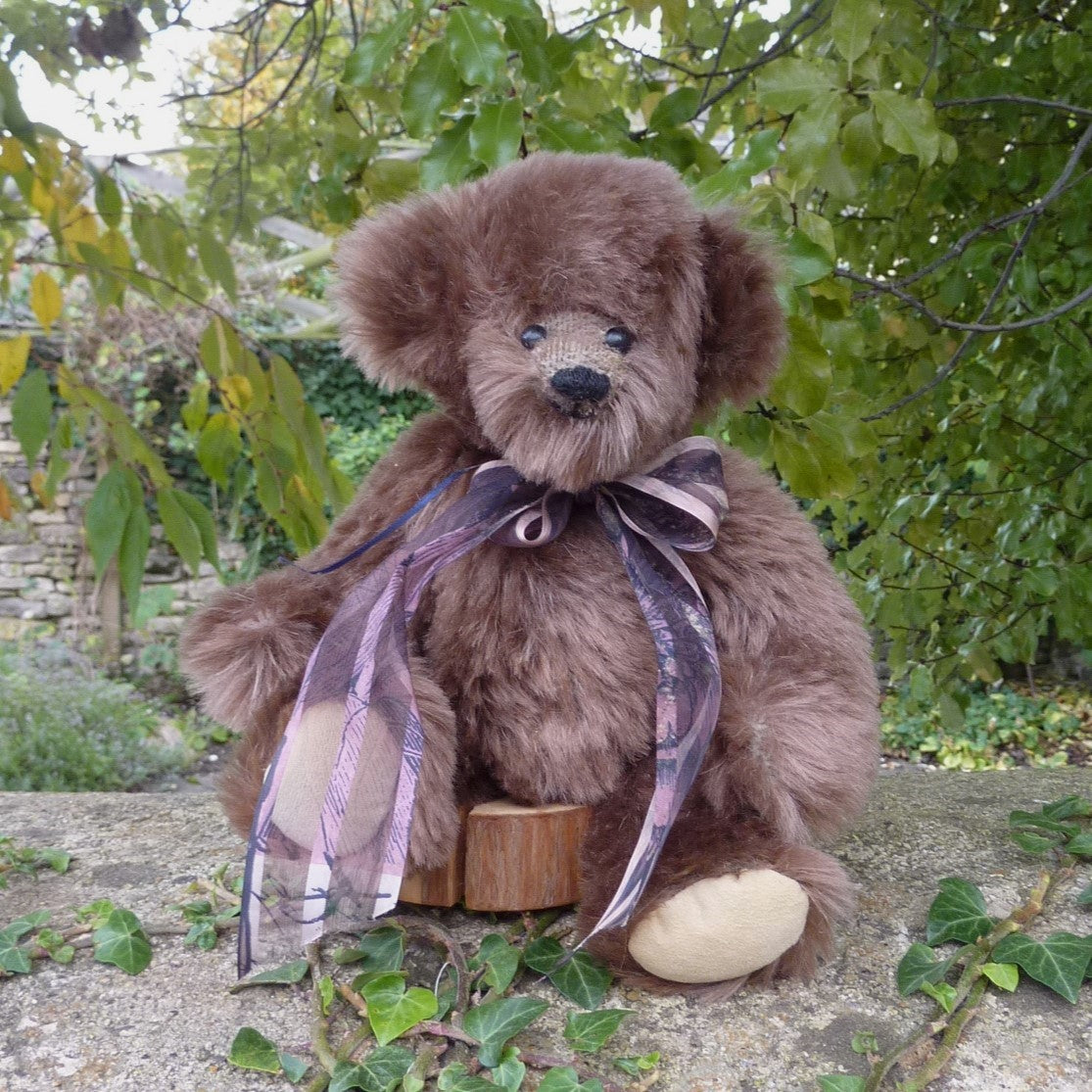 Medium-sized, this characterful bear is made of soft and dense, long pile, purple-tinted brown mohair with black glass eyes and faux suede foot pads. Softly filled and weighted with steel shot, his certificate is slightly aged but the bear himself is in excellent condition.