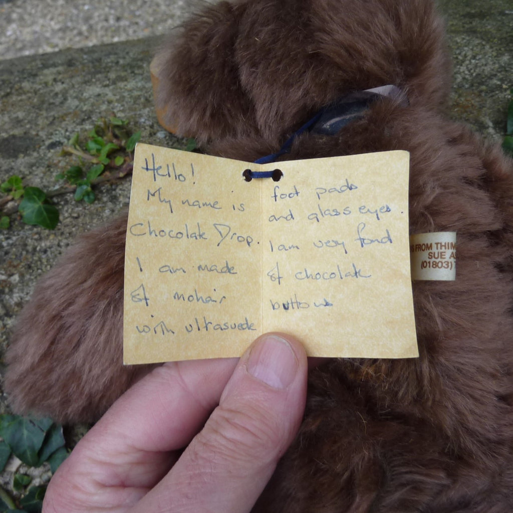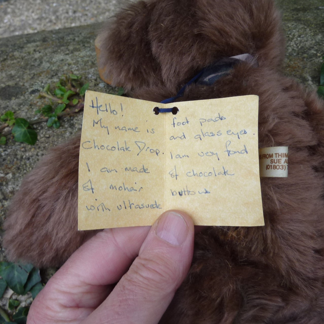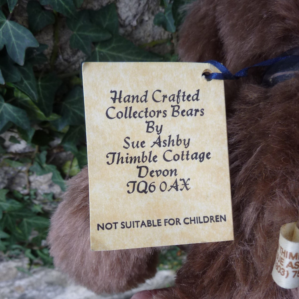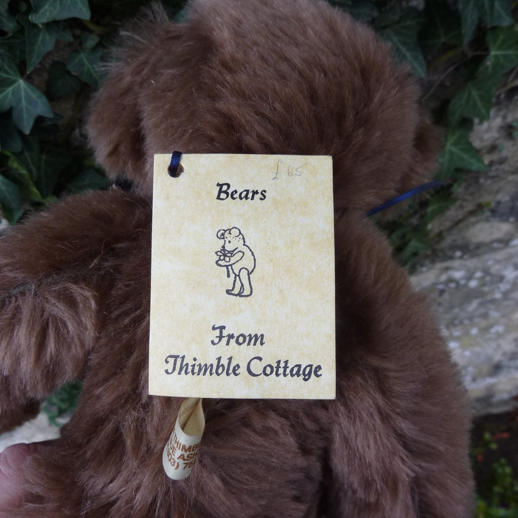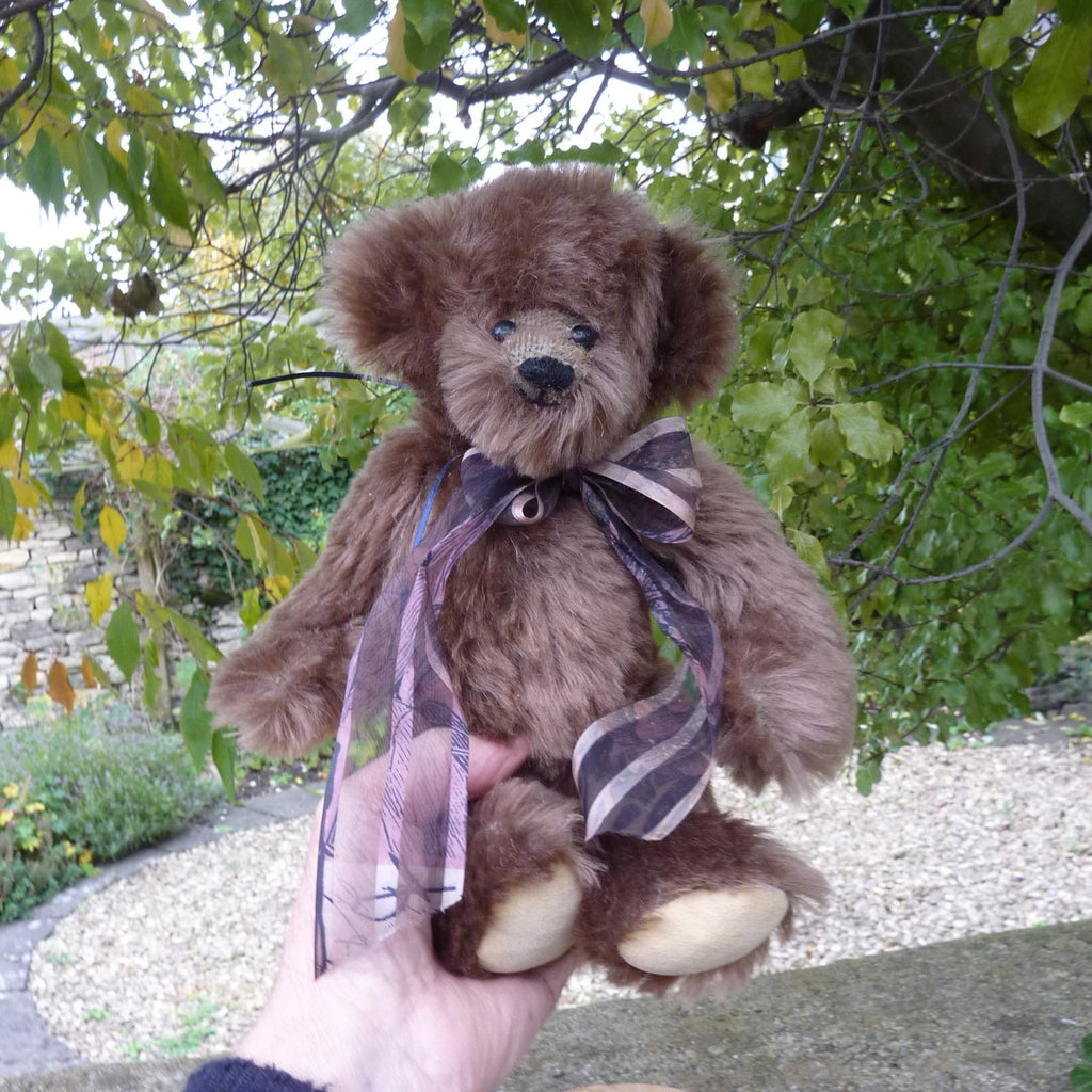 Medium-sized, this characterful bear is made of soft and dense, long pile, purple-tinted brown mohair with black glass eyes and faux suede foot pads. Softly filled and weighted with steel shot, his certificate is slightly aged but the bear himself is in excellent condition.