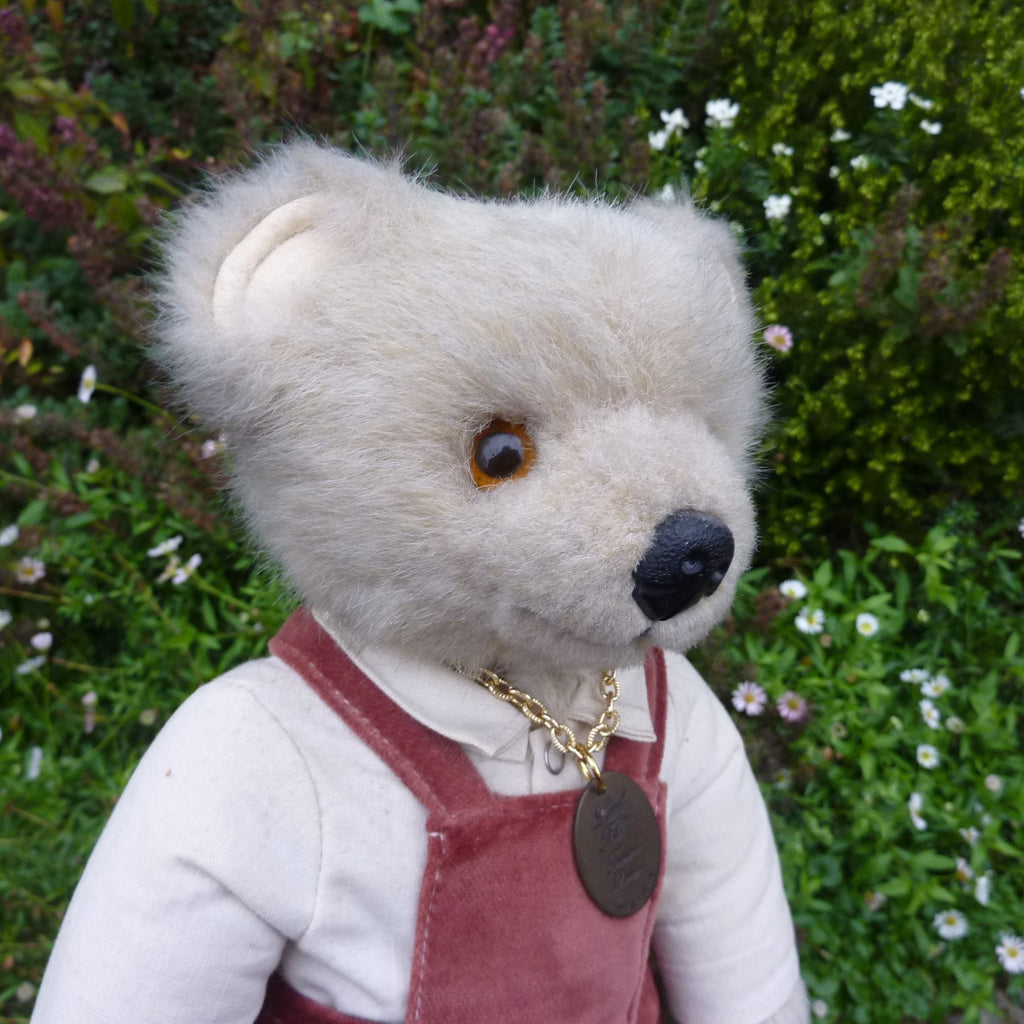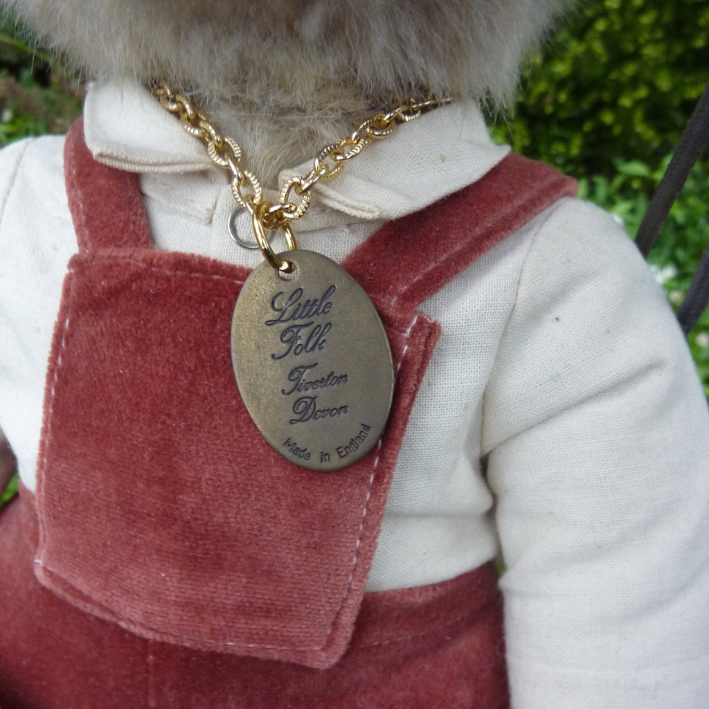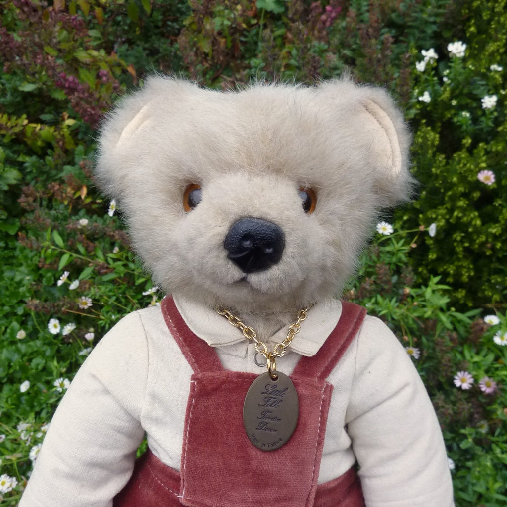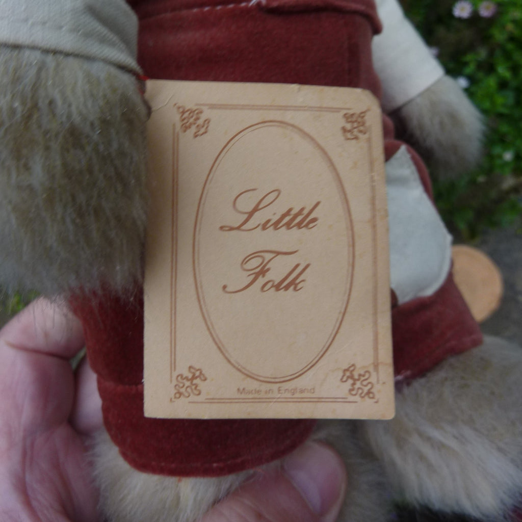 This iconic Little Folk bear is made of soft and dense, high quality, oatmeal, manmade plush with black plastic eyes, a moulded plastic nose and faux suede paw pads. He wears removable velvet rompers with a cream cotton patch, matching his cotton shirt. The label is slightly aged and written on (see photo) but the bear is in very good condition.