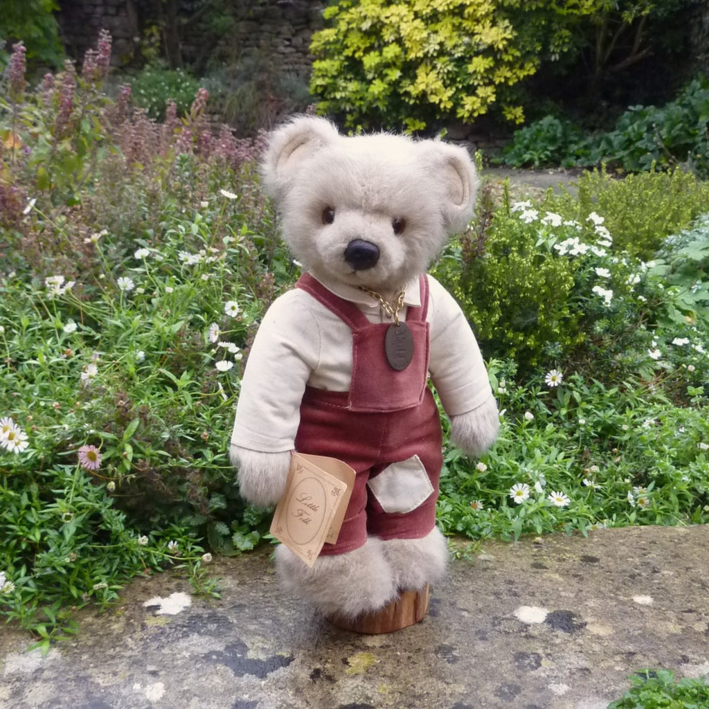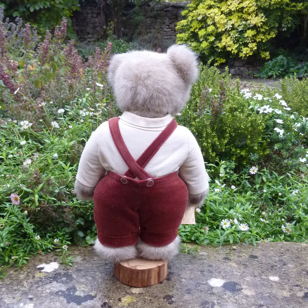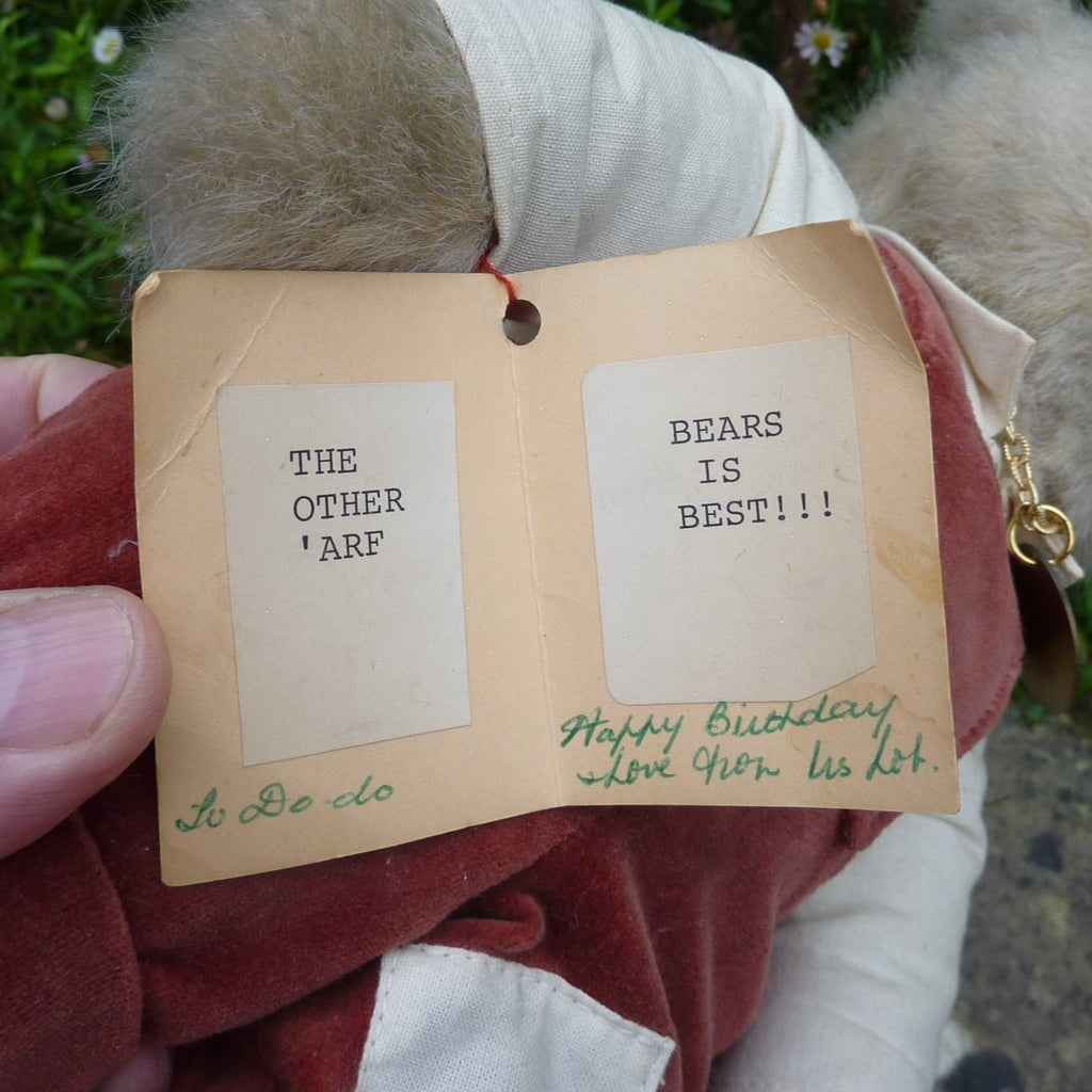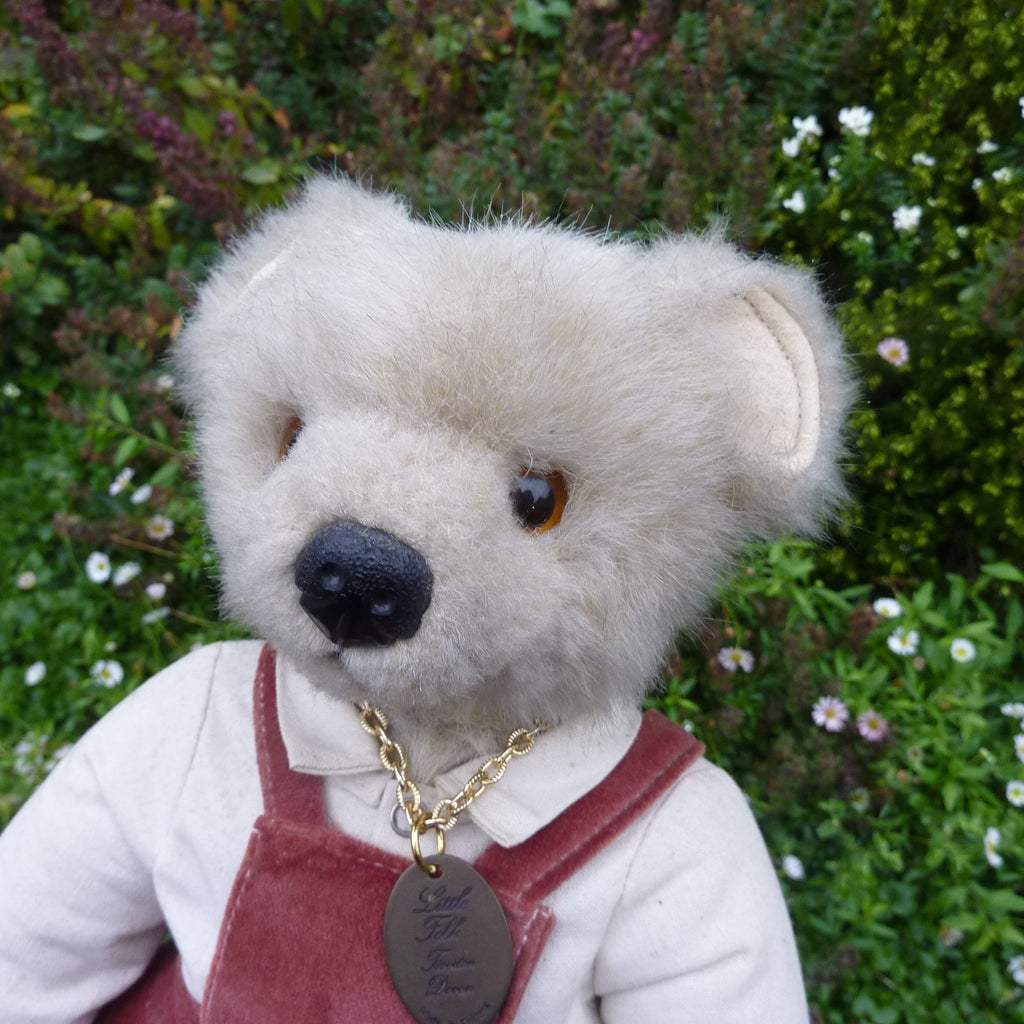 This iconic Little Folk bear is made of soft and dense, high quality, oatmeal, manmade plush with black plastic eyes, a moulded plastic nose and faux suede paw pads. He wears removable velvet rompers with a cream cotton patch, matching his cotton shirt. The label is slightly aged and written on (see photo) but the bear is in very good condition.