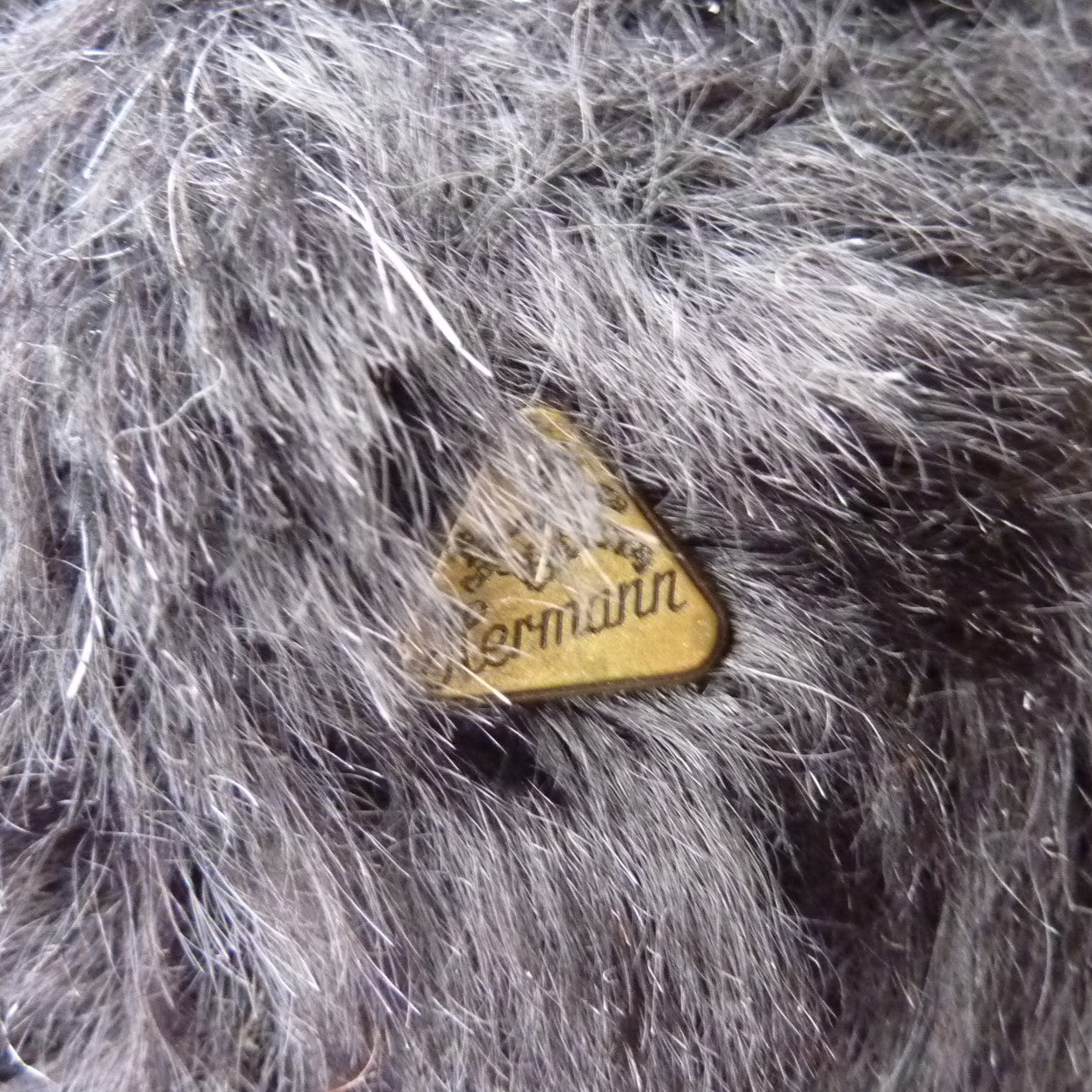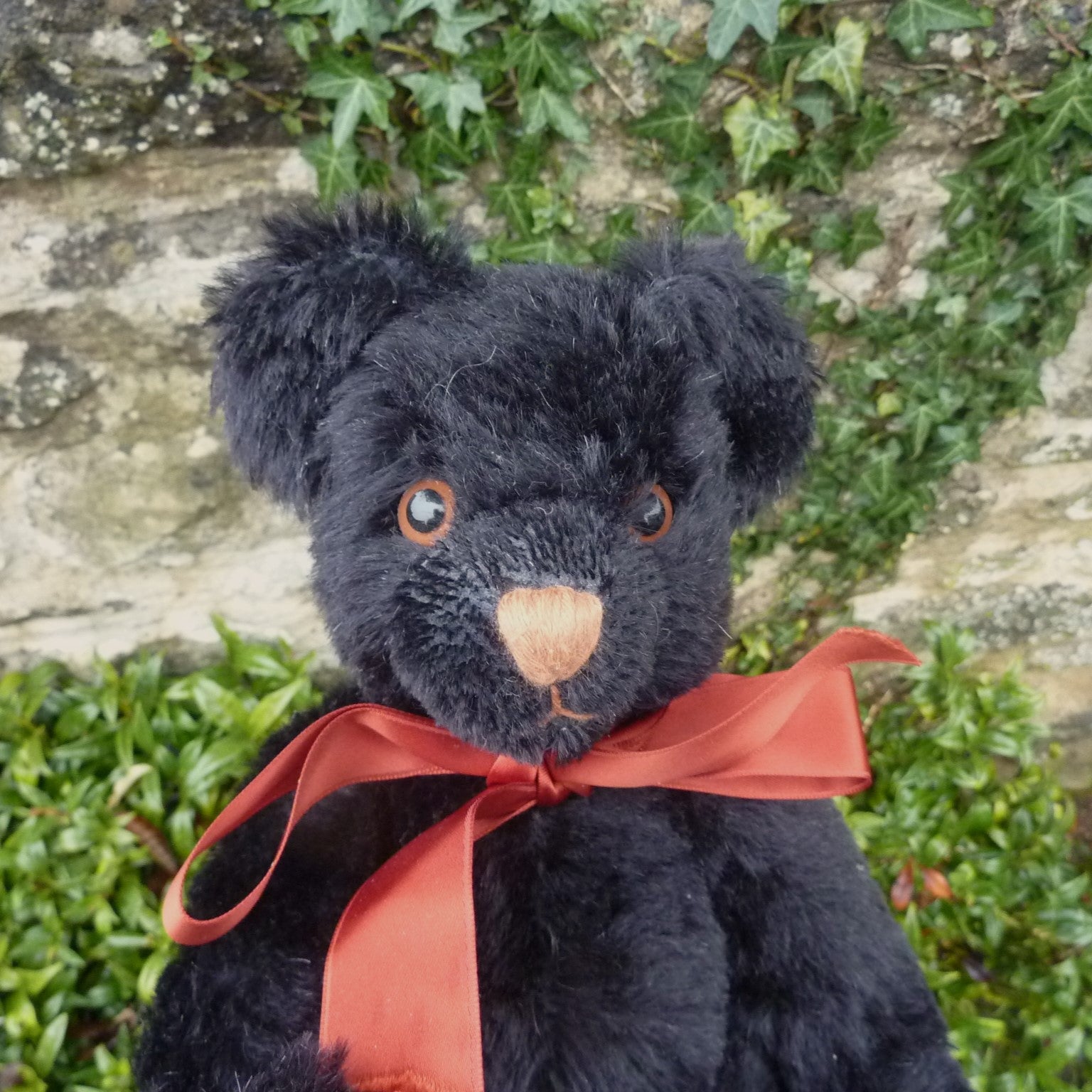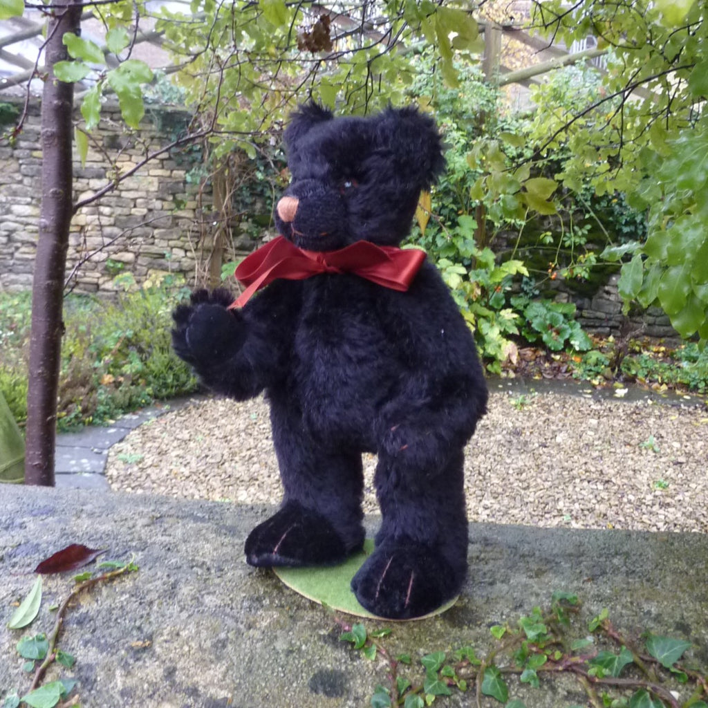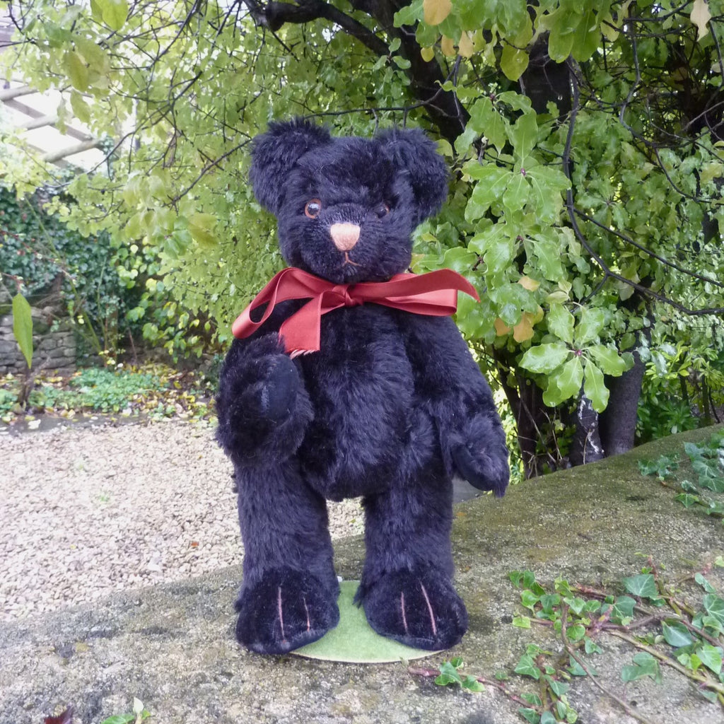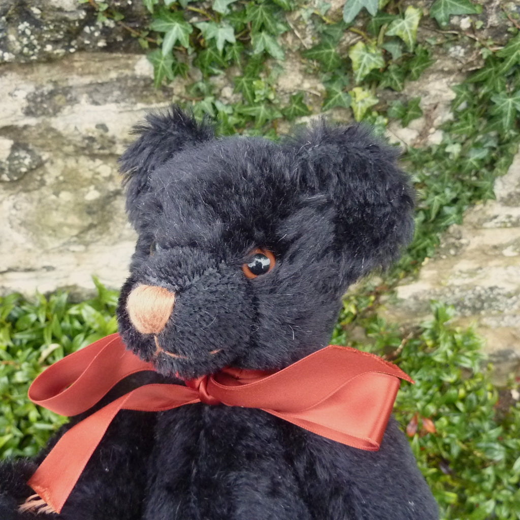 This medium-sized, bear is made of dense and distressed, black mohair with brown and black glass eyes and velveteen paw pads.