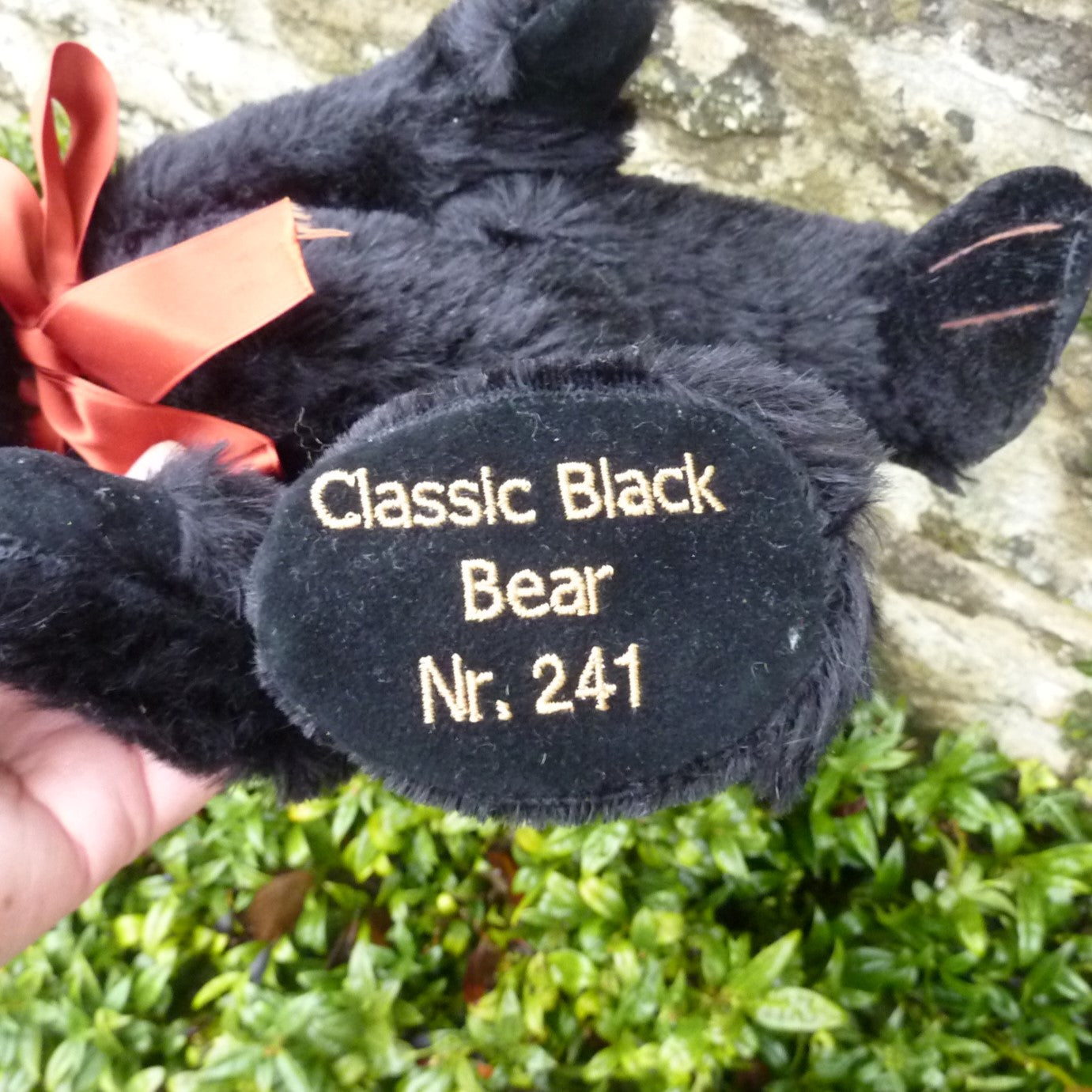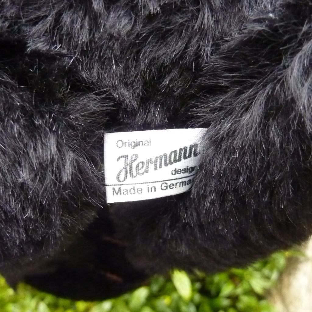 Firmly filled with wood shavings, he wears a satin neck ribbon. He growls when tipped backwards. His right foot is embroidered with his name and edition number (241). No certificate but, otherwise, as new with a Herrmann label on back of his left arm and brass Hermann stud on the back of his head. If bought by someone outside the UK, there will be a GBP20 surcharge towards the airmail cost.