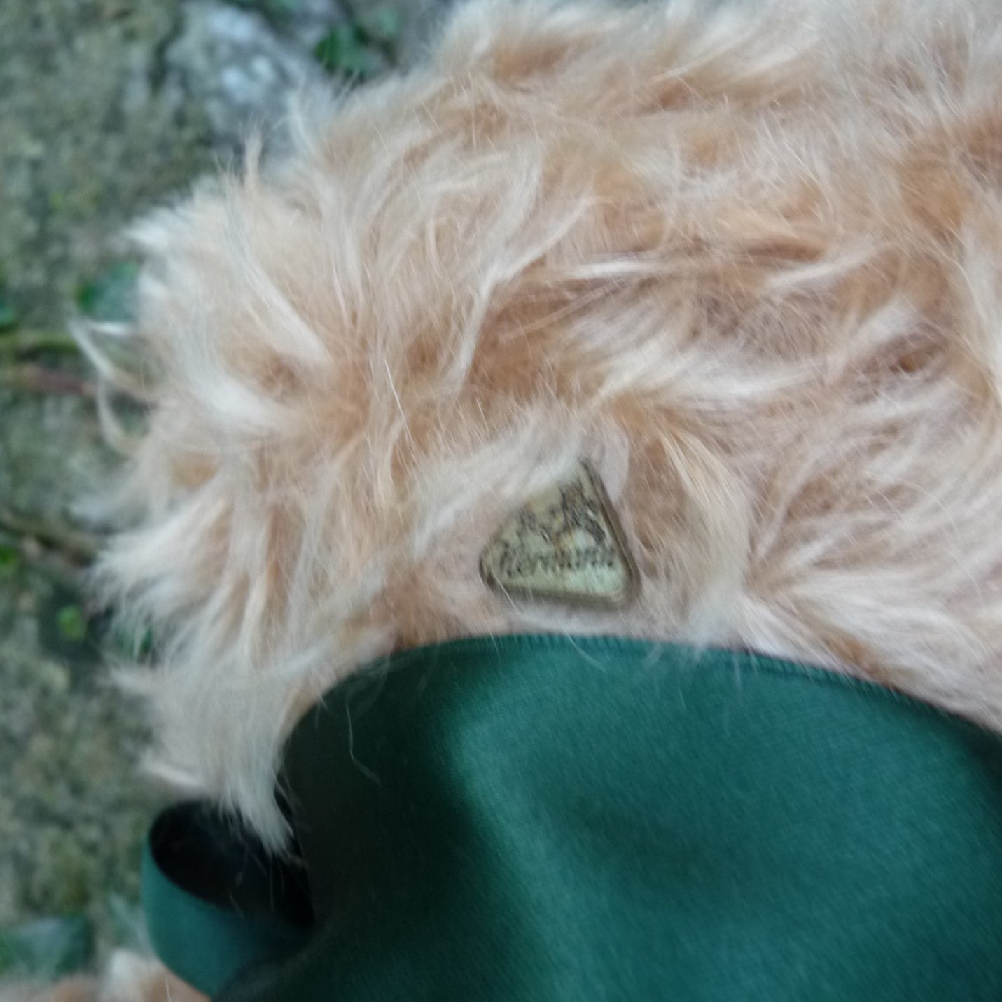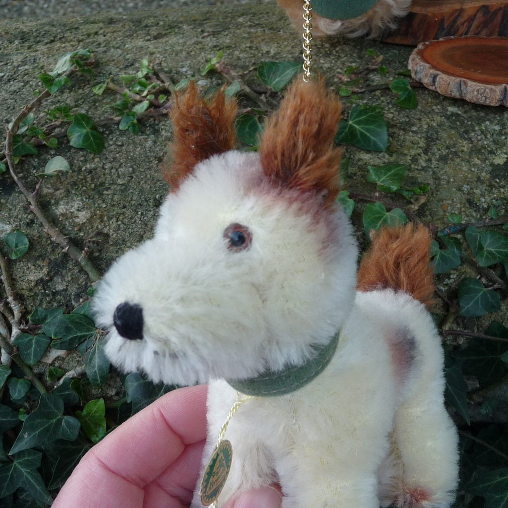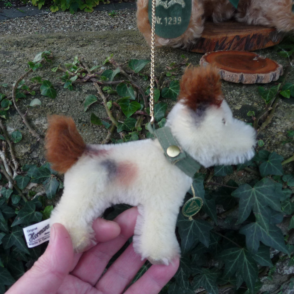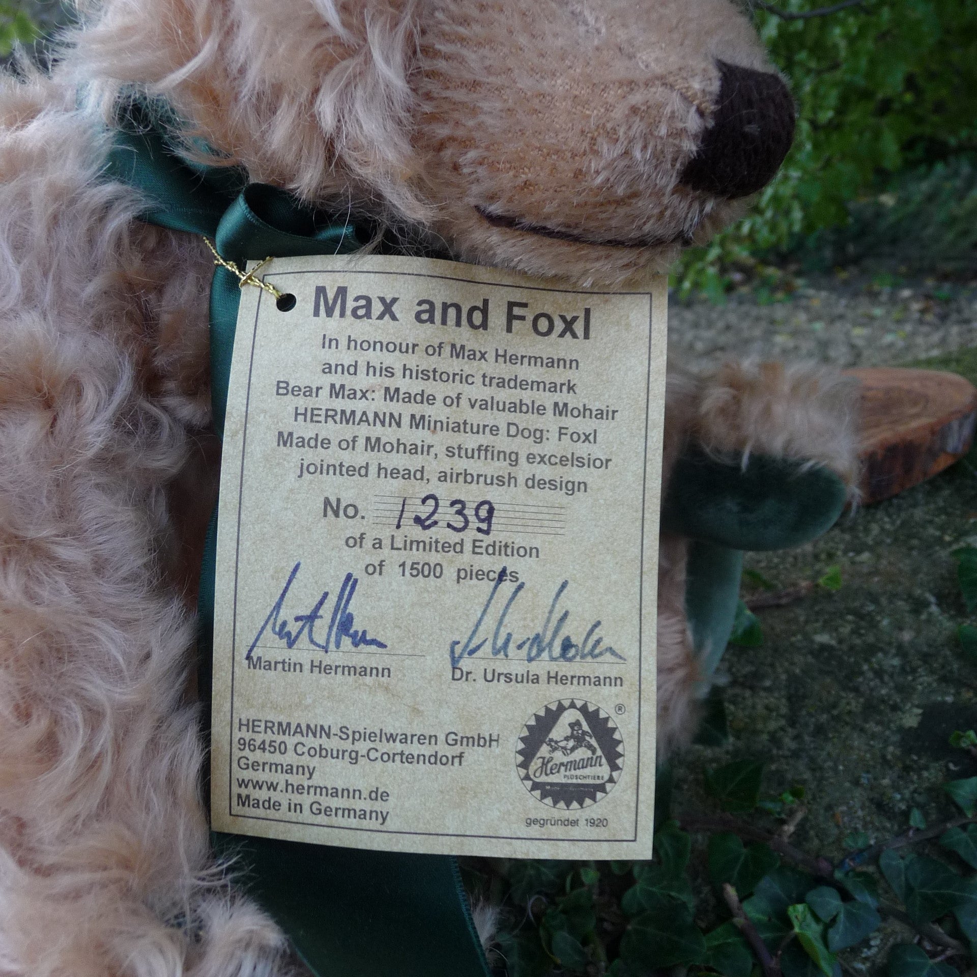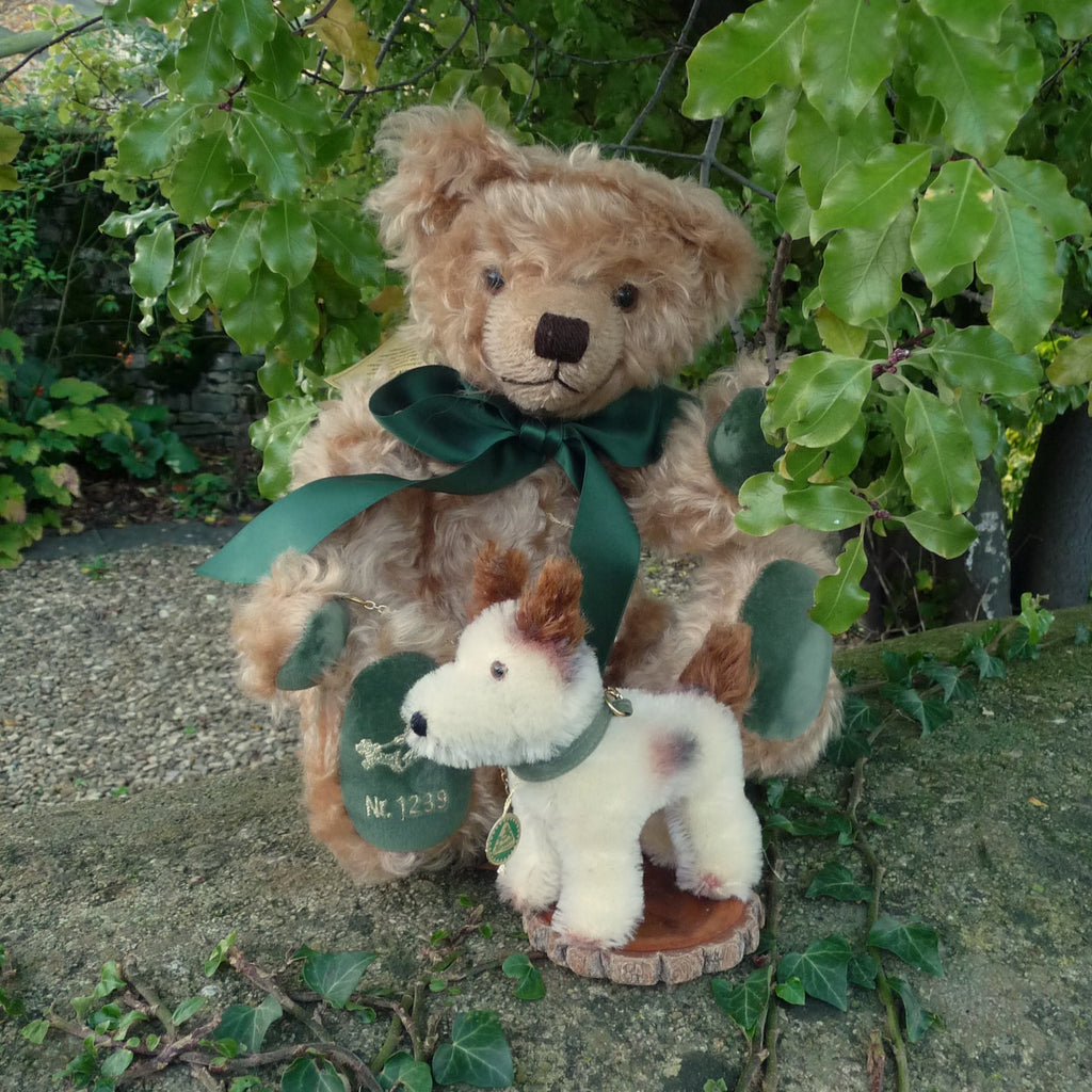 Max is a large, classic, East German-style bear made of distressed caramel mohair with brown and black glass eyes and velvet paw pads. Traditionally stuffed with wood shavings, he wears a green satin neck ribbon. His right foot is embroidered with the trade mark and his edition number (1239). His non-jointed 14cm Fox Terrier is made off-white mohair with airbrushed markings. In excellent condition with certificate. (If bought by someone outside the UK, there will be a GBP20 surcharge towards the airmail cost.)