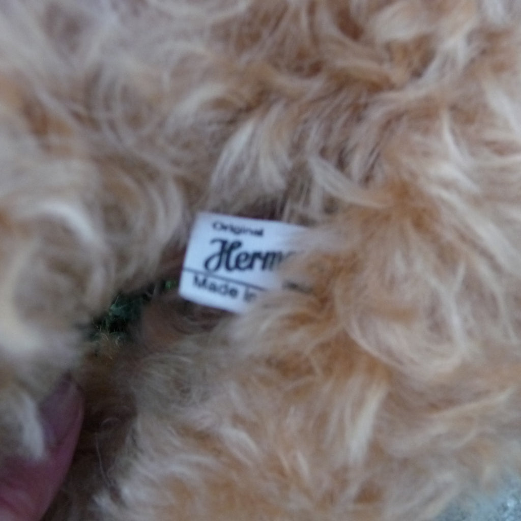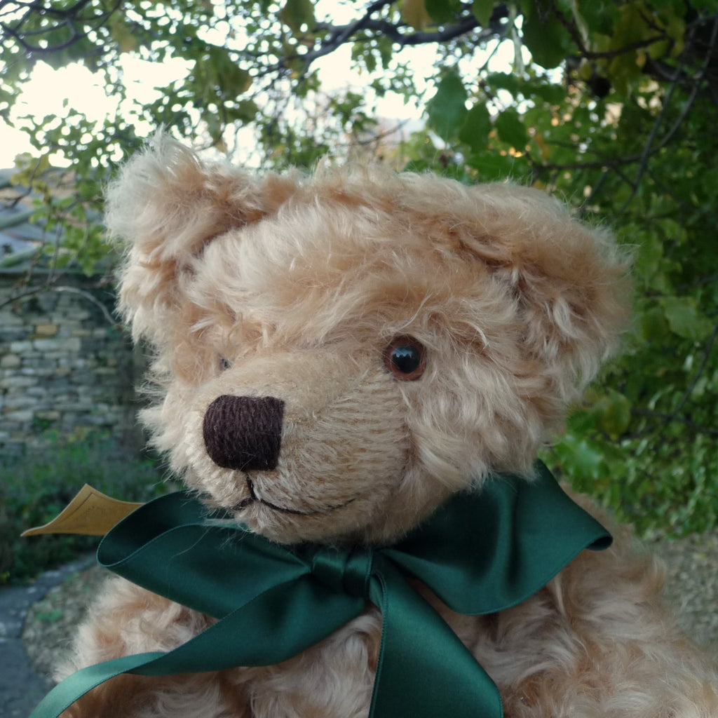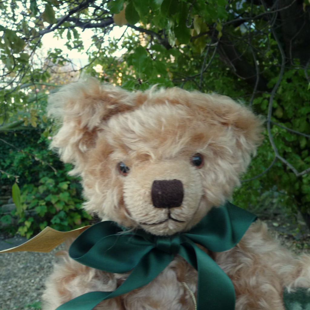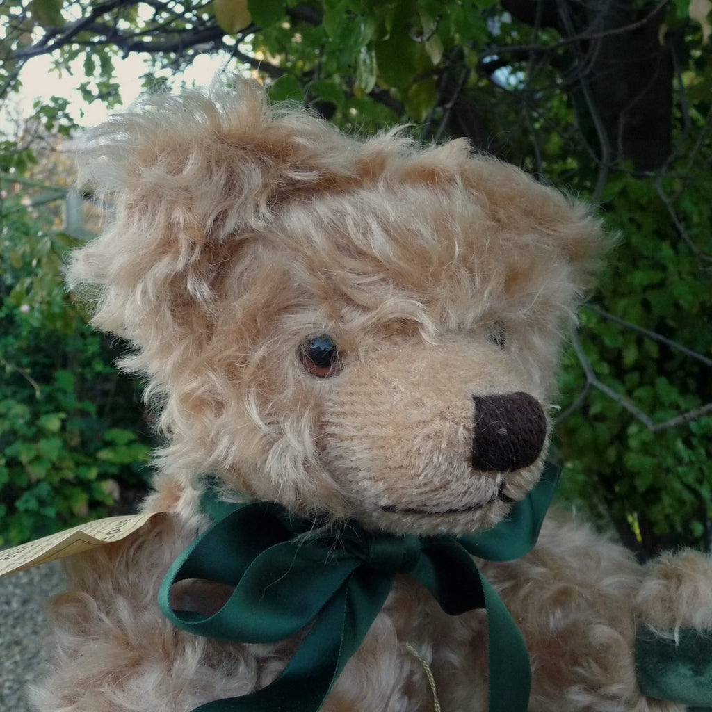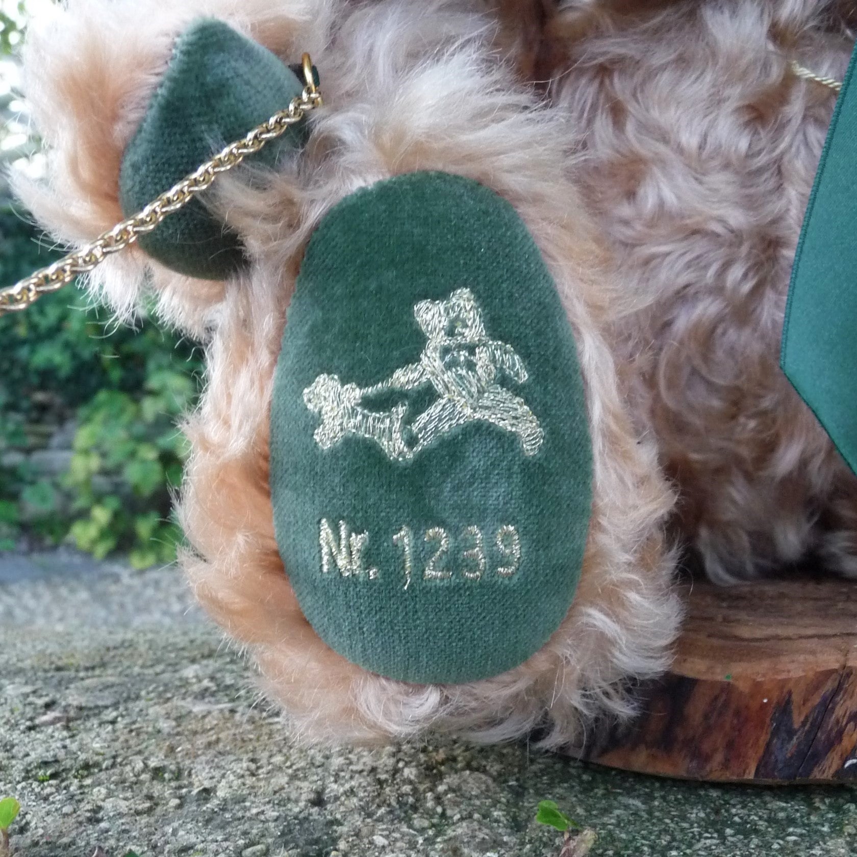 Max is a large, classic, East German-style bear made of distressed caramel mohair with brown and black glass eyes and velvet paw pads. Traditionally stuffed with wood shavings, he wears a green satin neck ribbon. His right foot is embroidered with the trade mark and his edition number (1239). His non-jointed 14cm Fox Terrier is made off-white mohair with airbrushed markings. In excellent condition with certificate. (If bought by someone outside the UK, there will be a GBP20 surcharge towards the airmail cost.)