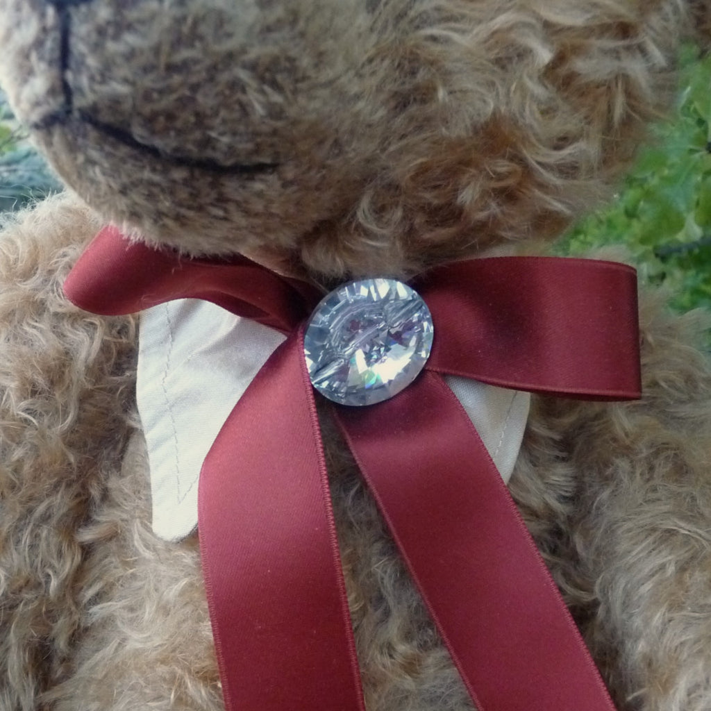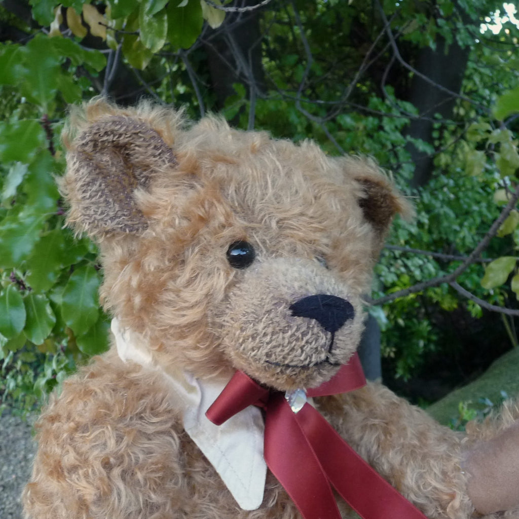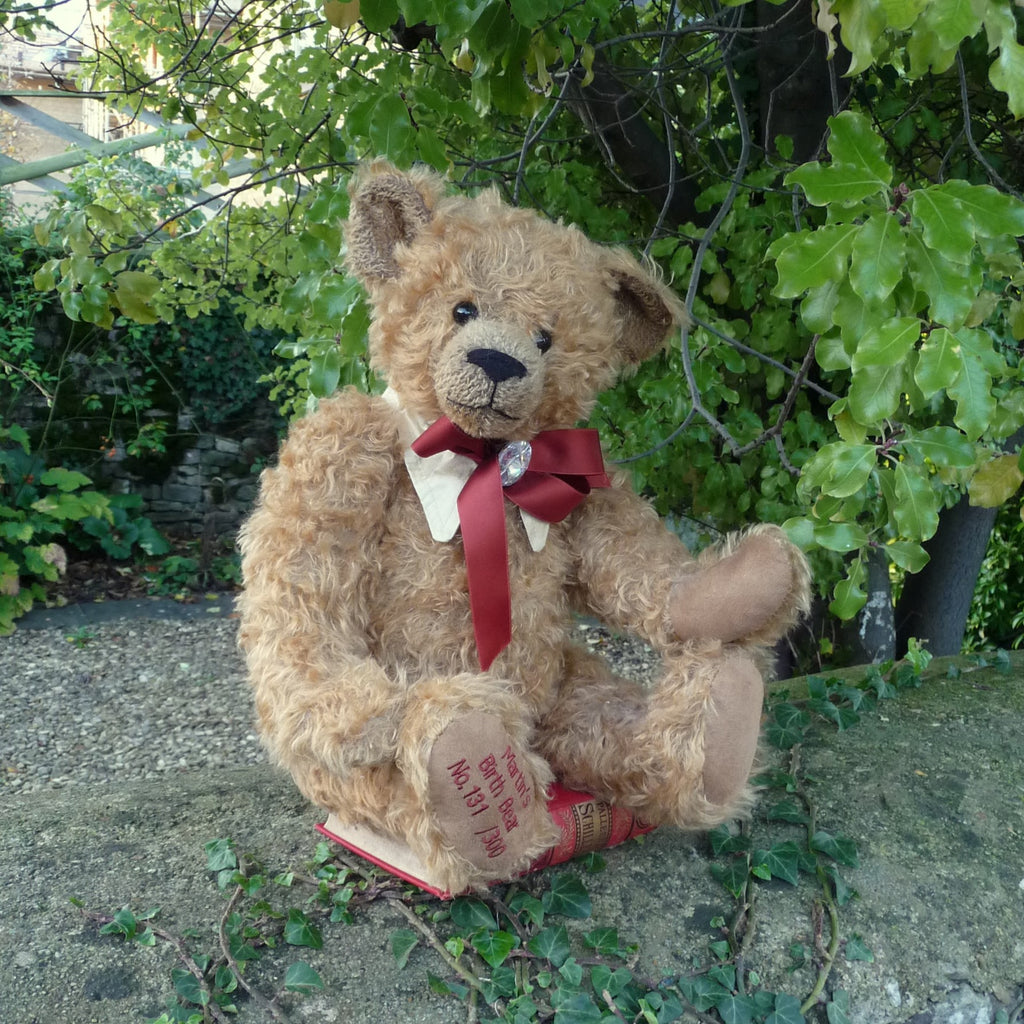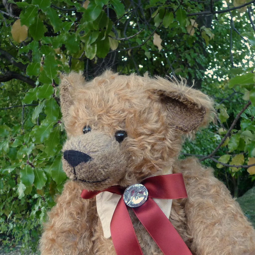 This large, traditional East German bear is named after Martin Hermann, co-owner of the company. Made of wavy and distressed, light brown mohair, he has large black glass eyes and faux suede paw pads. Traditionally filled with wood shavings, he wears a costume jewellery stone on his satin ribbon neck bow. He growls when tipped backwards.