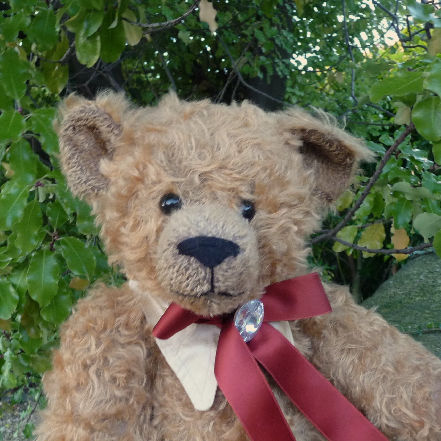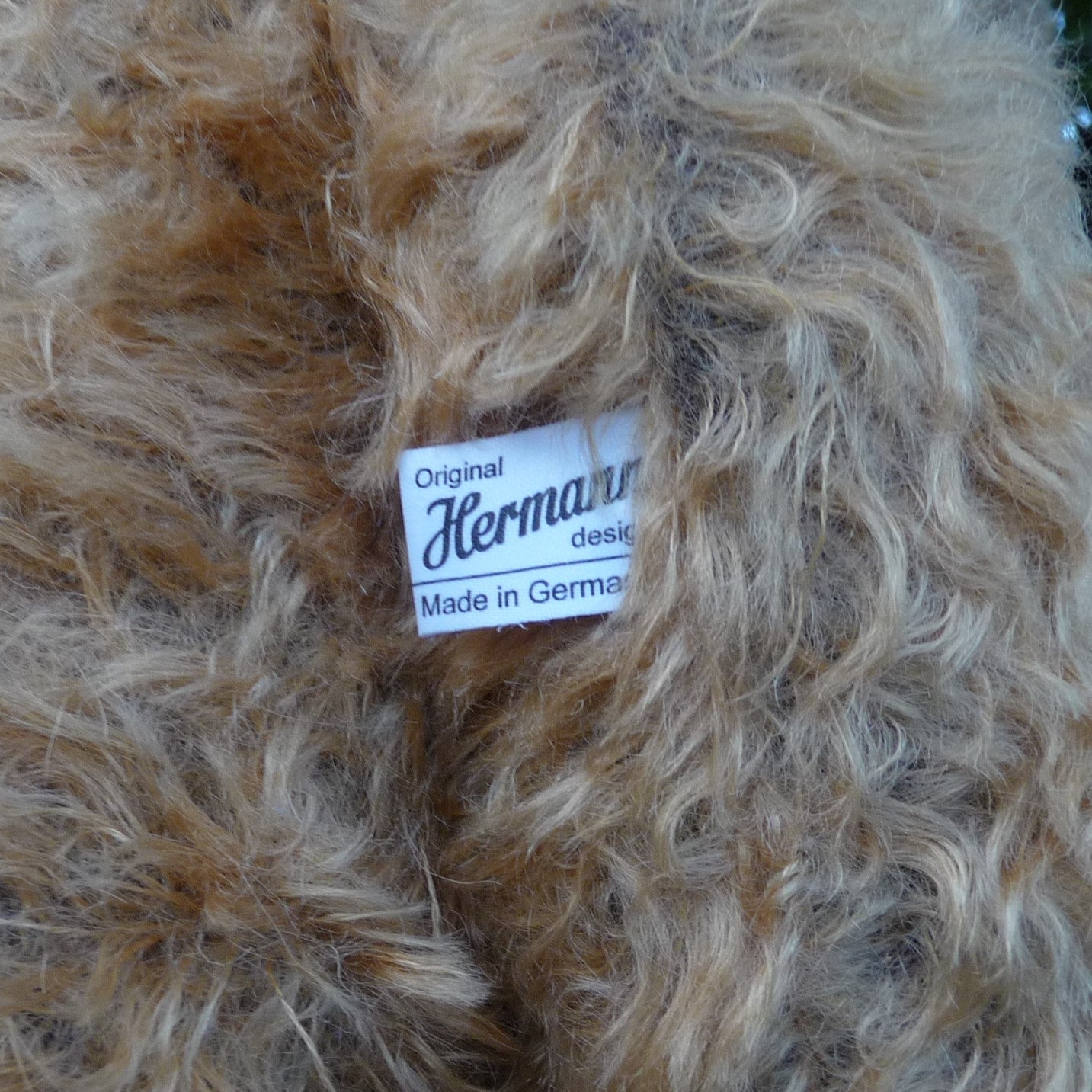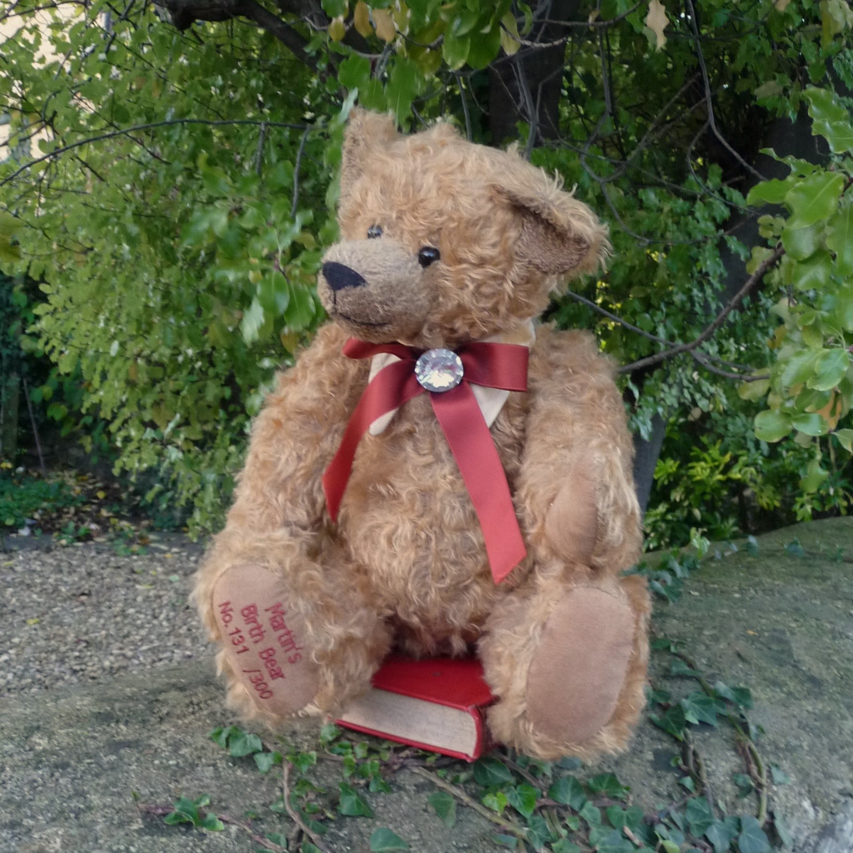 This large, traditional East German bear is named after Martin Hermann, co-owner of the company. Made of wavy and distressed, light brown mohair, he has large black glass eyes and faux suede paw pads. Traditionally filled with wood shavings, he wears a costume jewellery stone on his satin ribbon neck bow. He growls when tipped backwards.