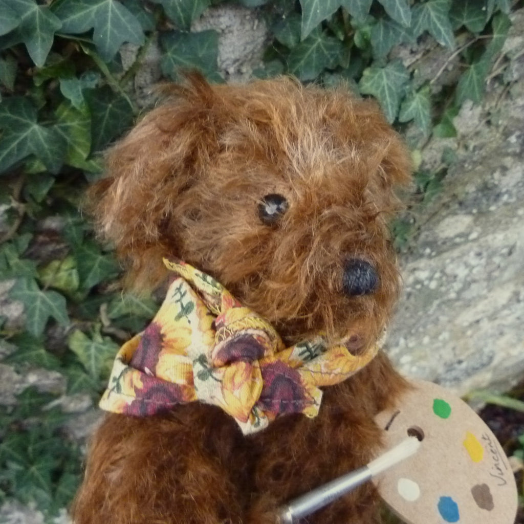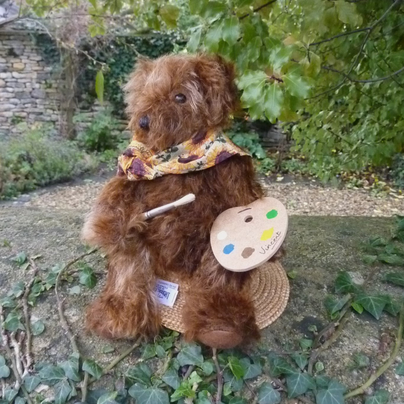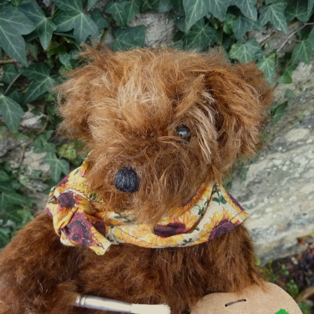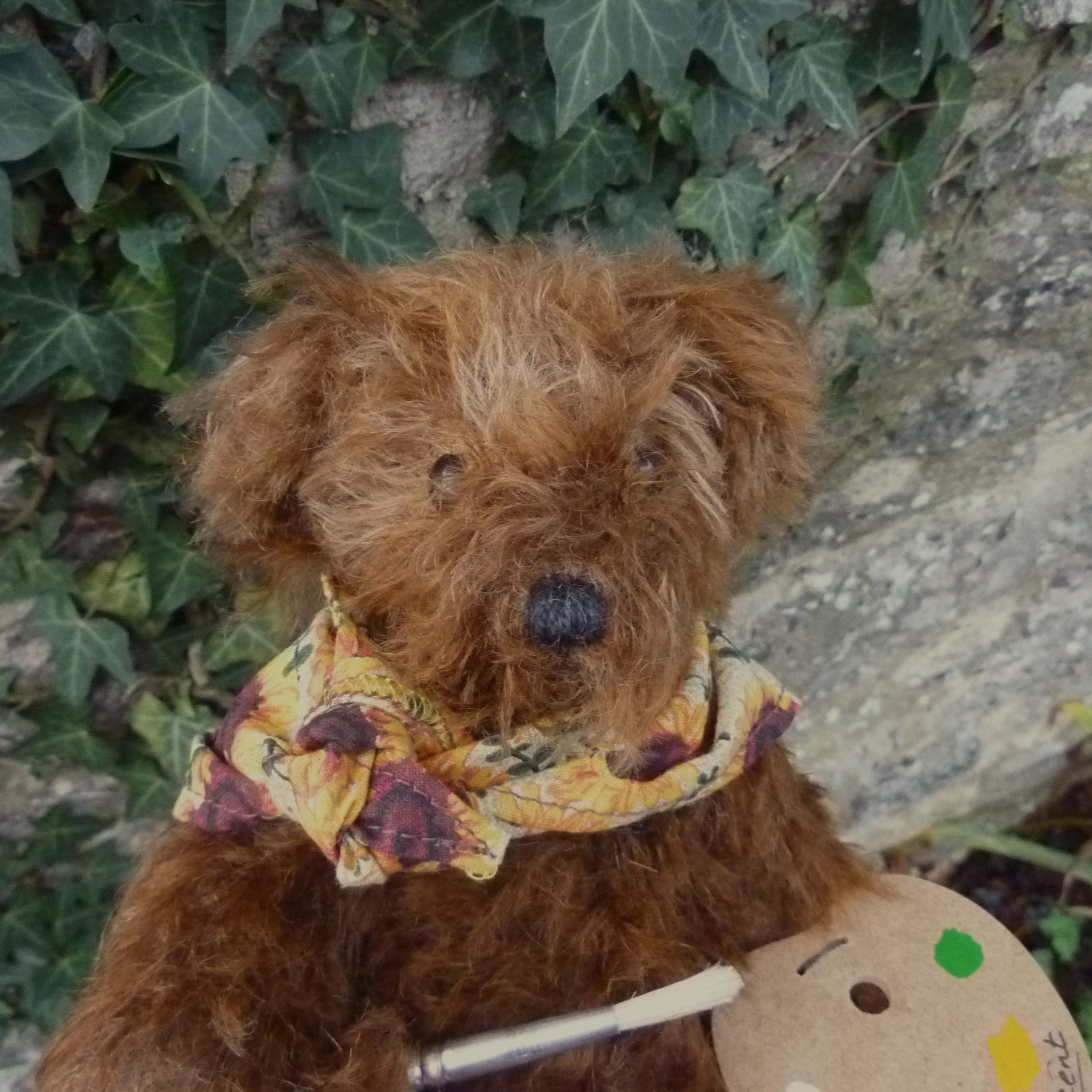 Highly tactile, this medium-sized bear is made of tousled brown batik mohair with shiny, black button eyes and felt paw pads. He wears a sunflower-printed neckerchief and holds a palette in one hand and a brush in the other. No button but with (smudged) label numbered 22 in back seam. Otherwise as new as well as being witty and fun.