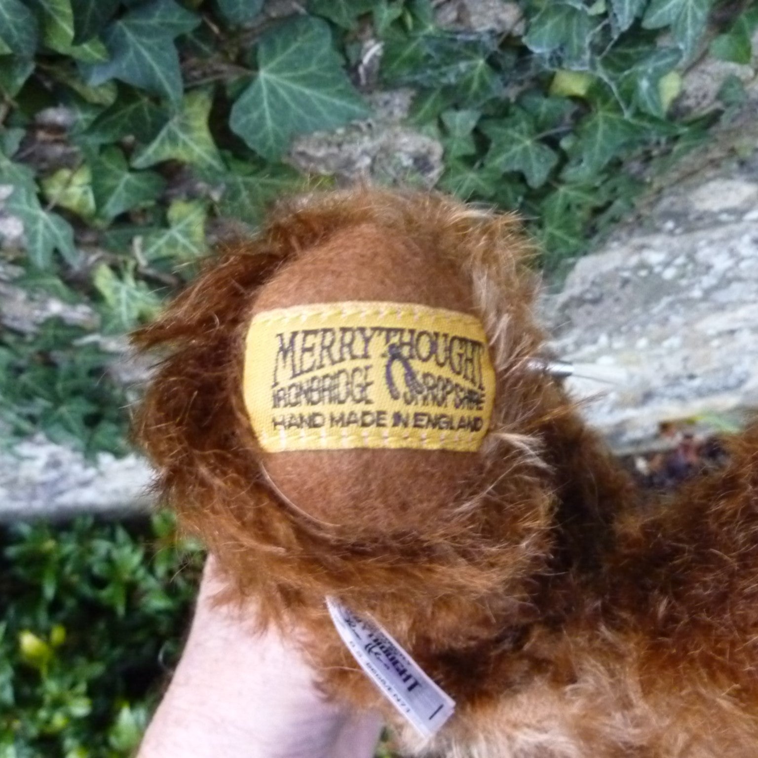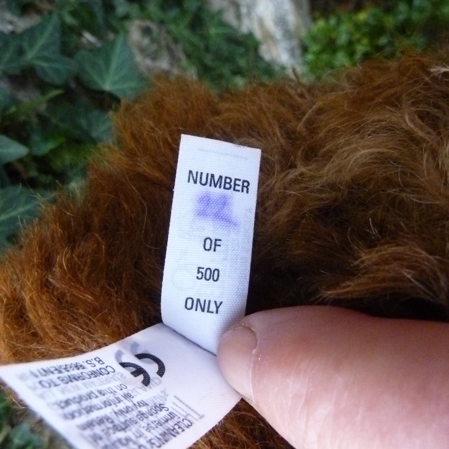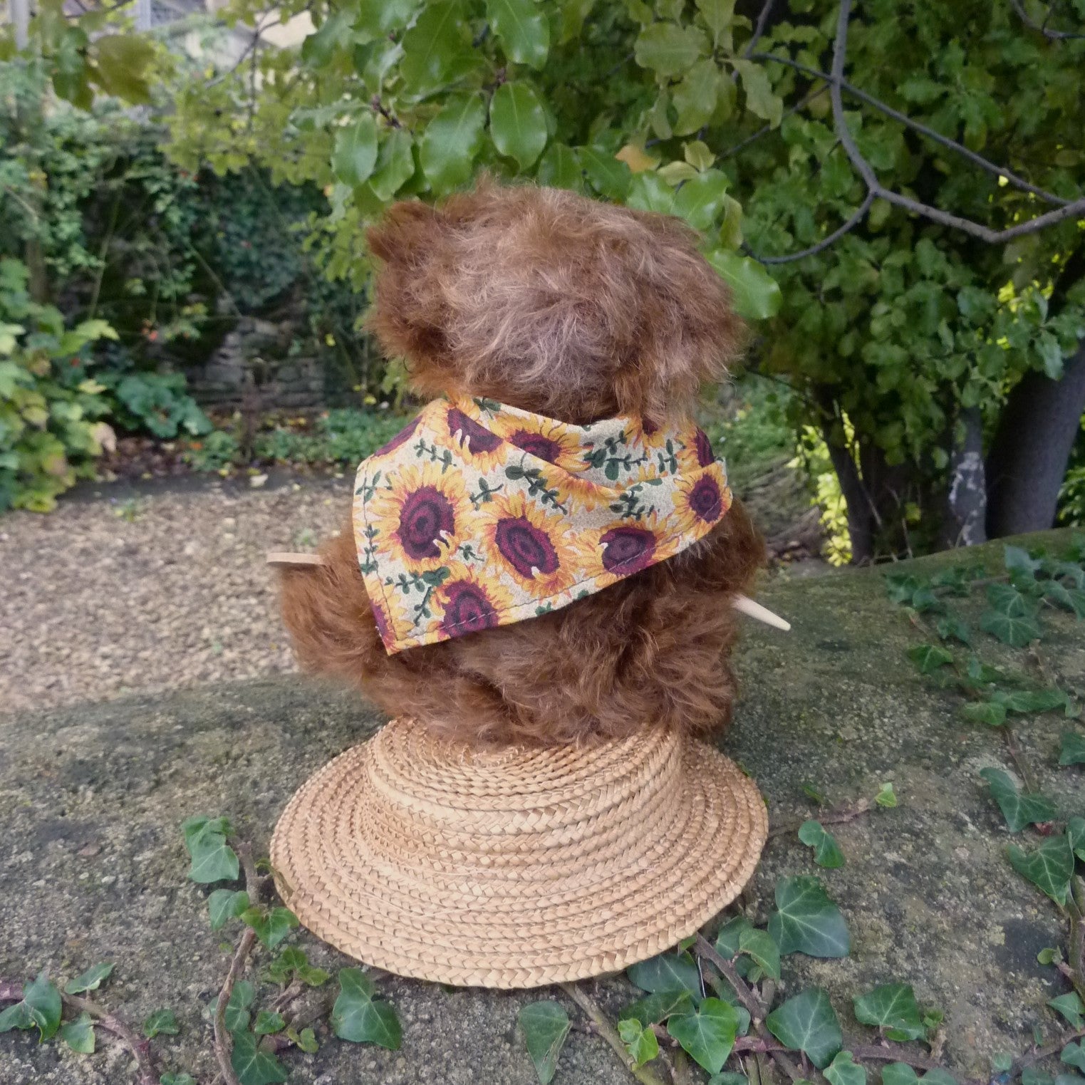 Highly tactile, this medium-sized bear is made of tousled brown batik mohair with shiny, black button eyes and felt paw pads. He wears a sunflower-printed neckerchief and holds a palette in one hand and a brush in the other. No button but with (smudged) label numbered 22 in back seam. Otherwise as new as well as being witty and fun.