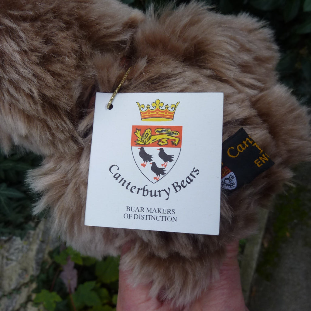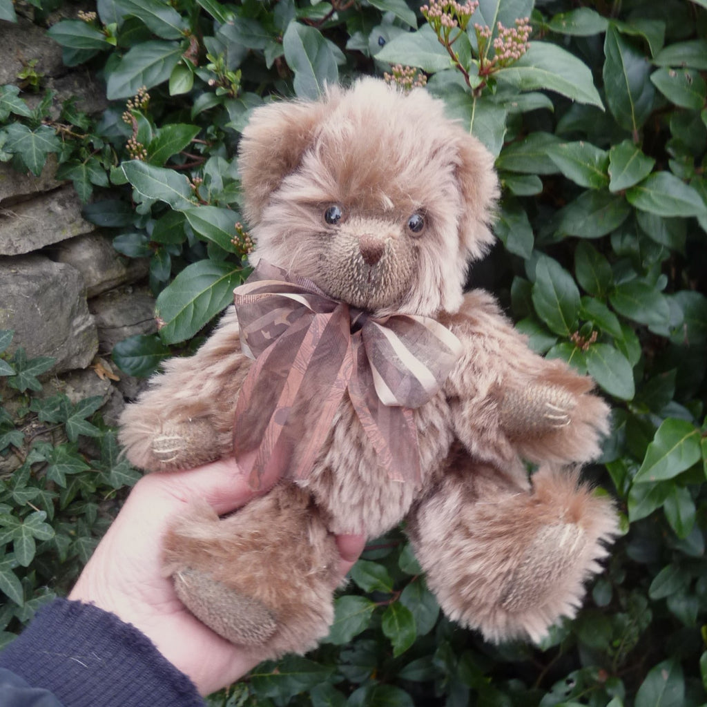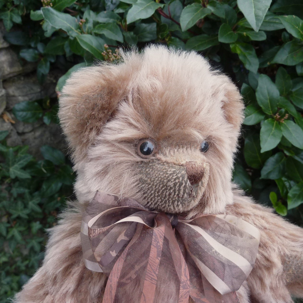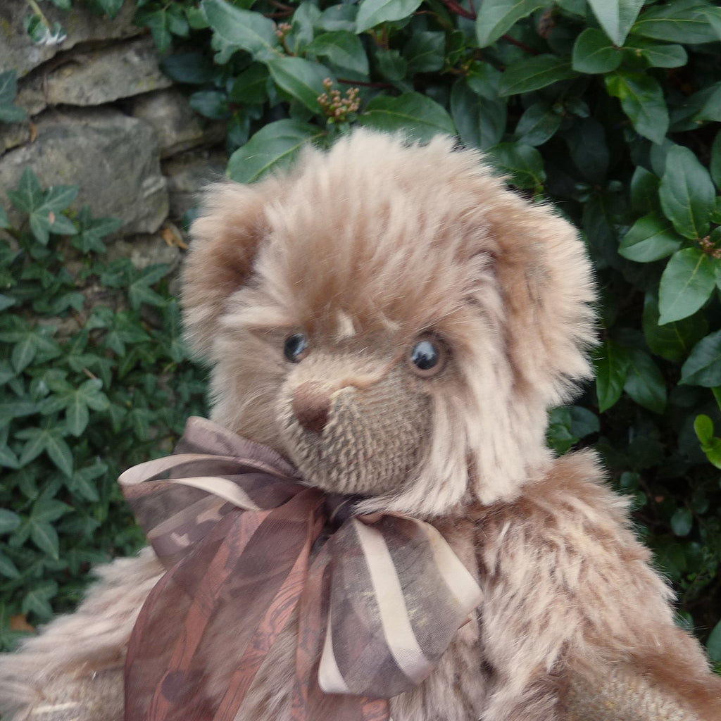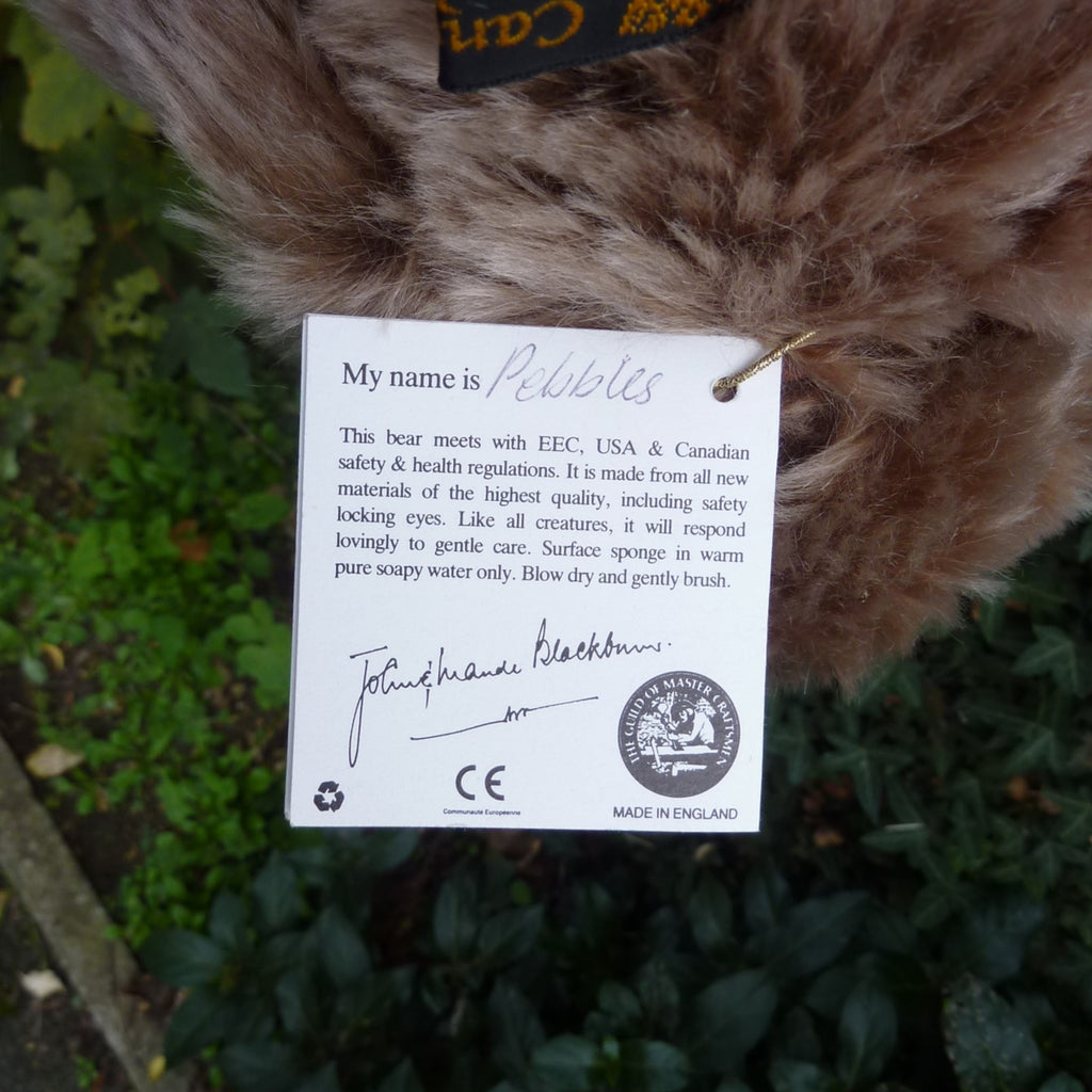 This small to medium-sized bear is made of soft and very long pile, pale-tipped, caramel mohair with brown and black safety eyes and a shaved muzzle and paw pads. As new with certificate, Pebbles is very softly pellet filled and very, very tactile.