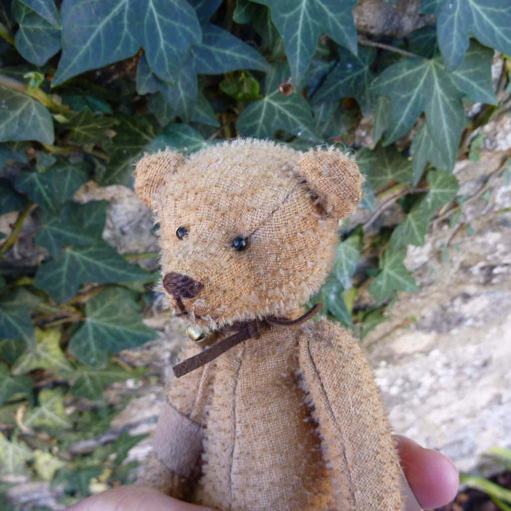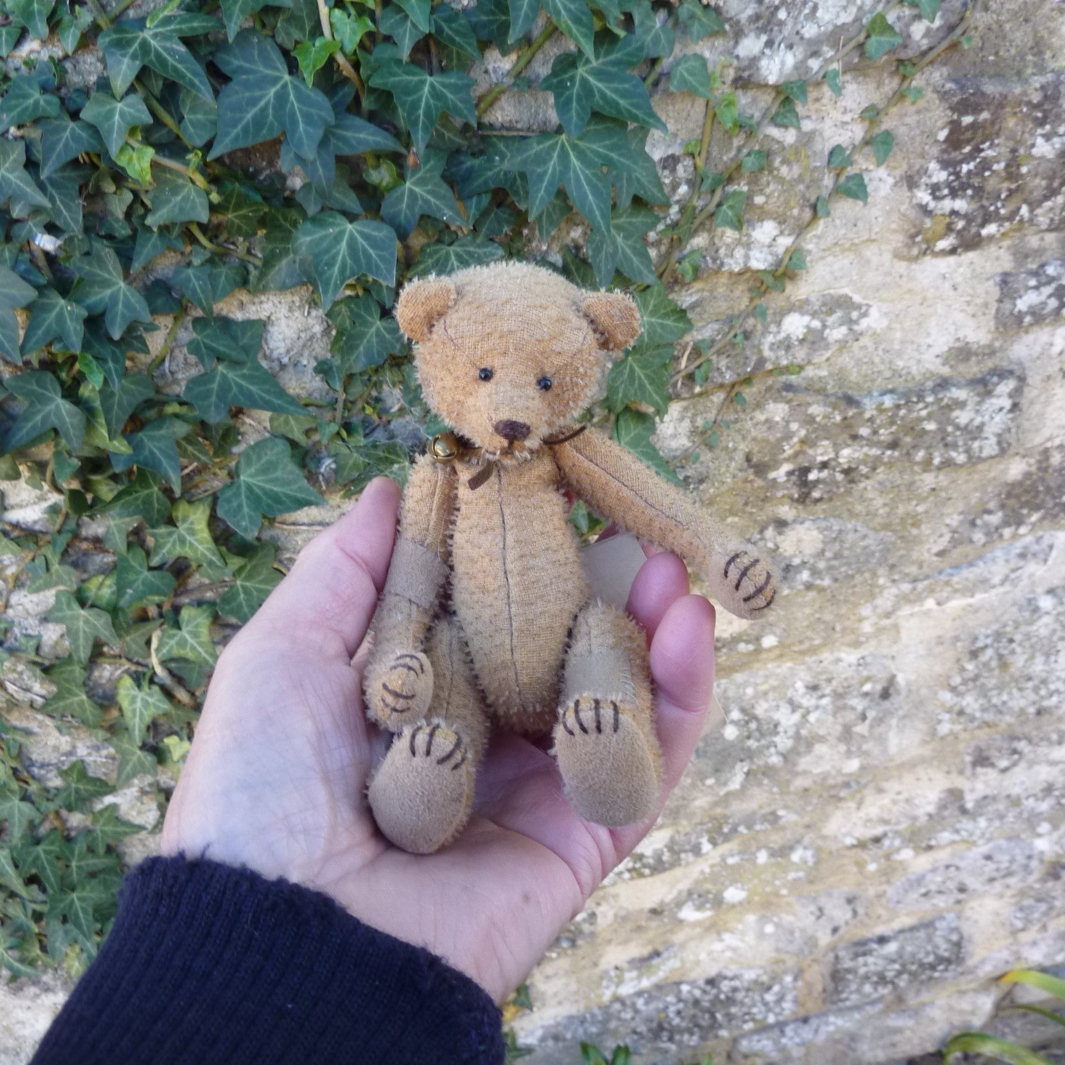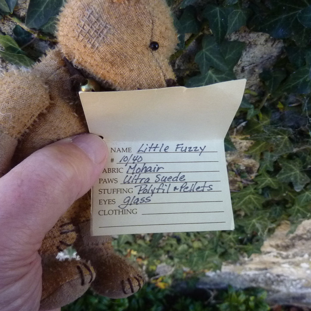 This small, VERY tactile and old-looking bear is made of ultra-sparse, pale brown mohair, which Jackie has shaved so he is virtually all bald. Little Fuzzy has black glass eyes, faux suede paw pads and a faux suede patch on one arm. Filled with a mixture of poly fibre and steel beads, this delightful bear (number10 of the edition) is in excellent condition. The certificate is slightly aged.