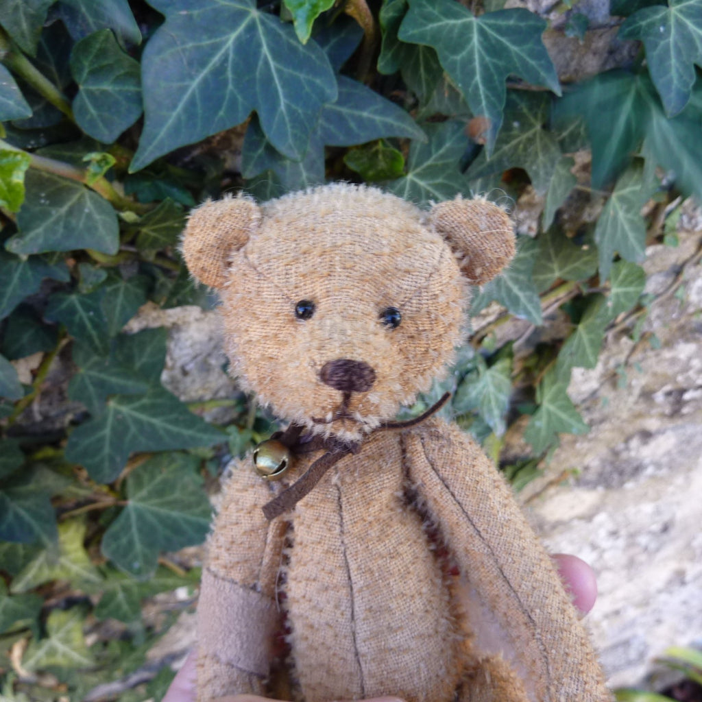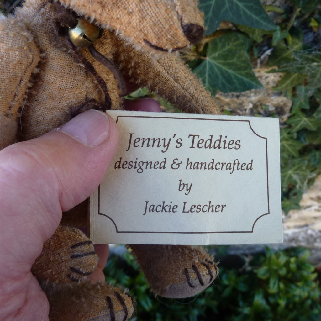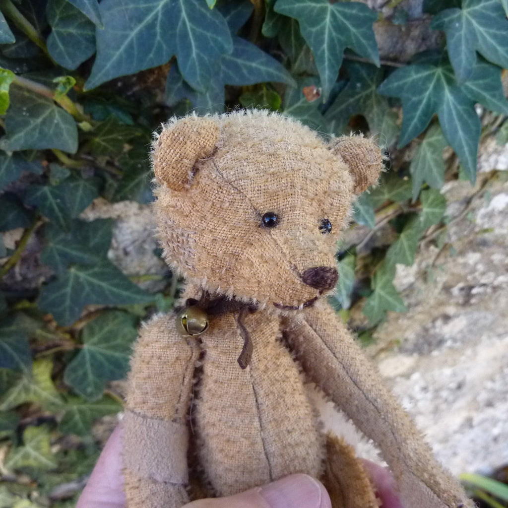 This small, VERY tactile and old-looking bear is made of ultra-sparse, pale brown mohair, which Jackie has shaved so he is virtually all bald. Little Fuzzy has black glass eyes, faux suede paw pads and a faux suede patch on one arm. Filled with a mixture of poly fibre and steel beads, this delightful bear (number10 of the edition) is in excellent condition. The certificate is slightly aged.