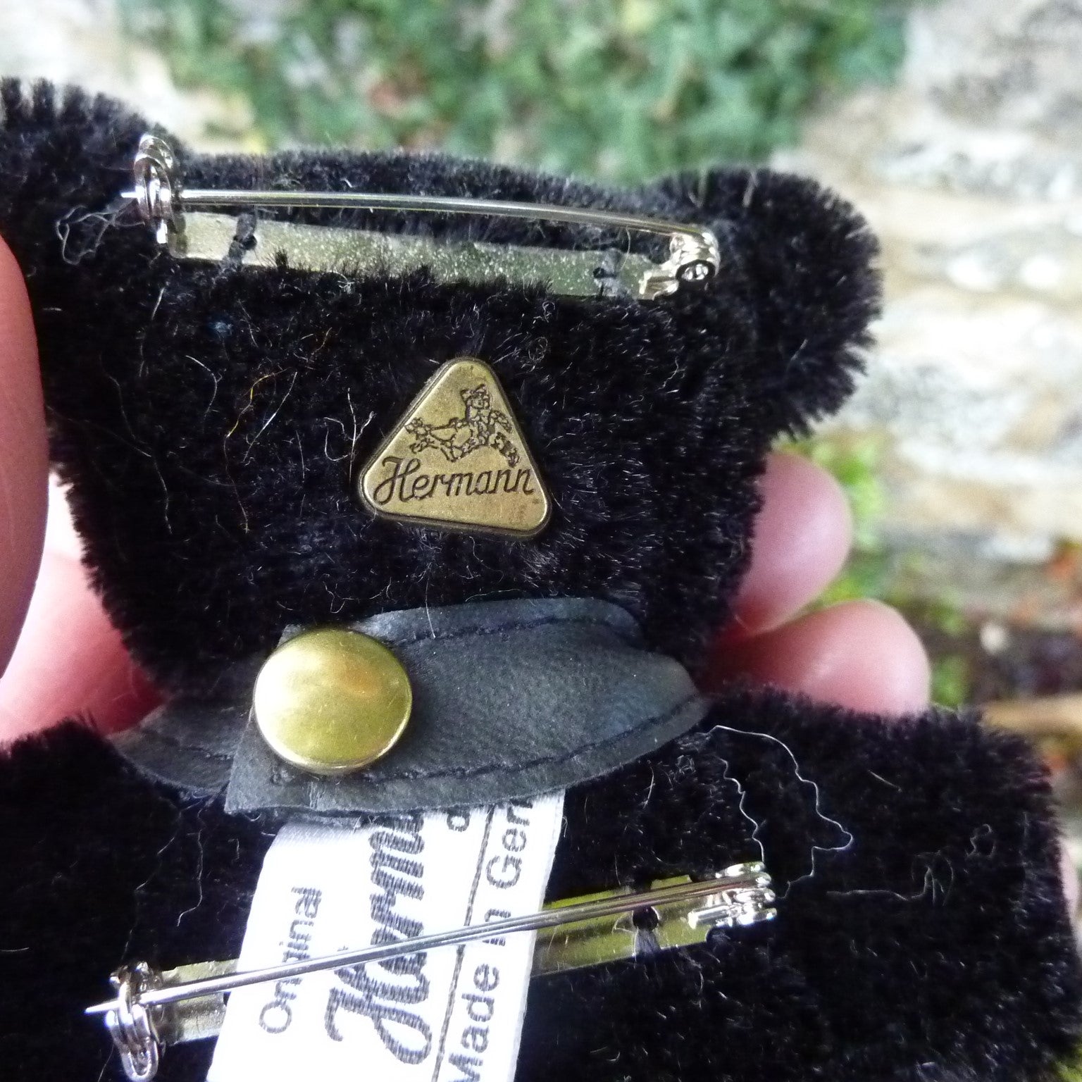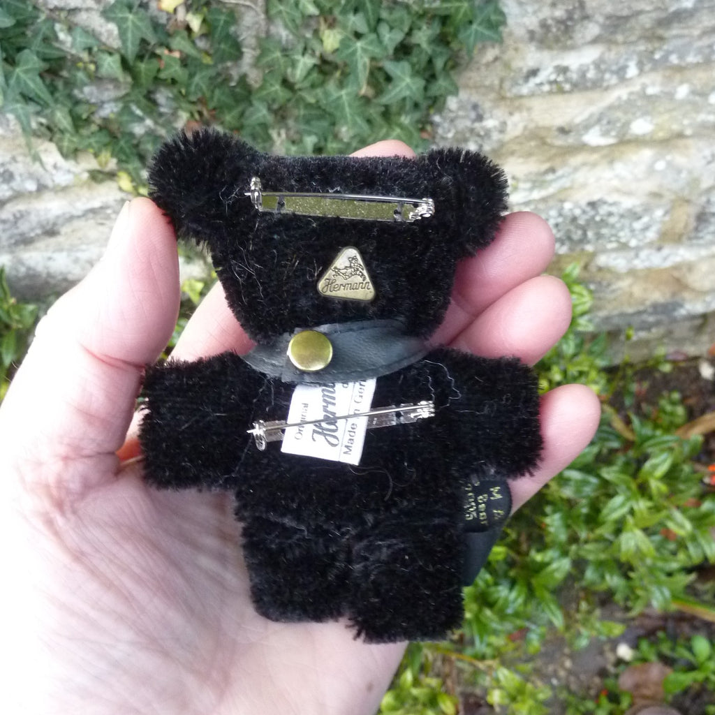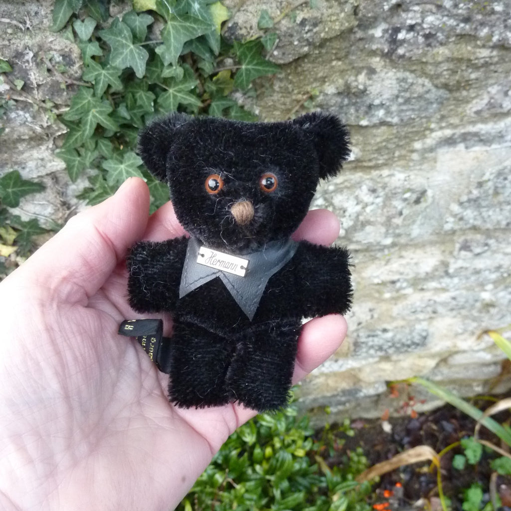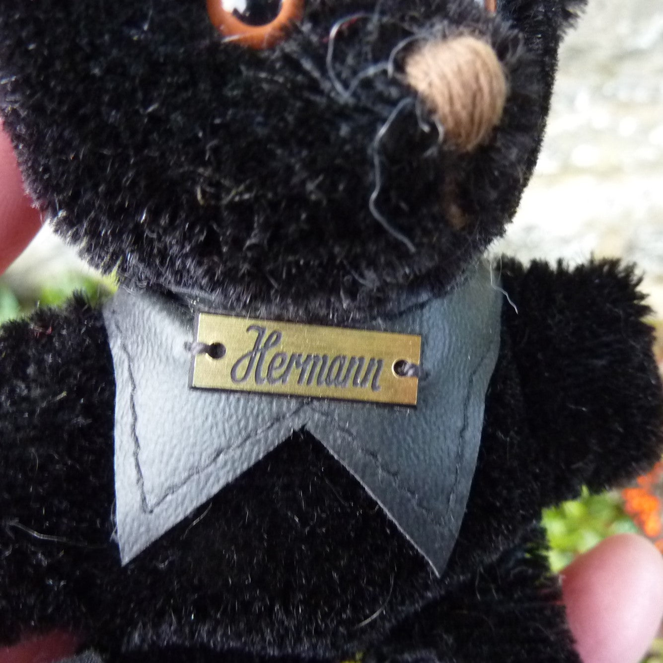 This little non-jointed bear is made of short pile black mohair with brown and black glass eyes. He wears a brass Hermann label on his black collar. He has a pin on his back together with a Herrmann label and brass Hermann stud. If bought by someone outside the UK, there will be a GBP20 surcharge towards the airmail cost.