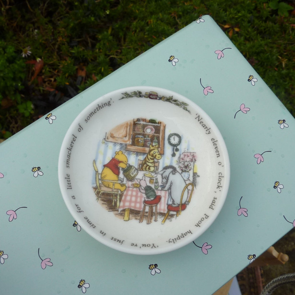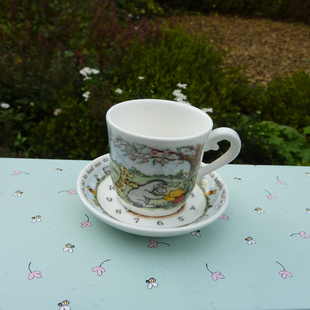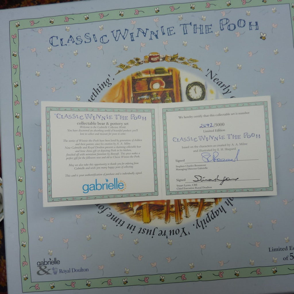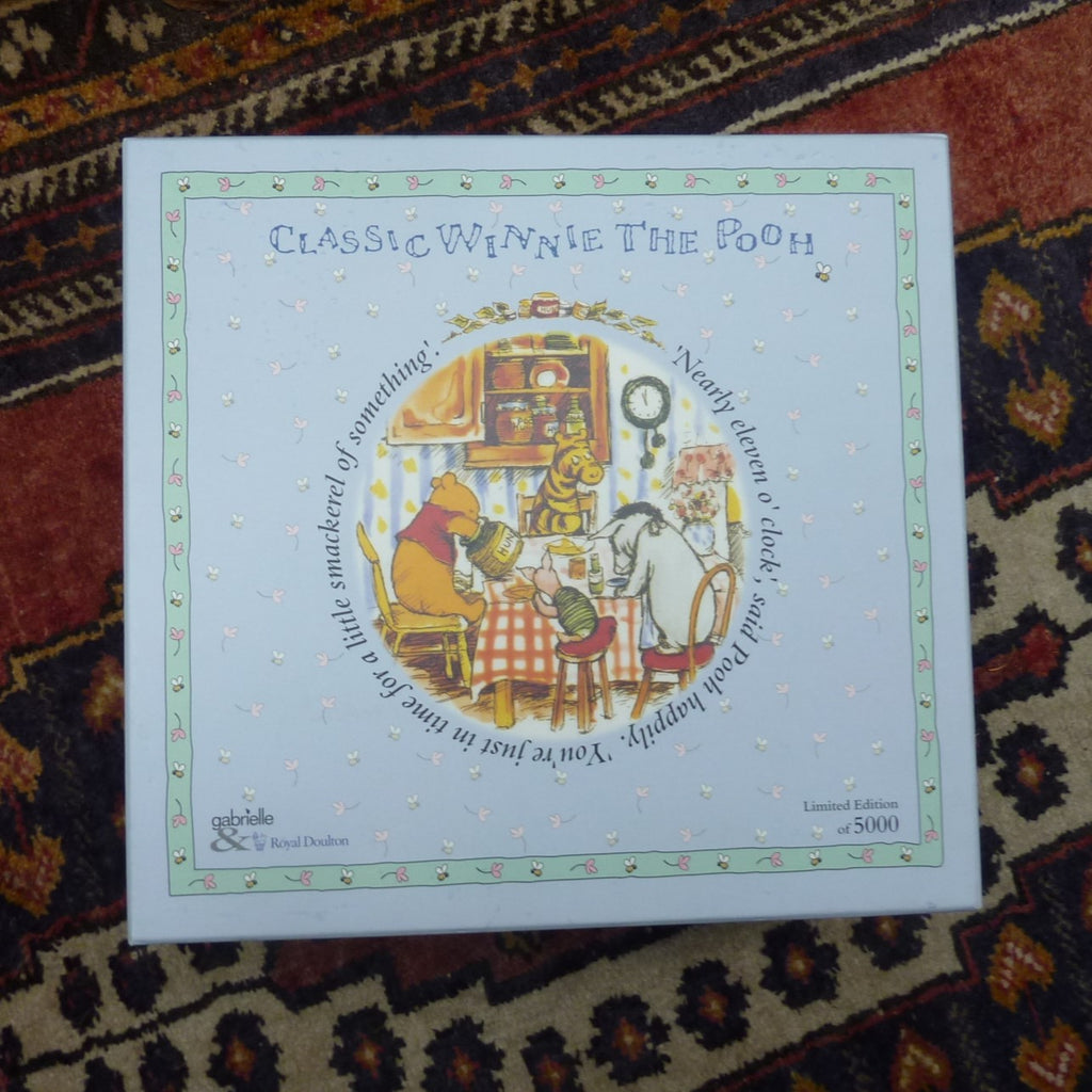 This scarce set comprises a short pile, brown mohair Winnie the Pooh (with jointed legs), a wooden table and chair, a gingham table cloth and a Royal Doulton plate, cup and saucer. The inside of the decorative box is printed to resemble Pooh’s kitchen. In excellent condition with certificate. (If bought by someone outside the UK there will be a GBP65 surcharge towards the airmail cost.)