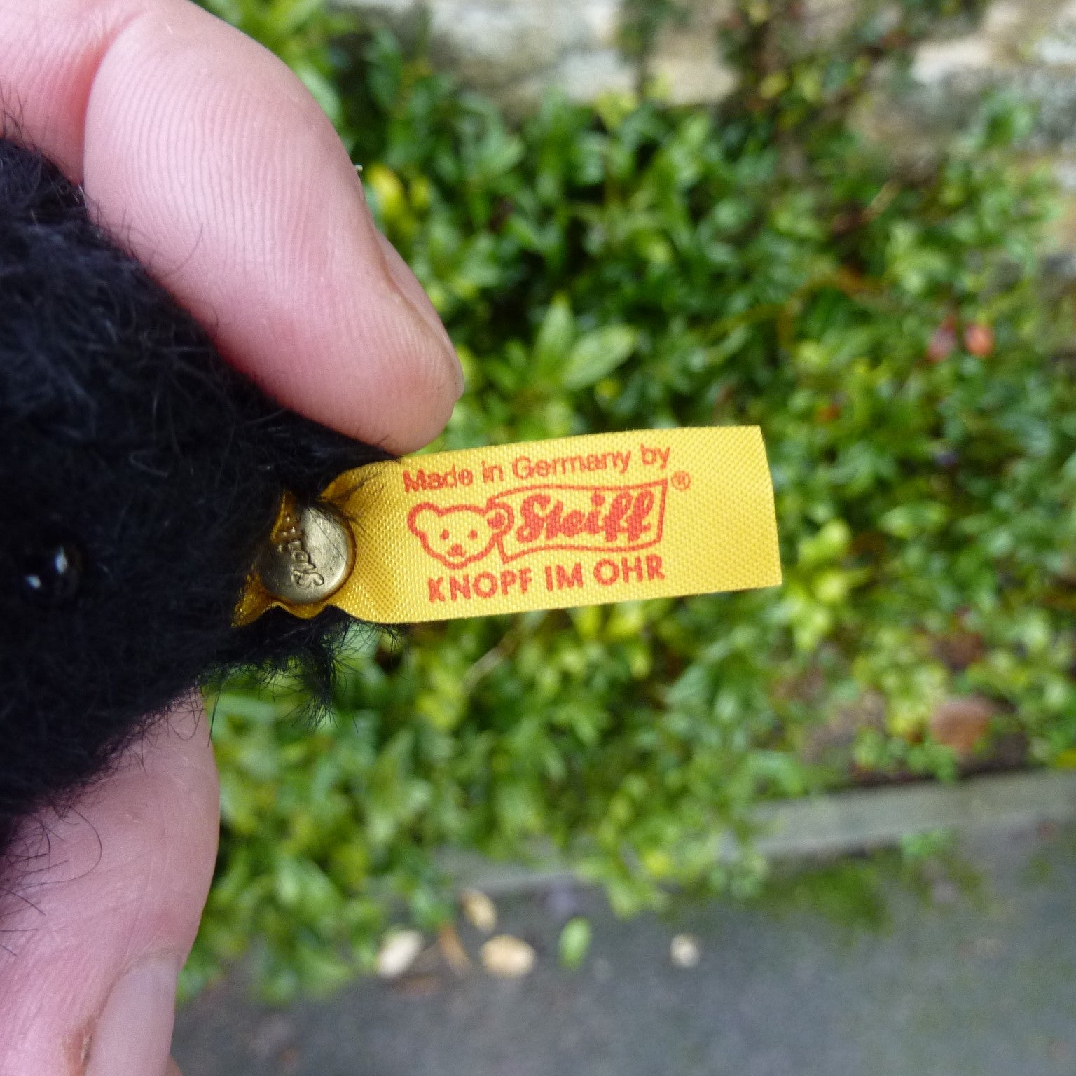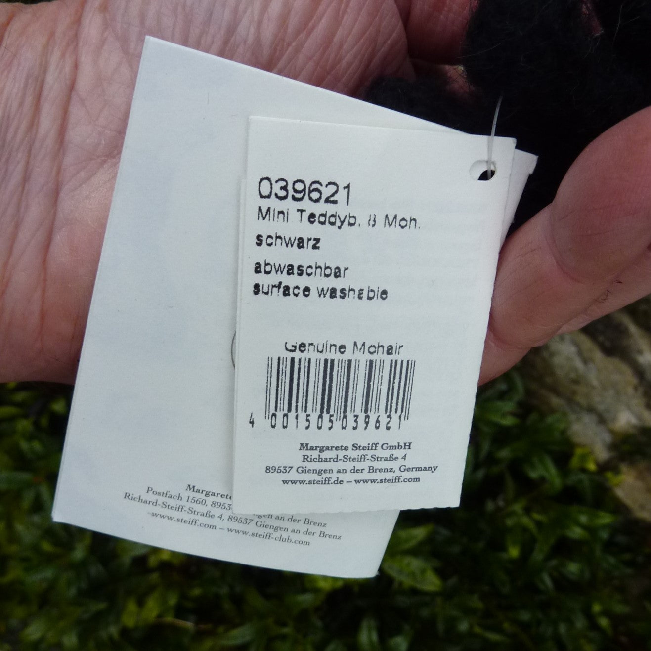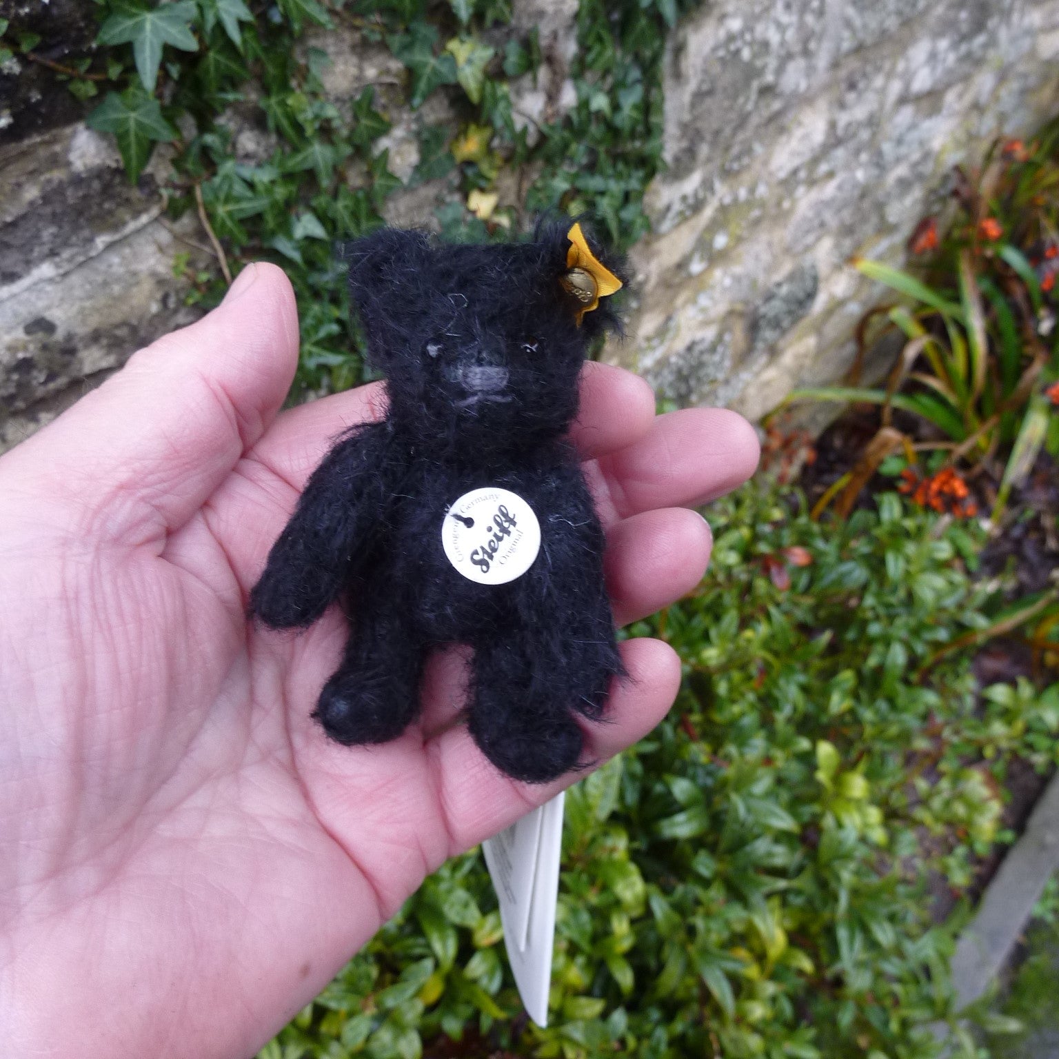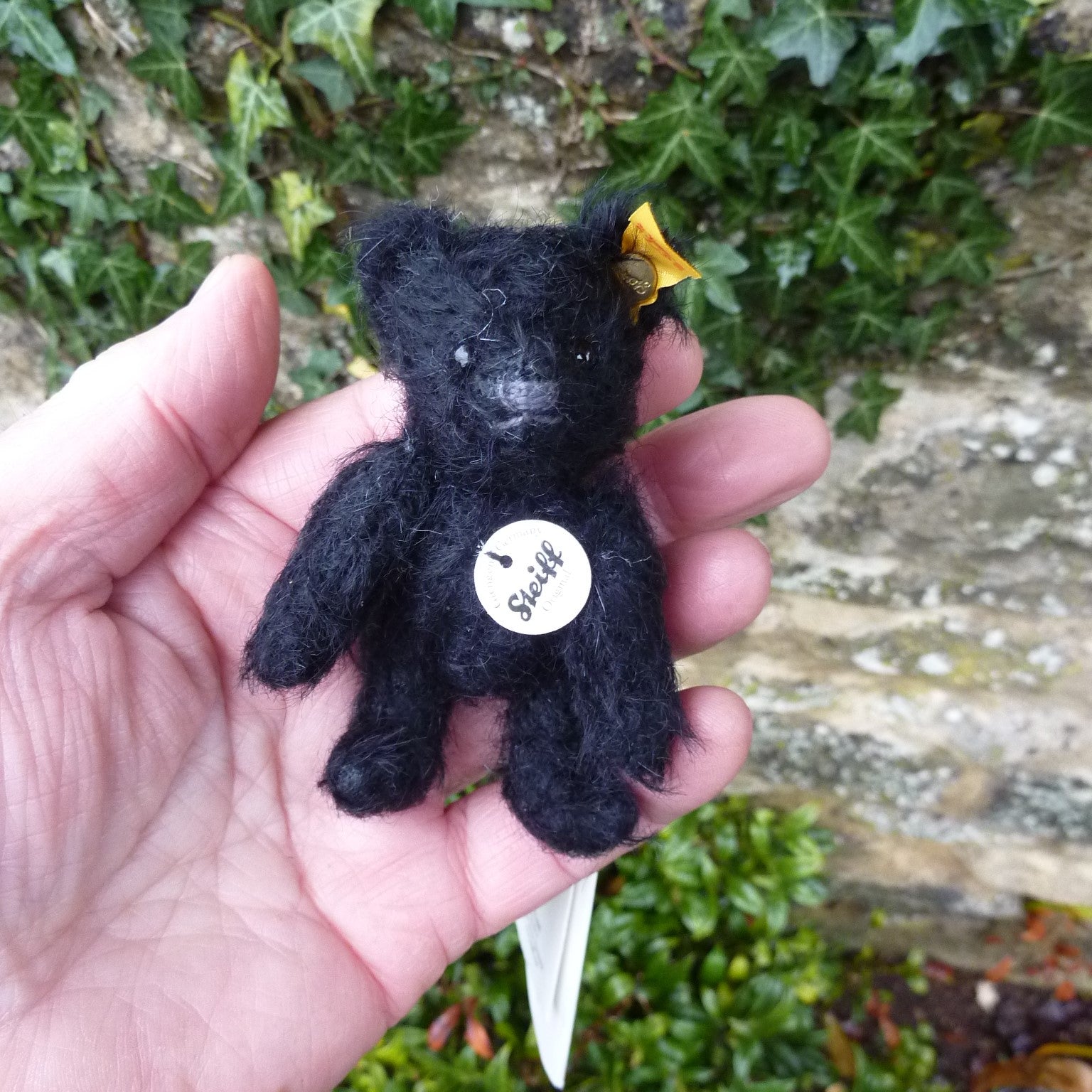 Virtually as new, this tiny, fully-jointed bear is made of fuzzy, black mohair with black button eyes. He is in excellent condition with button, ear tag, chest tag and hang tag.
