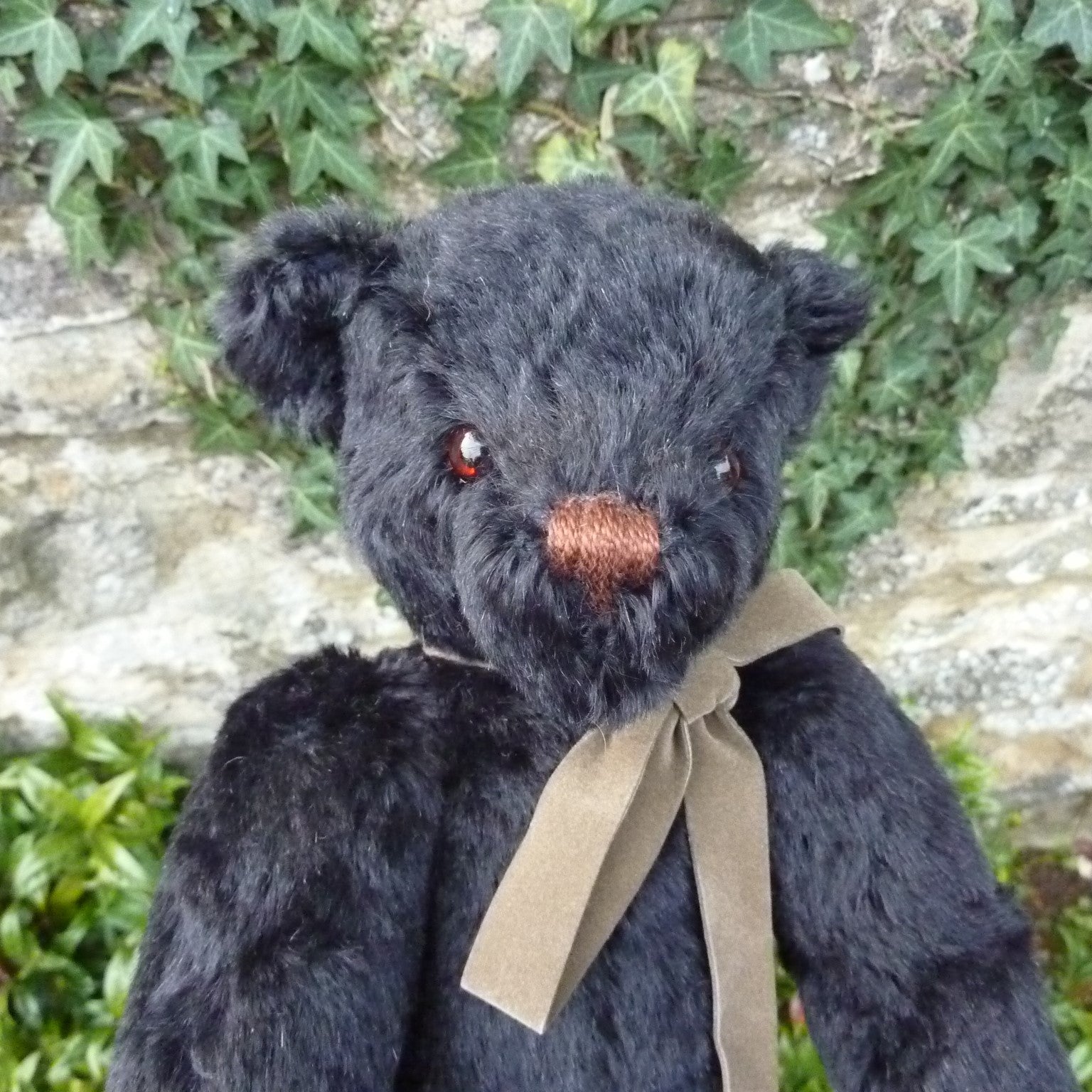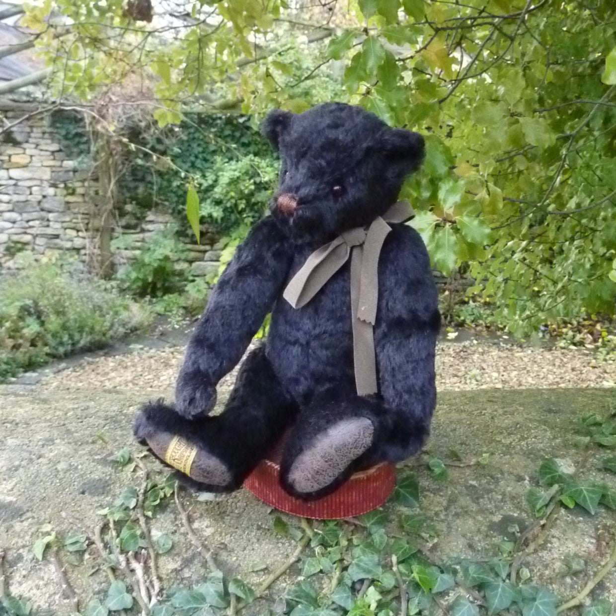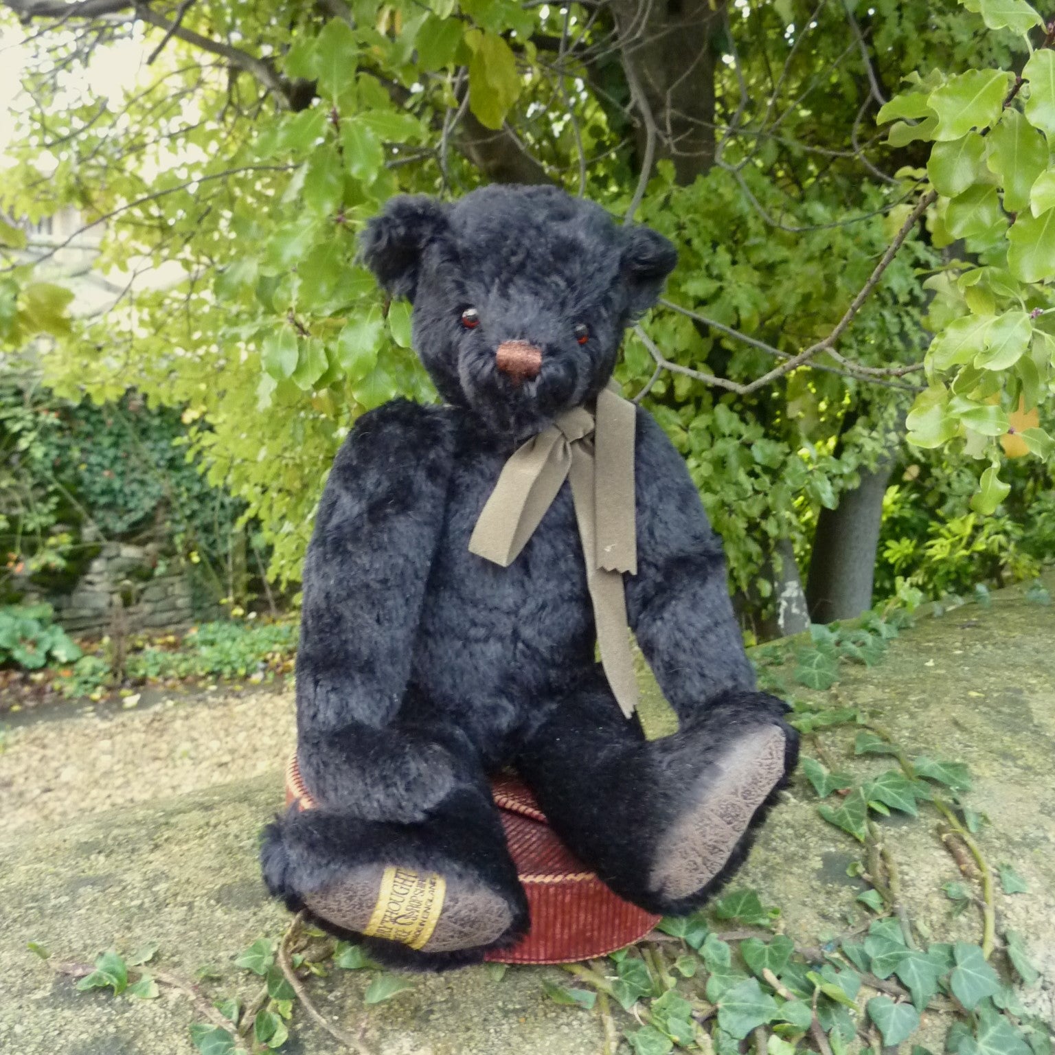 This gangly, medium-sized bear is made of dense and lightly distressed, black mohair, he has amber and black safety eyes and faux leather footpads. He has a sewn-in (smudged) label numbered 46 of 100. Otherwise, as new.