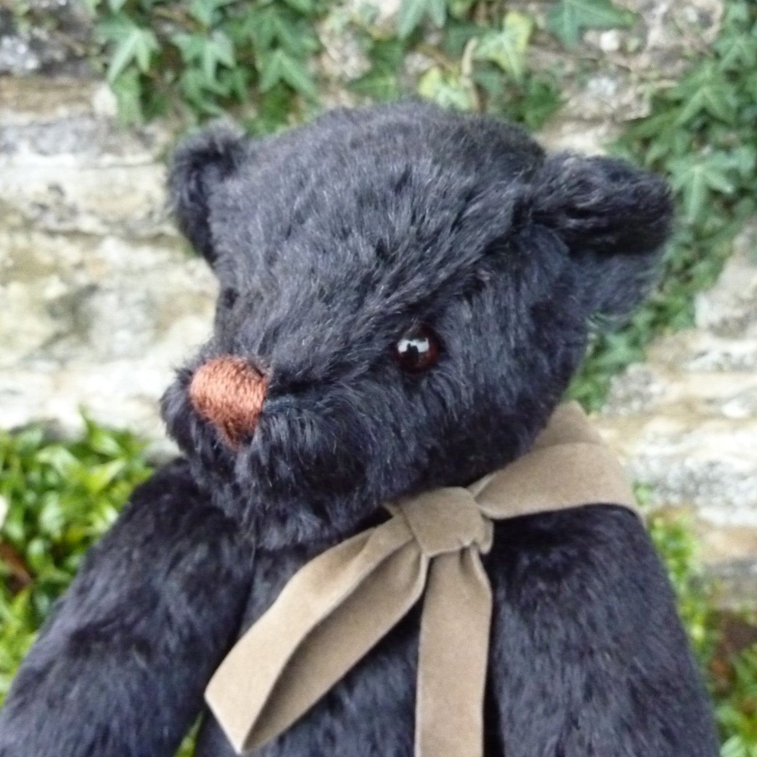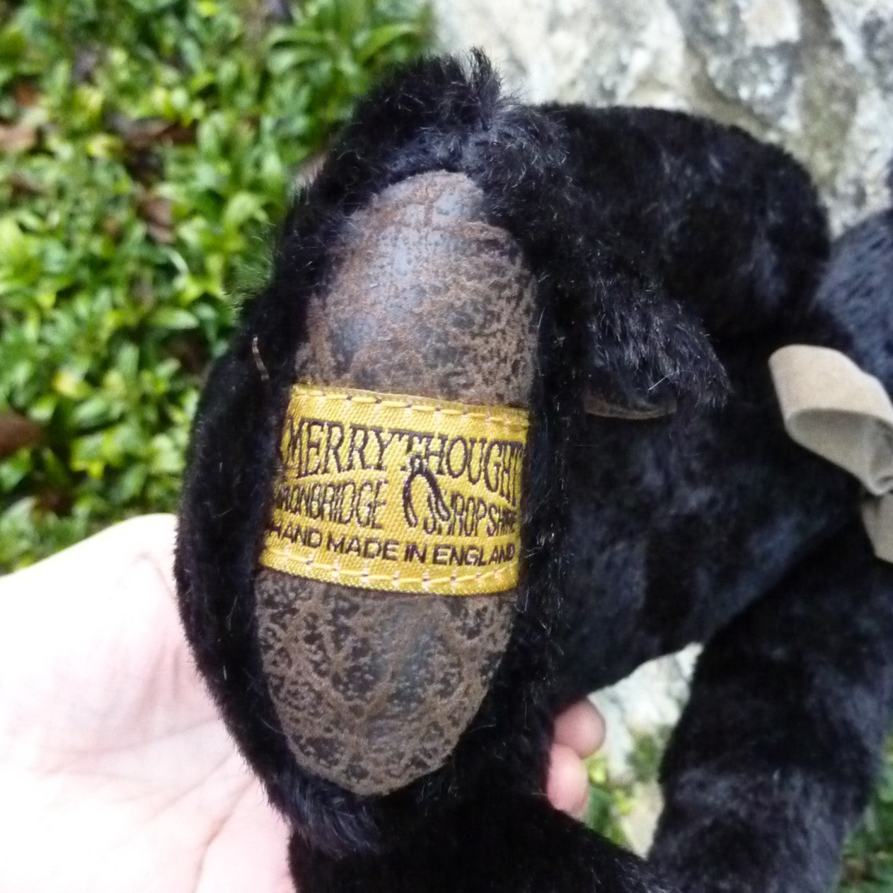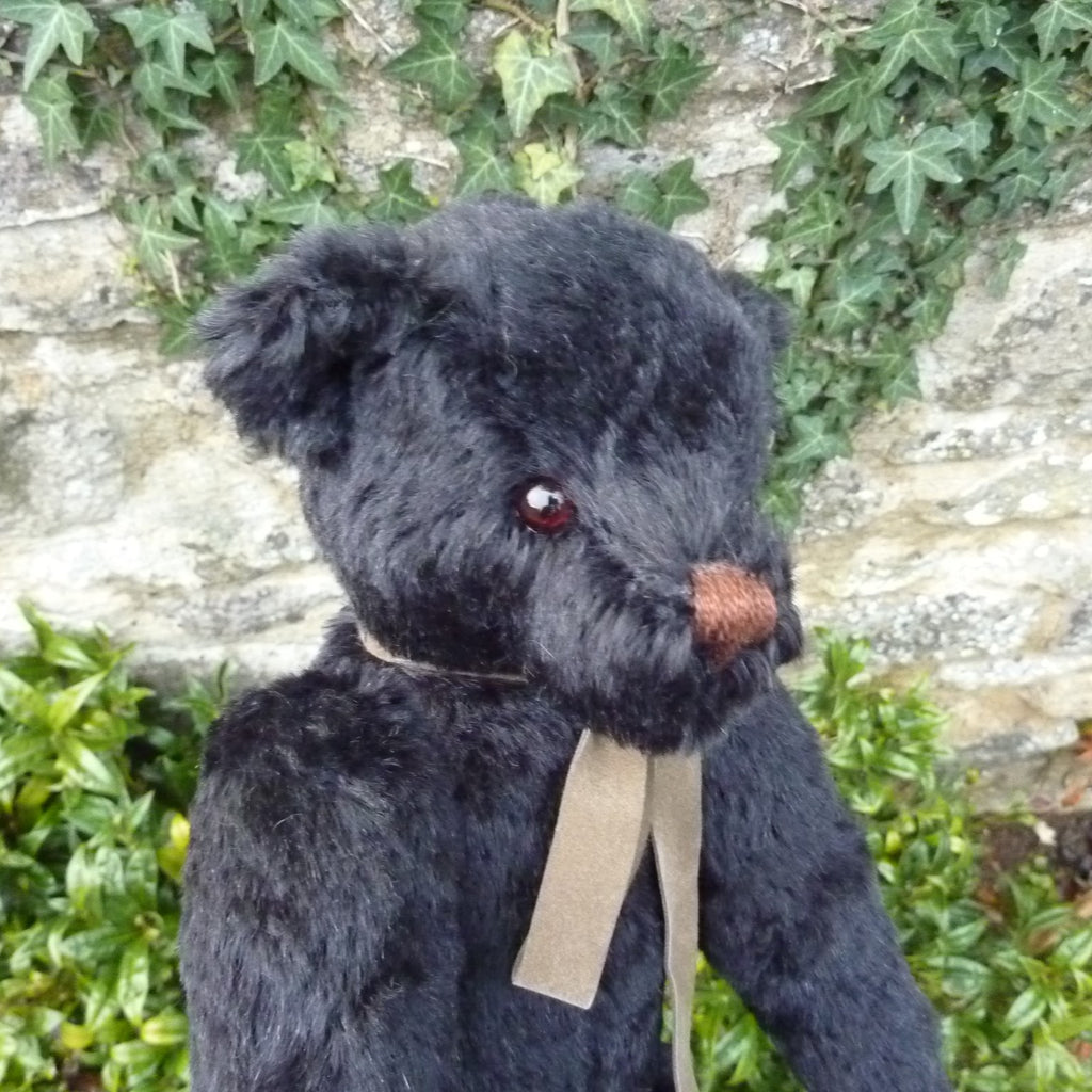 This gangly, medium-sized bear is made of dense and lightly distressed, black mohair, he has amber and black safety eyes and faux leather footpads. He has a sewn-in (smudged) label numbered 46 of 100. Otherwise, as new.