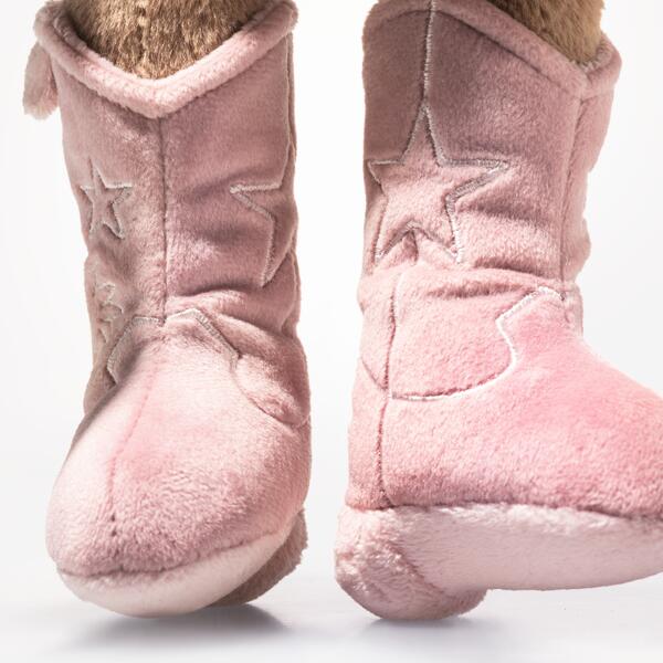 As the prairie sky glows at sunset, Hoppie cowgirl rabbit is already setting off on her next adventure. Made from snuggly soft plush, she sits steadily thanks to little bean bags in her bottom. Her gentle eyes and sweet little nose are simply made for cuddles. Delicate star embroidery decorates her cowgirl boots, while the iconic Steiff “Button in Ear“ is there to ride along on every journey through the Wild West.