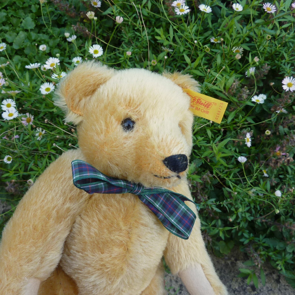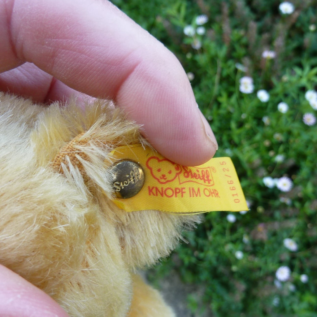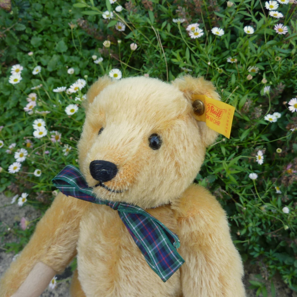 This small to medium-zed, classic Steiff bear is made of pale blond mohair with black safety eyes and felt paw pads. The neck ribbon has been replaced but the bear is in excellent condition with button and ear tag.