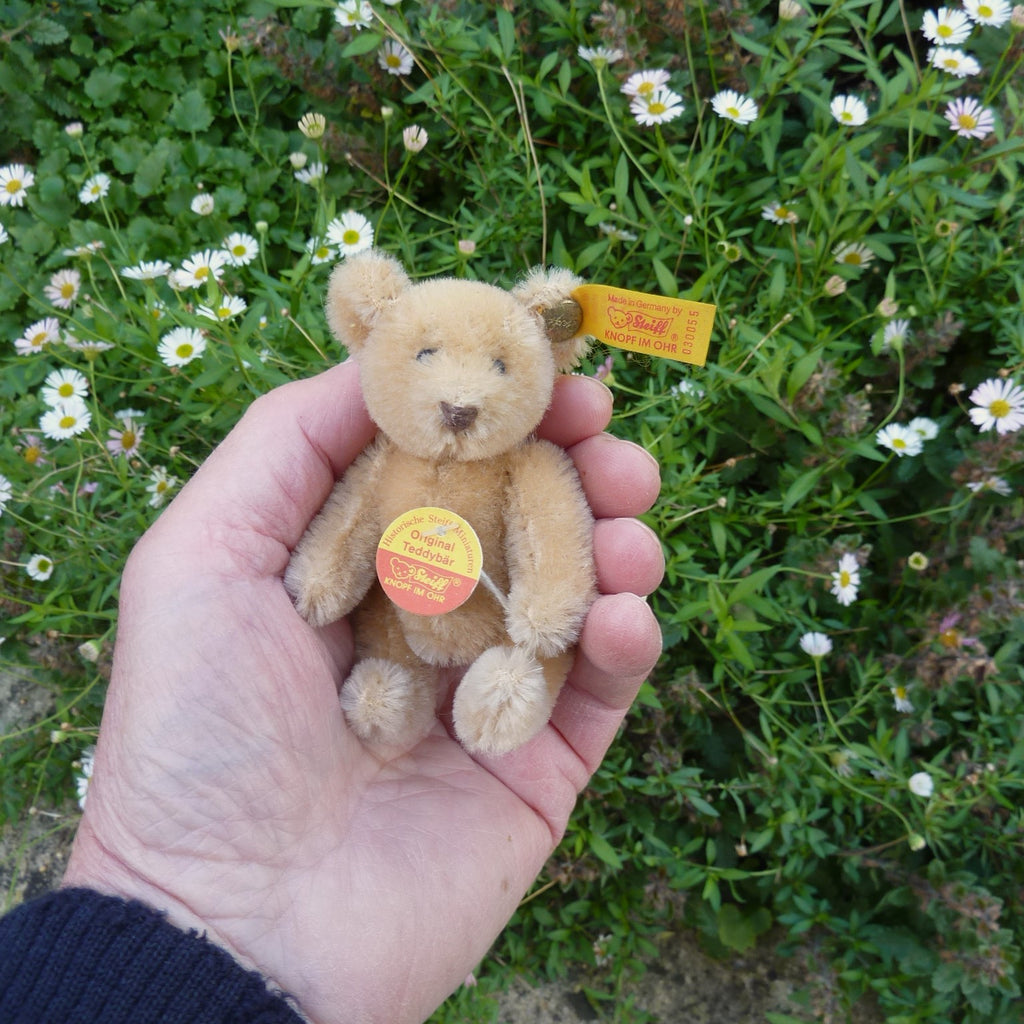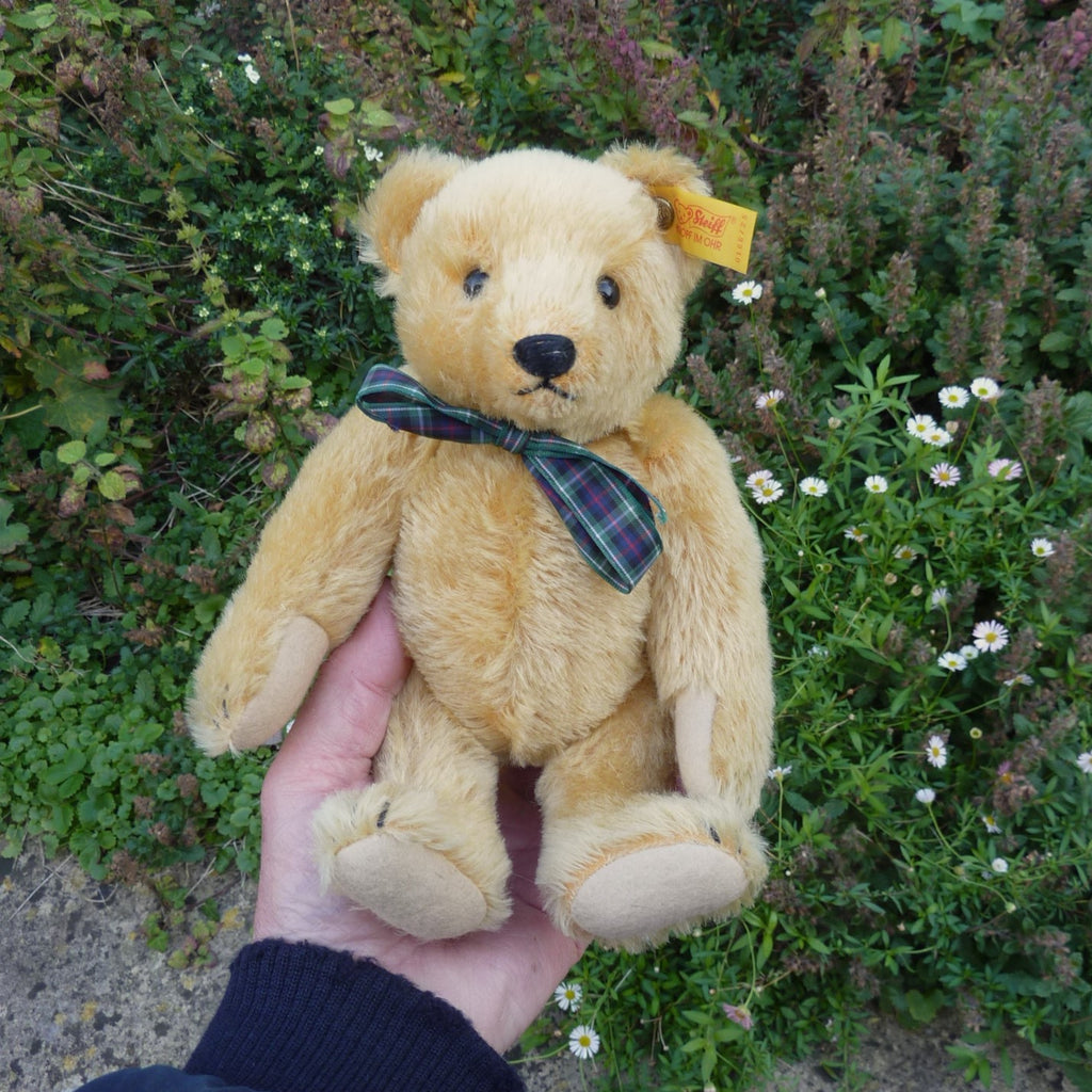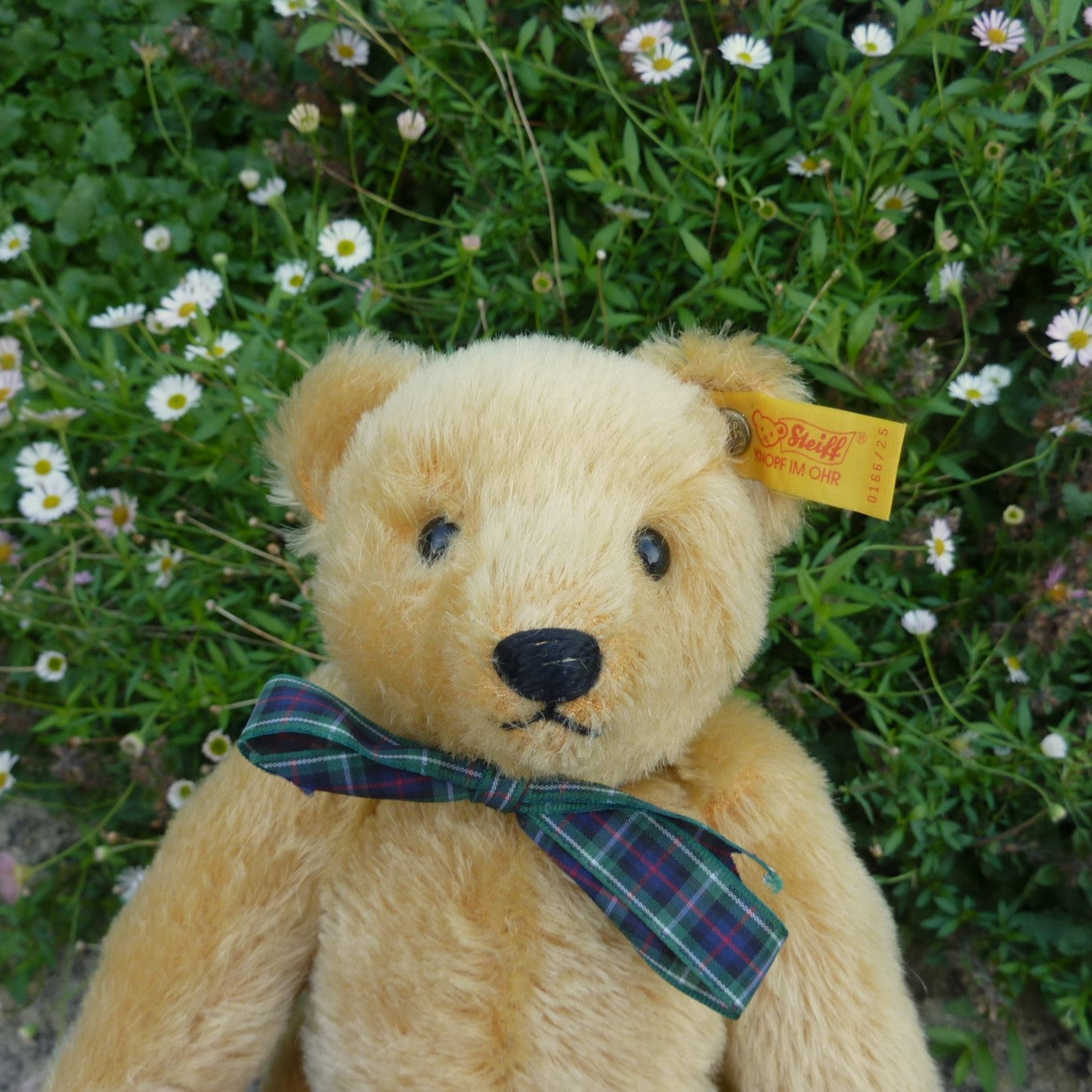 This small to medium-zed, classic Steiff bear is made of pale blond mohair with black safety eyes and felt paw pads. The neck ribbon has been replaced but the bear is in excellent condition with button and ear tag.
