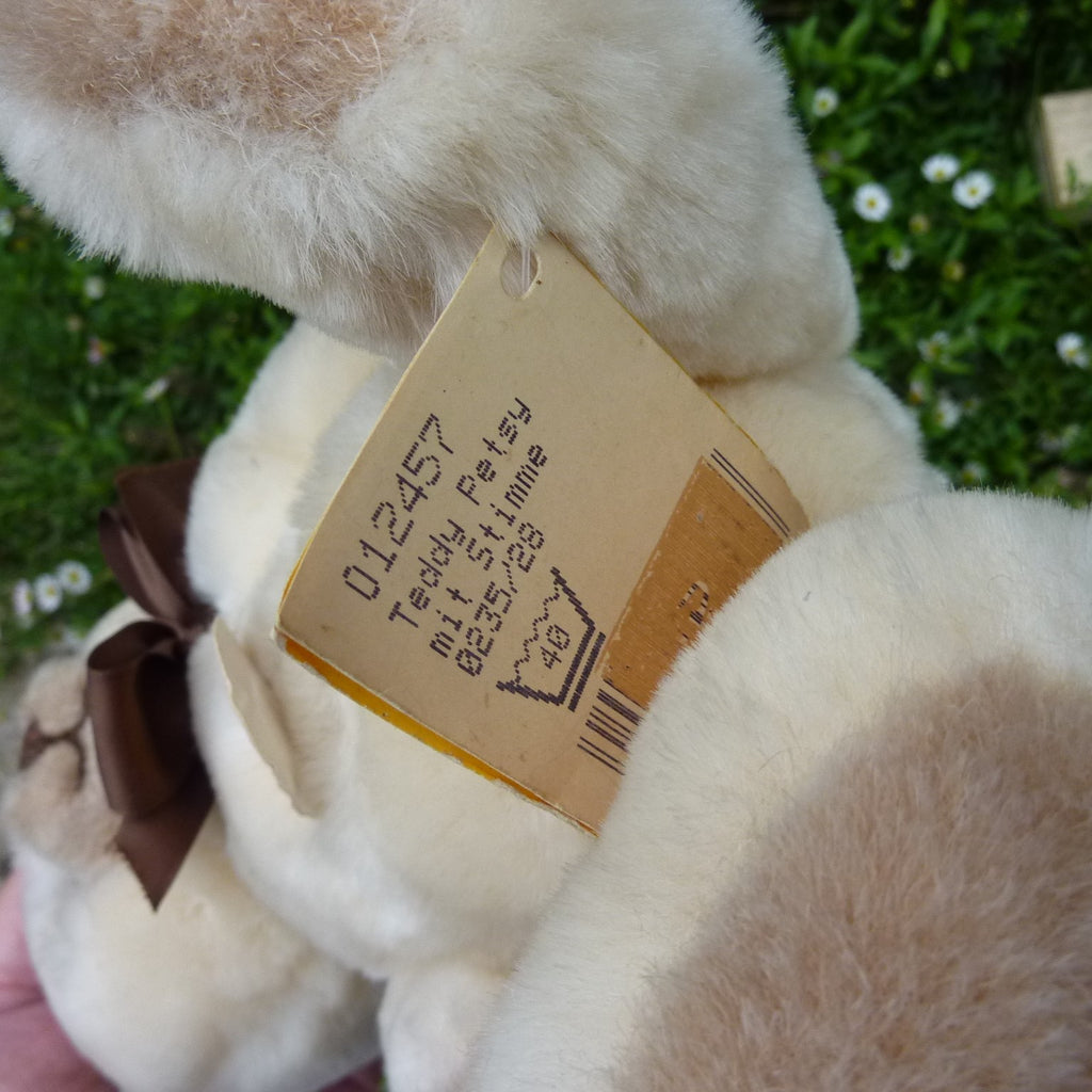 This ultra-soft, small to medium-zed bear is made of dense, manmade plush with brown and black safety eyes. The button and labels have very slight ageing but the (machine washable) bear is in excellent condition.