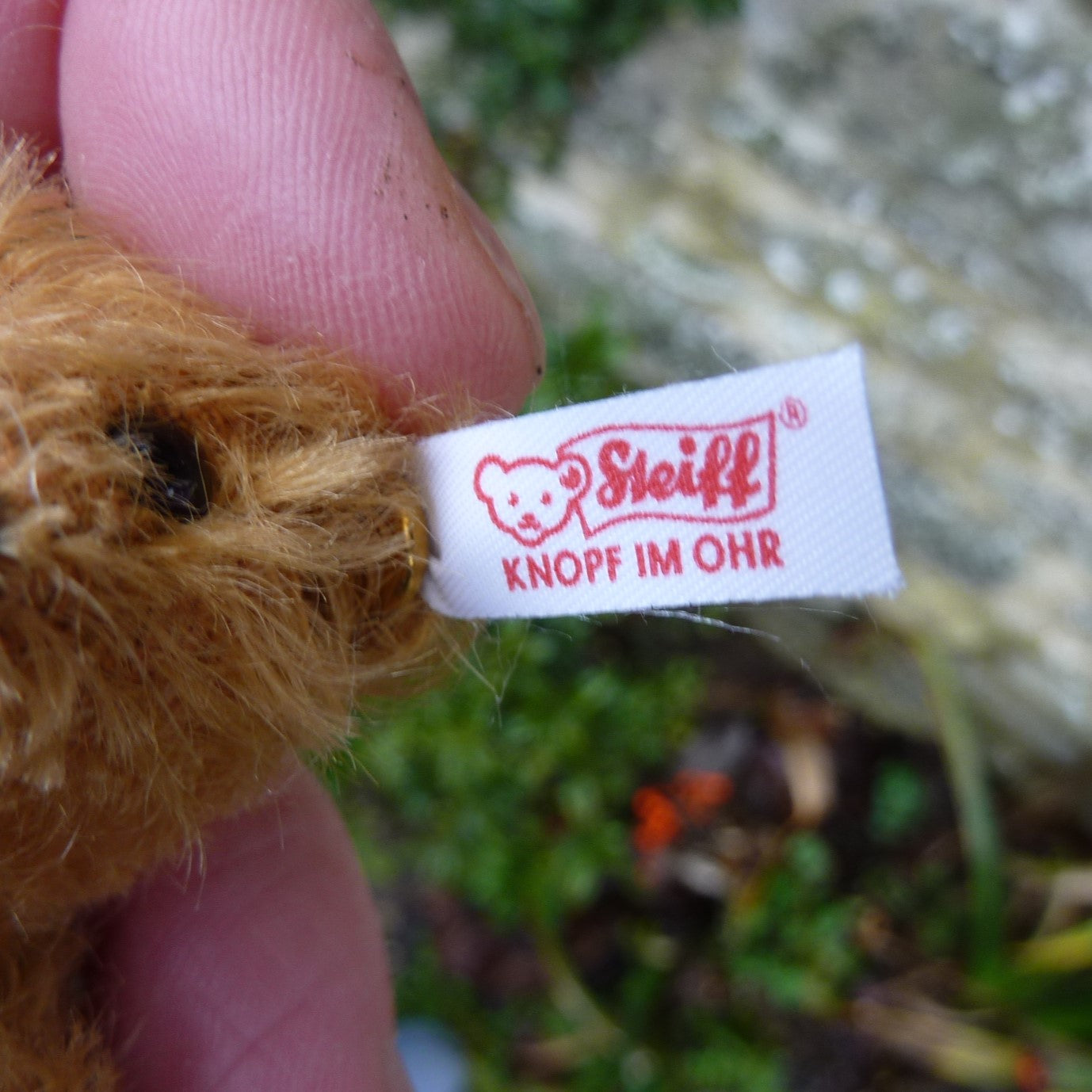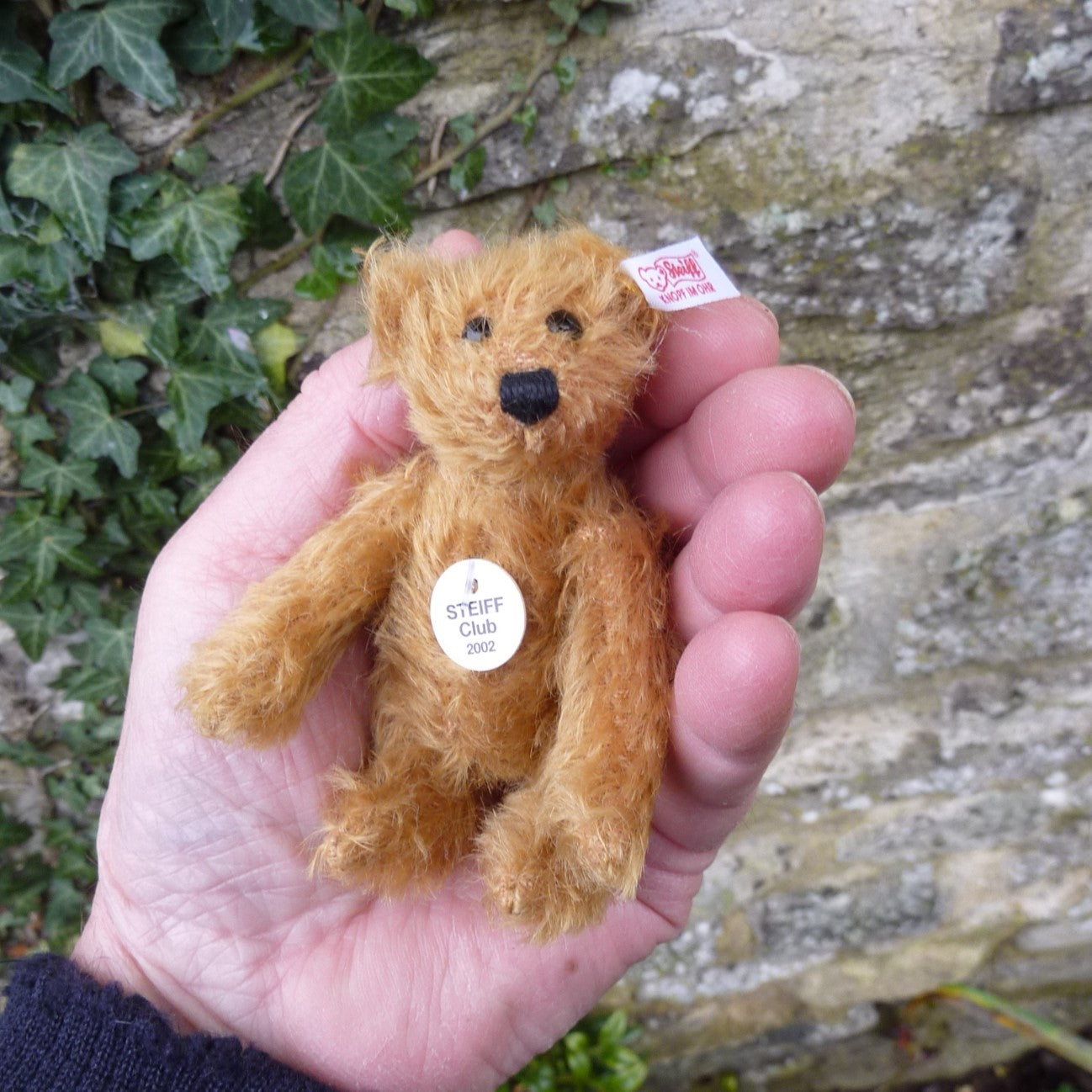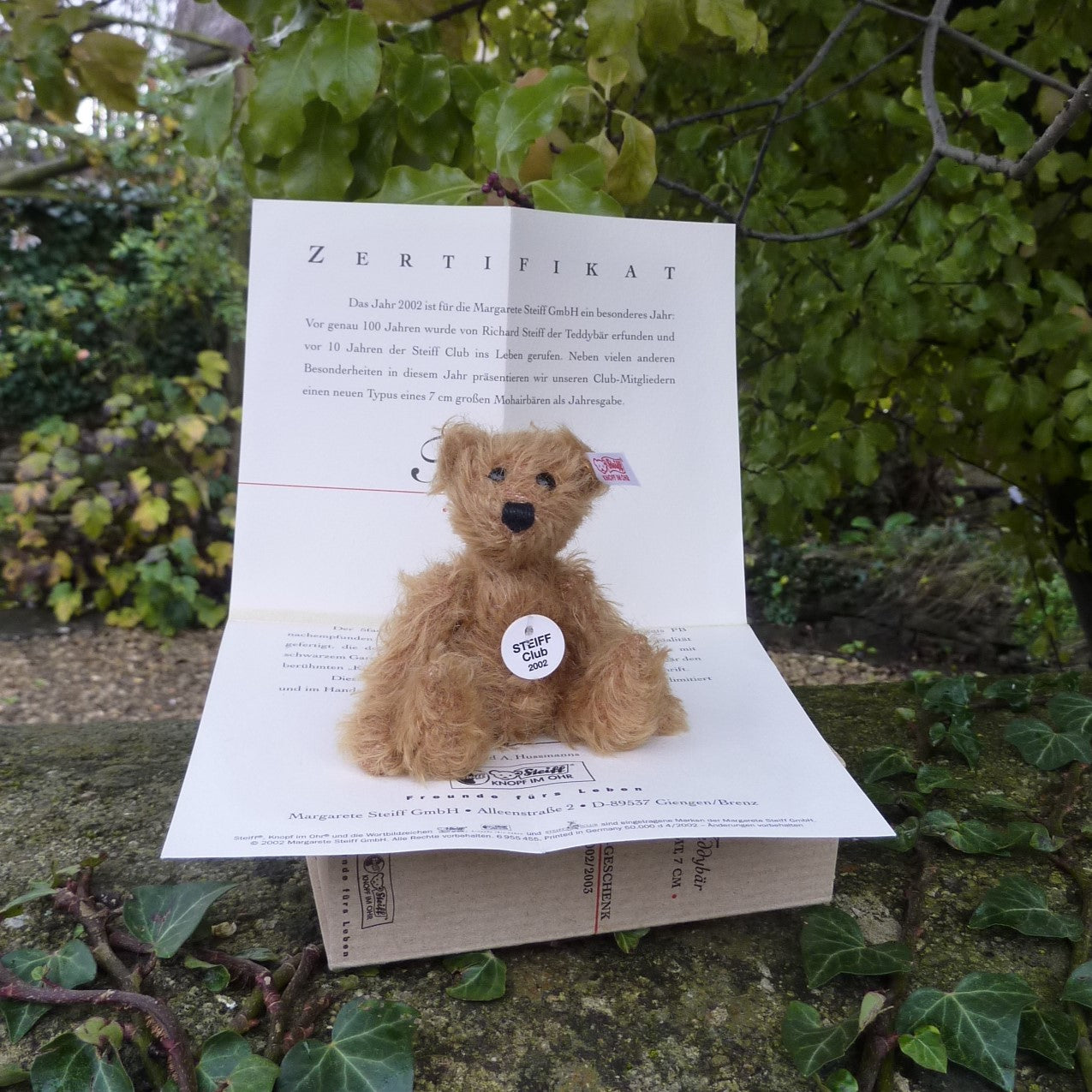This tiny, fully jointed, cone-nosed bear was made exclusively for members of the Steiff Club for the year beginning April 2002. Inspired by a circa 1904 original, he is made of sparse and distressed cinnamon mohair. As new with box and certificate.