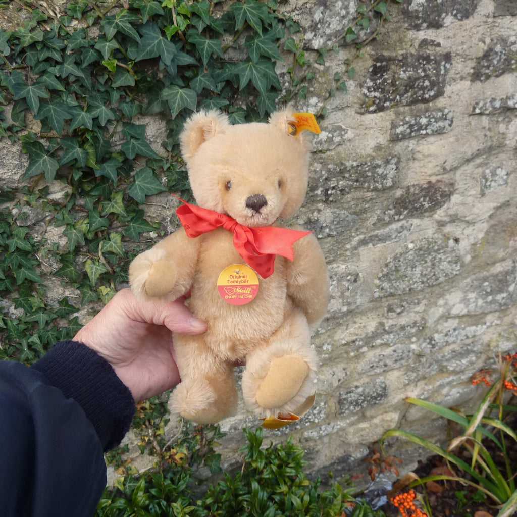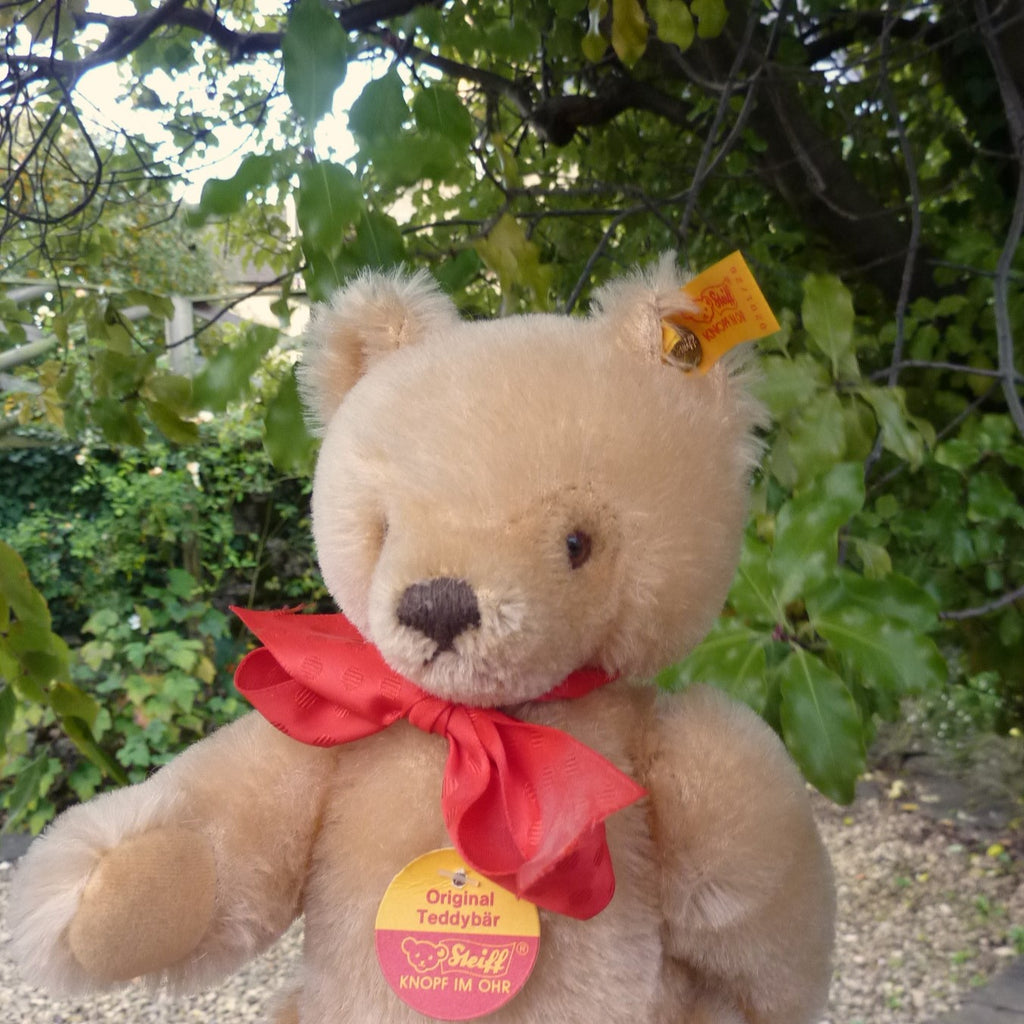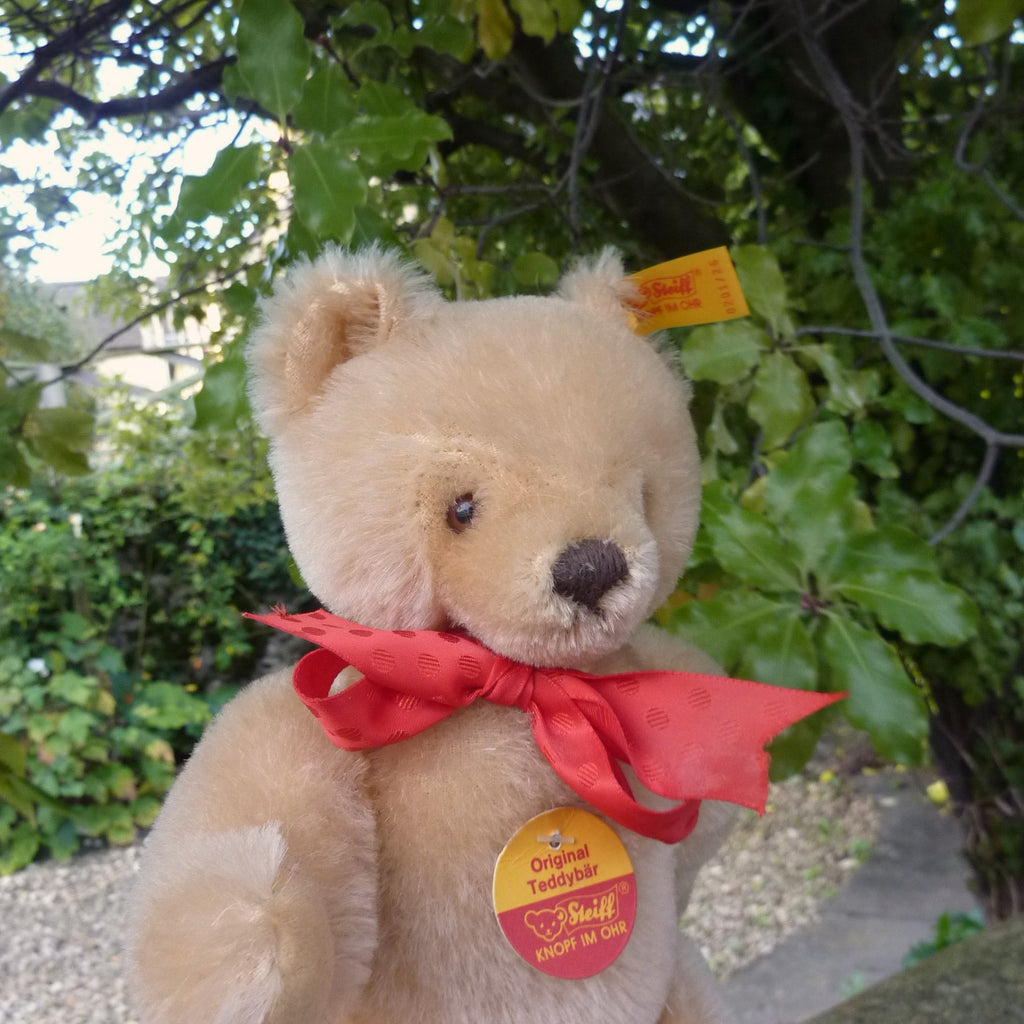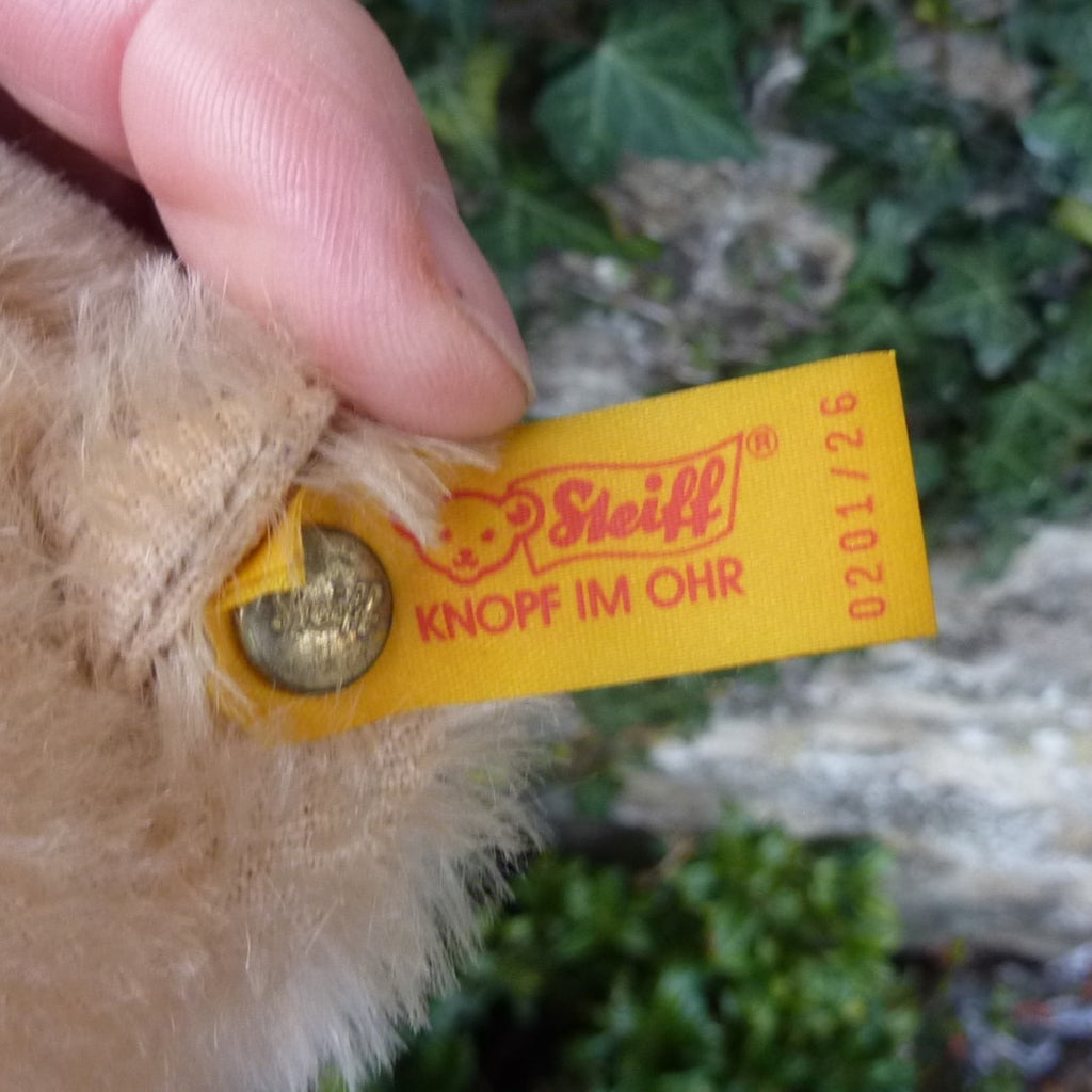 Known colloquially as a ‘mask face’ bear due to the shaved heart-shaped mask face, this small to medium-sized bear is made of dense, short pile honey mohair with brown and black safety eyes and velveteen paw pads. His tie-on tags are aged but the bear is in very good condition with button, ear tag and chest tag.
