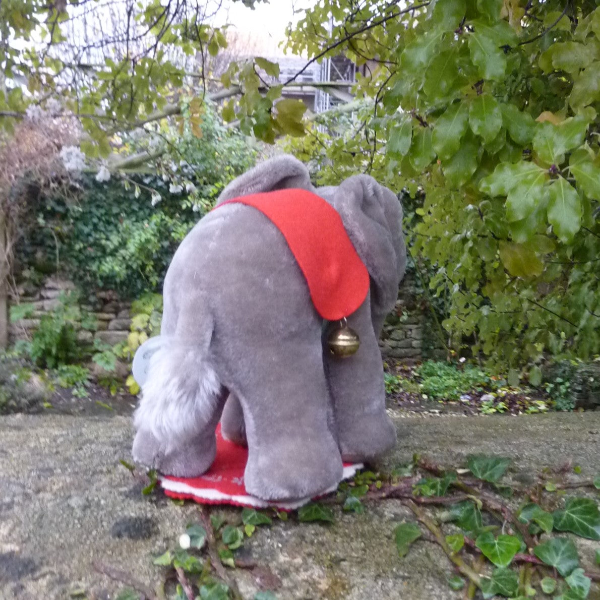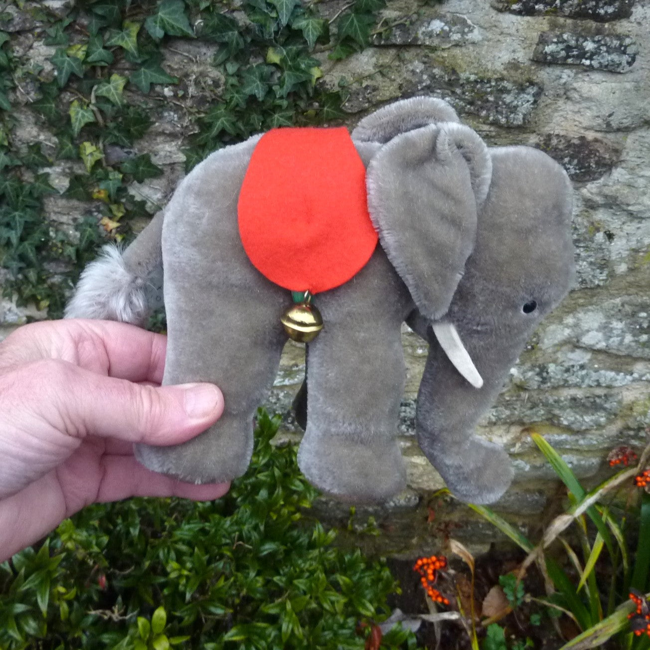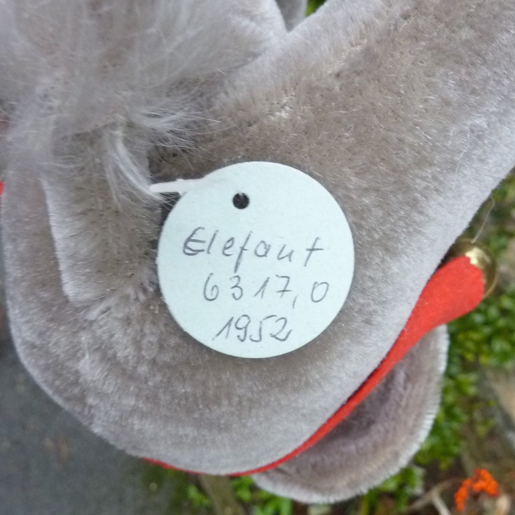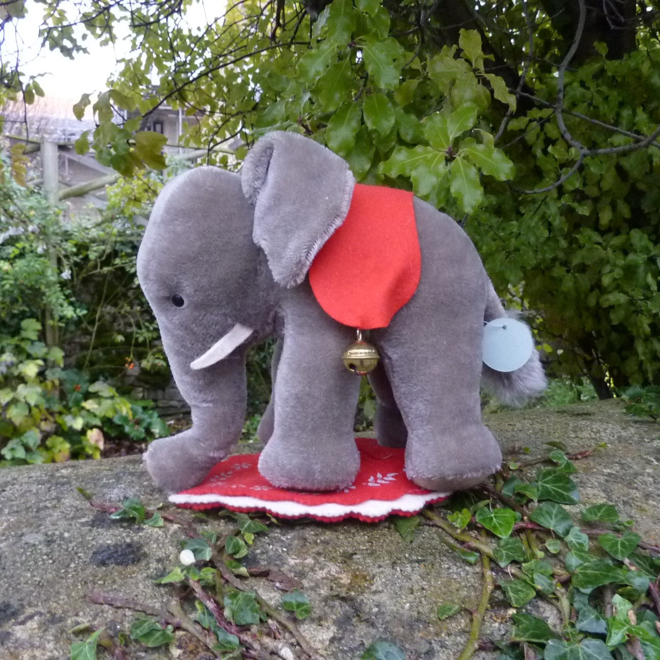 This standing elephant is made of dense grey mohair with black and white glass eyes, felt tusks and a wired trunk. He wears 2 brass bells on his red felt saddle. No button but, otherwise, in mint condition with hand-written Steiff archive label dated 1952 (see photo).