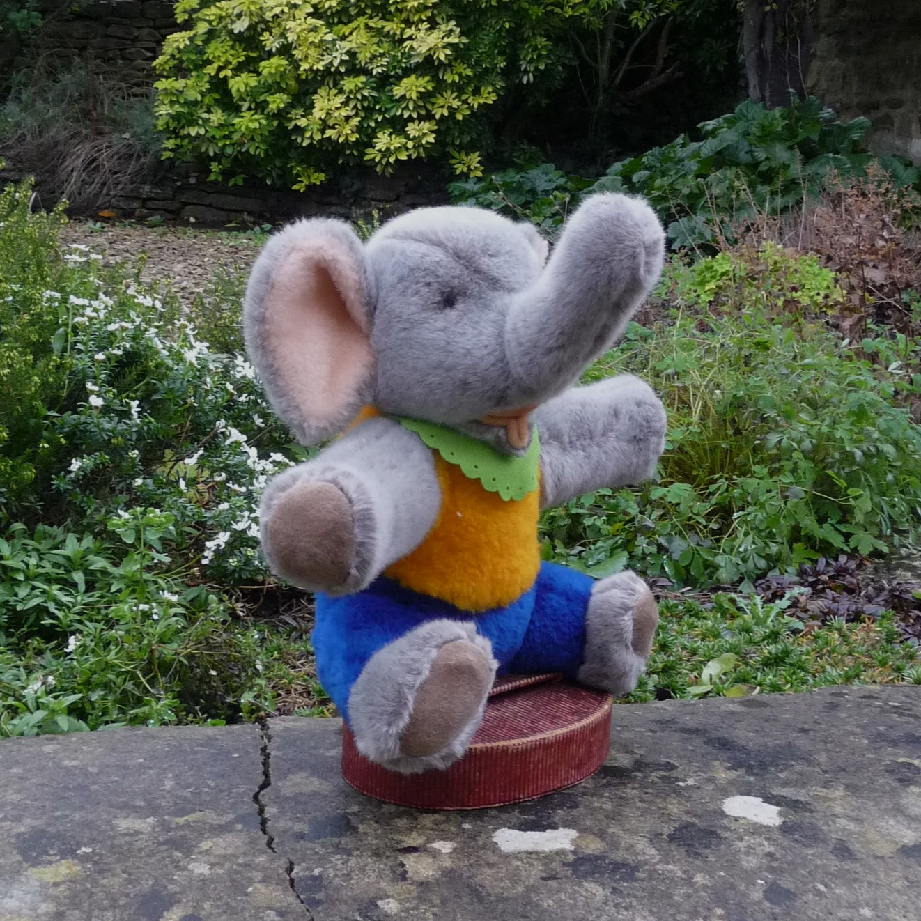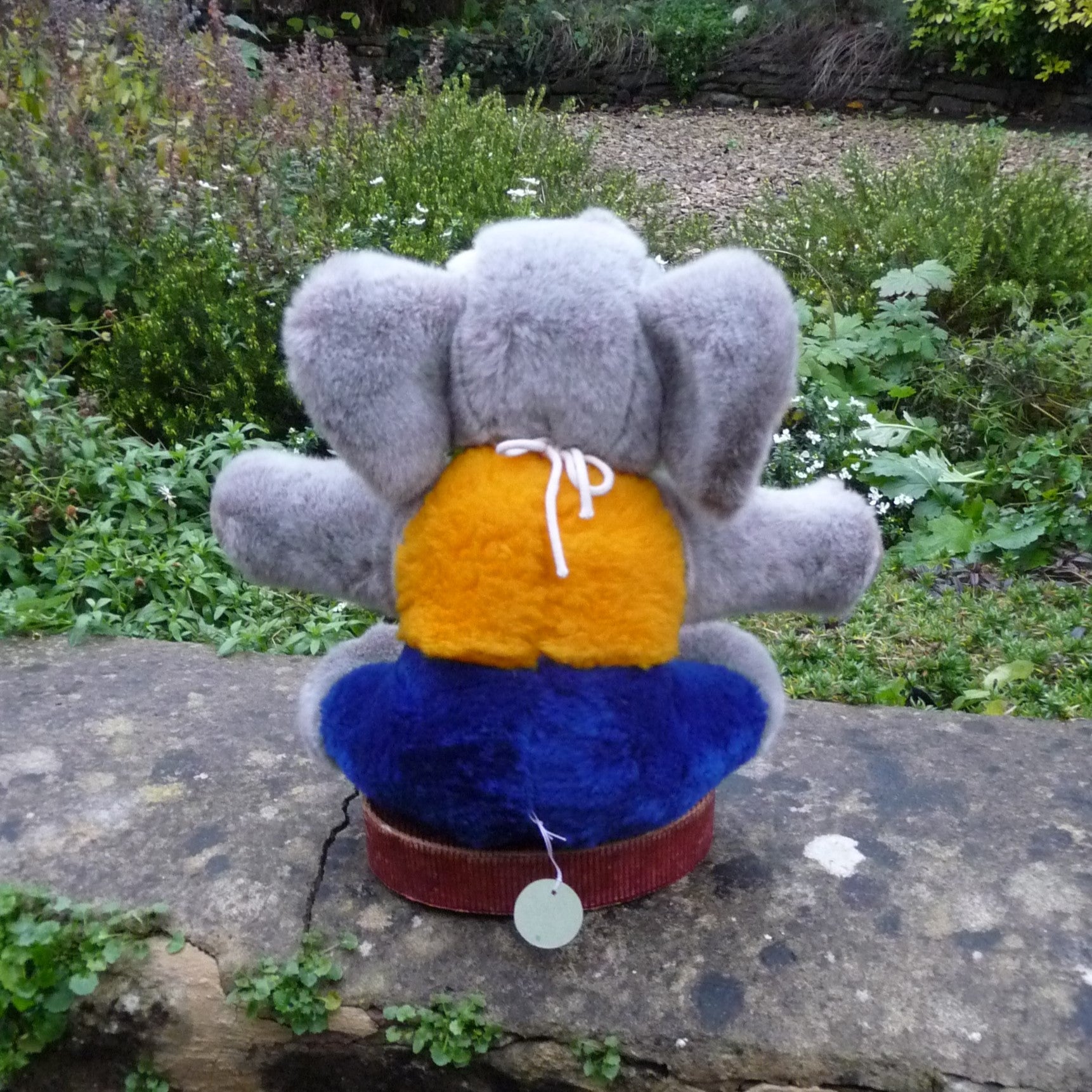 Aptly named, this medium to large-sized elephant is made of textured grey manmade plush with an integral yellow top and blue trousers. He wears a detachable felt bib. No button but, otherwise, in mint condition, with hand-written Steiff archive label dated 1975 (see photo).