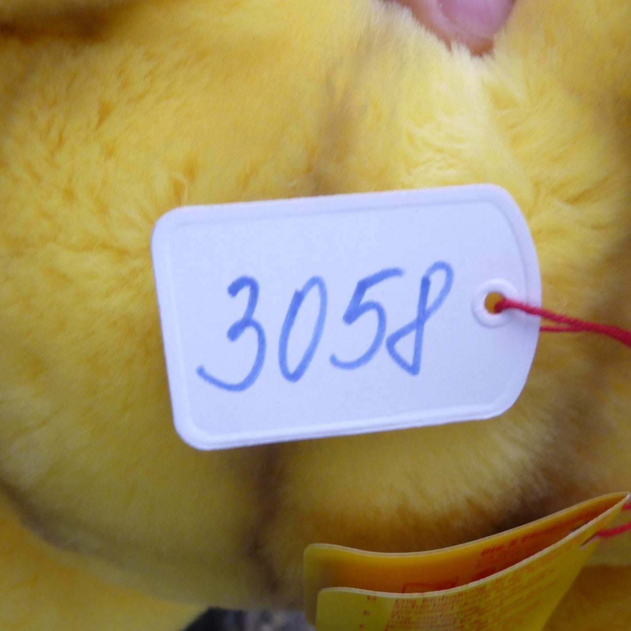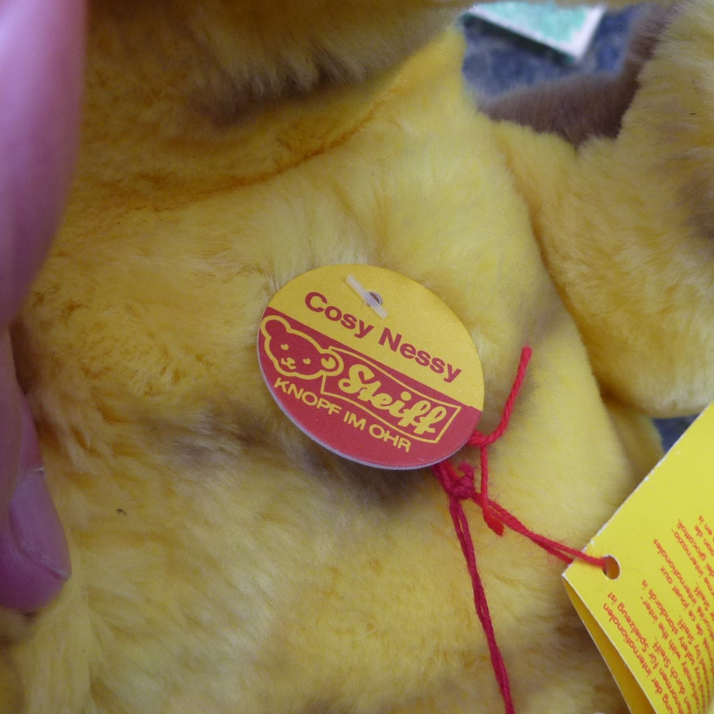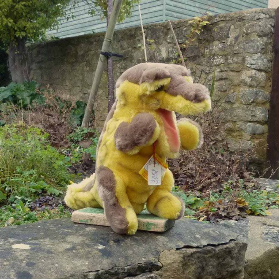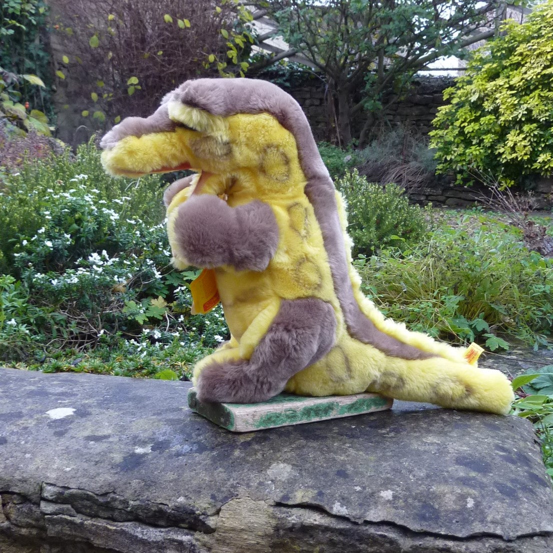 This large, super-soft, standing Nessy monster is made of silky, caramel and yellow manmade plush with airbrushed markings, big green and black safety eyes, and wide-open jaws. In mint condition with button and tag (on tail), and chest tag. No archive label but with a label, numbered 3058, which relates to Steiff’s registered design application at the local court at Heidenheim. (see photo).