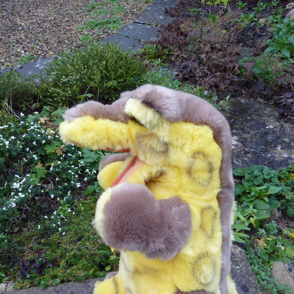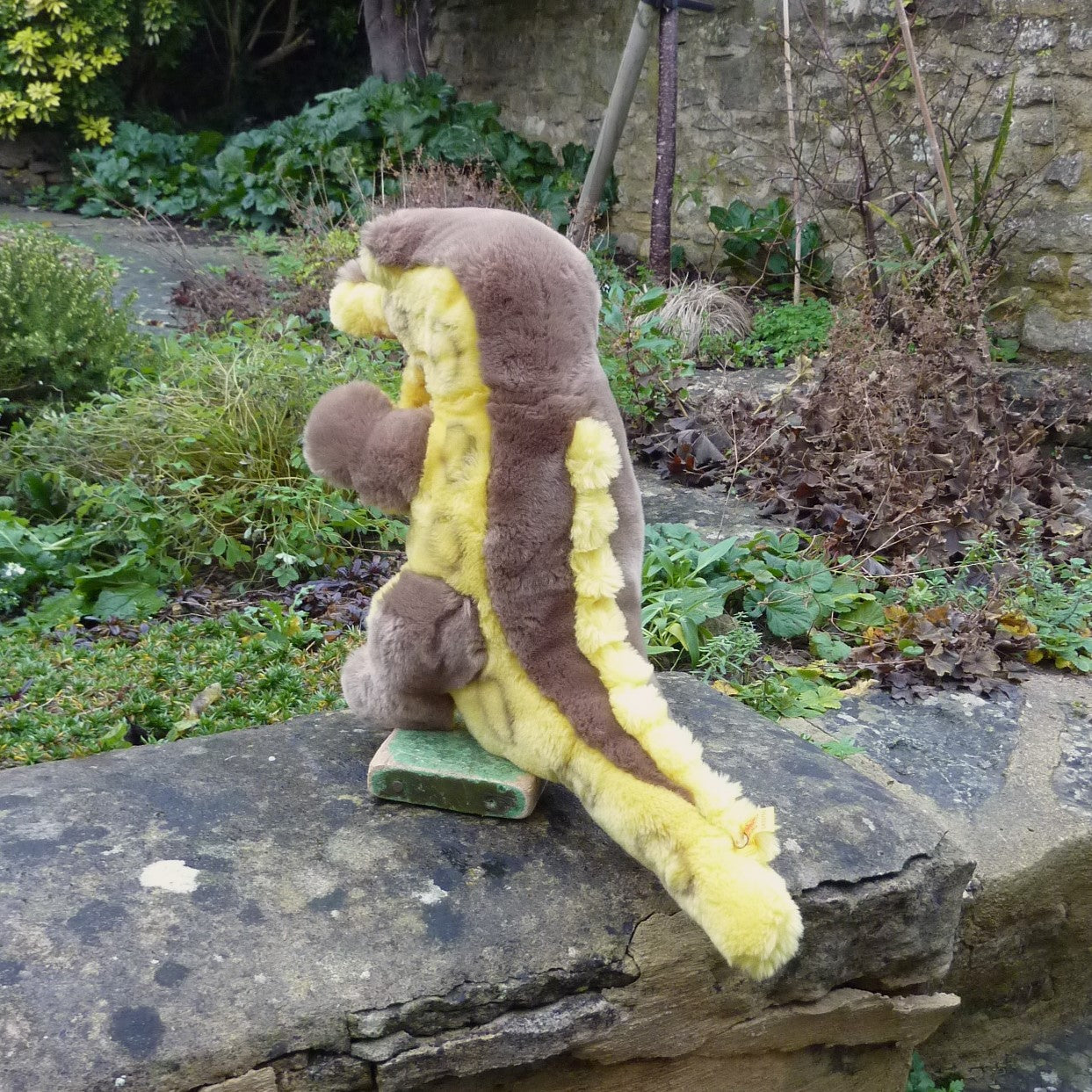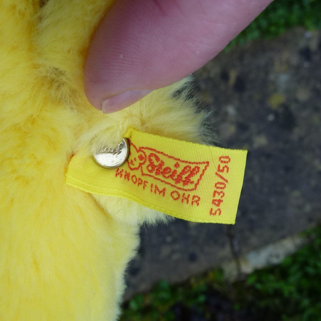 This large, super-soft, standing Nessy monster is made of silky, caramel and yellow manmade plush with airbrushed markings, big green and black safety eyes, and wide-open jaws. In mint condition with button and tag (on tail), and chest tag. No archive label but with a label, numbered 3058, which relates to Steiff’s registered design application at the local court at Heidenheim. (see photo).