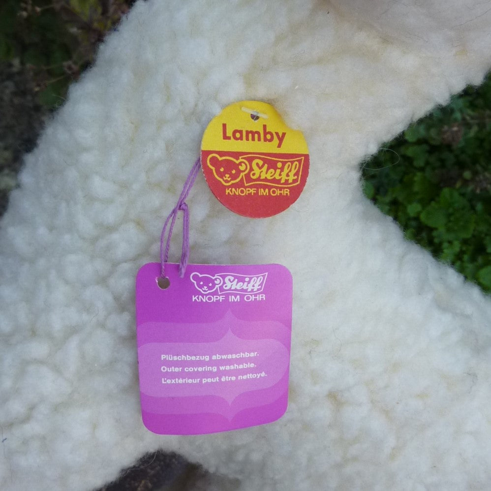 This lovely, almost life-sized lamb is made of soft and knitted, off-white manmade plush with green and black eyes. No button but, otherwise, in mint condition with chest tag and hand-written archive label dated 1978 (see photo). Beautiful. (If bought by someone outside the UK, there will be a GBP50 surcharge towards the airmail cost.)