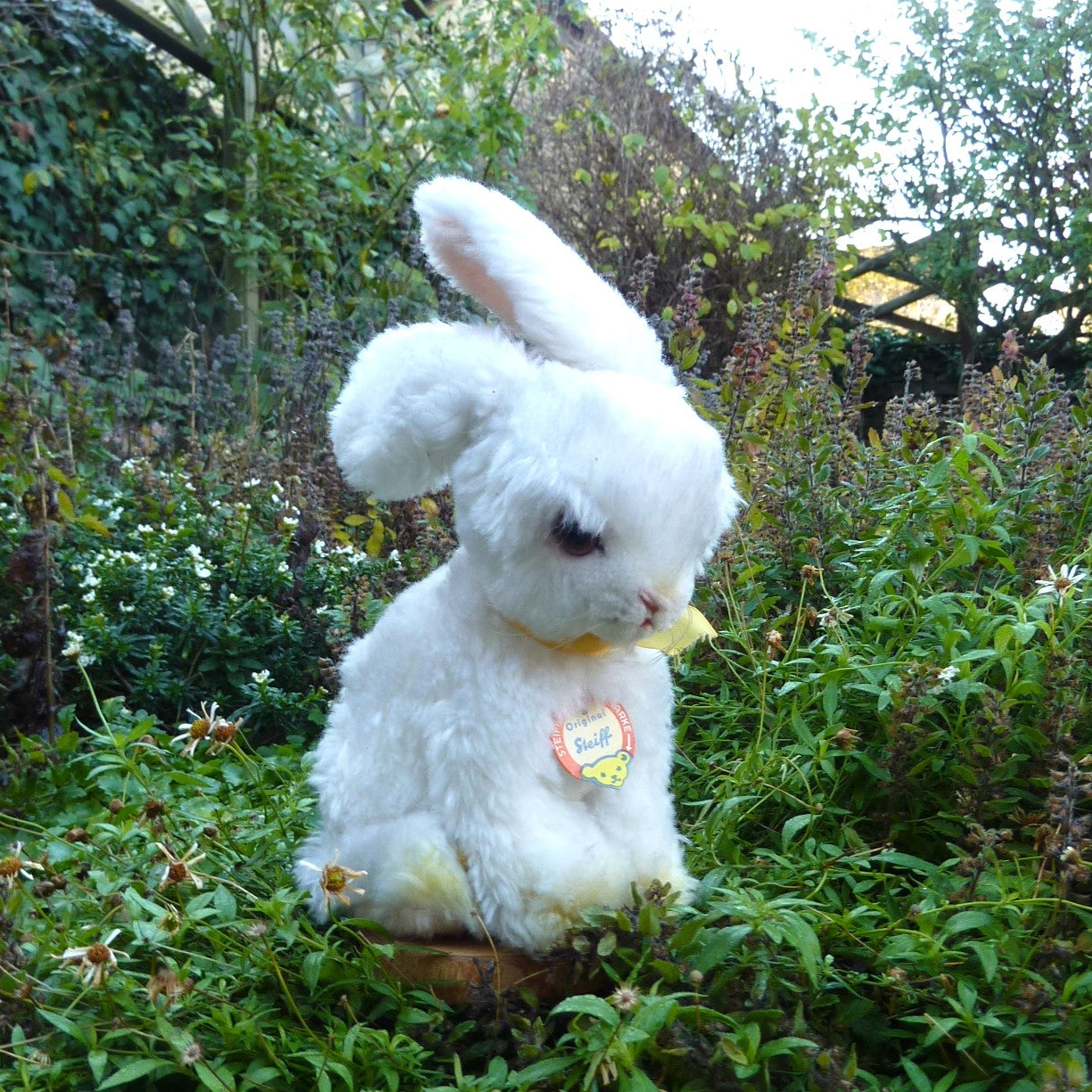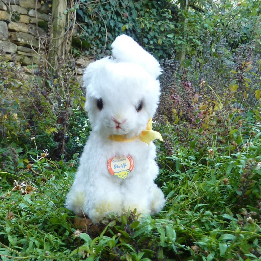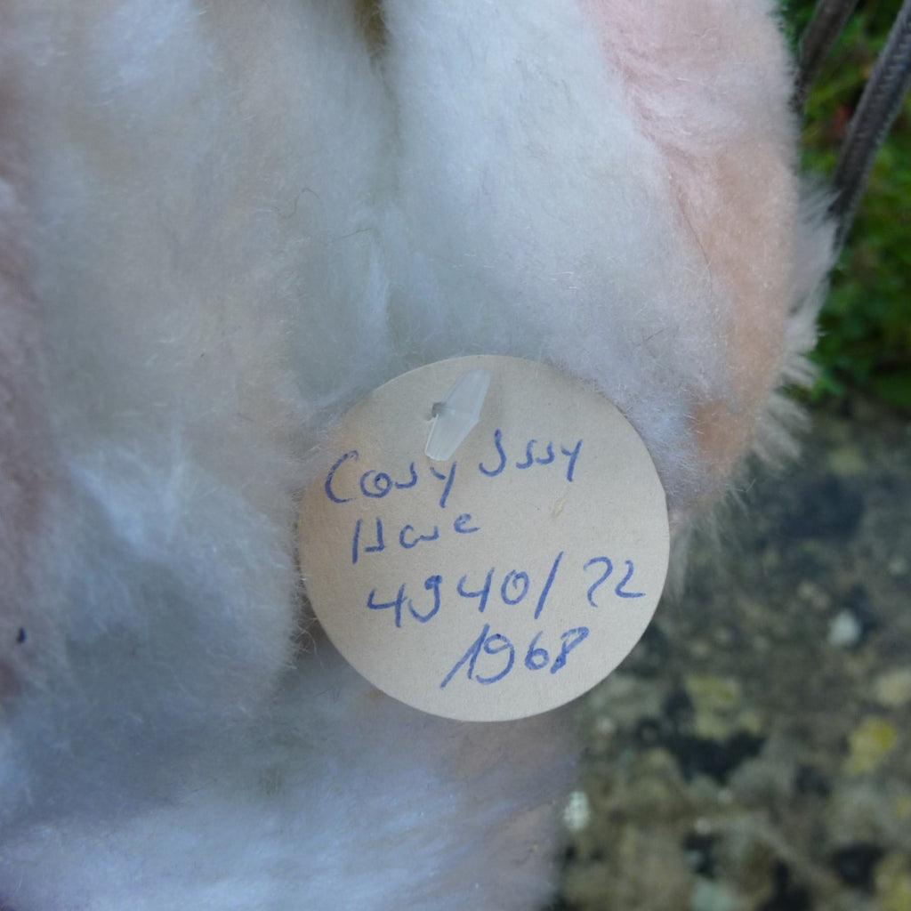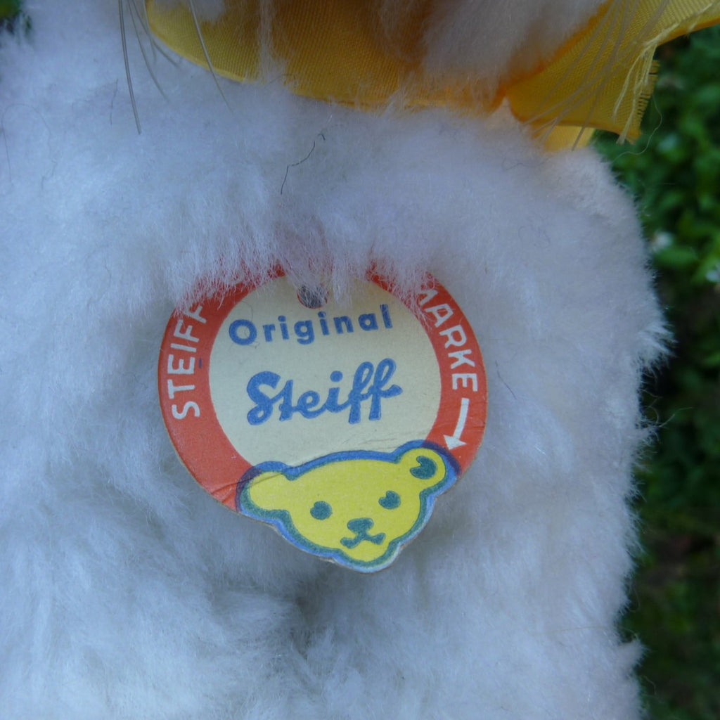 From Steiff’s archives in Giengen, this lovely, non-jointed and very soft rabbit is made of long pile, off-white manmade plush with brown and black eyes (believed glass) and whiskers. Never with button but in excellent condition with chest tag, original ribbon and Steiff archive labeldated 1968 (see photo).