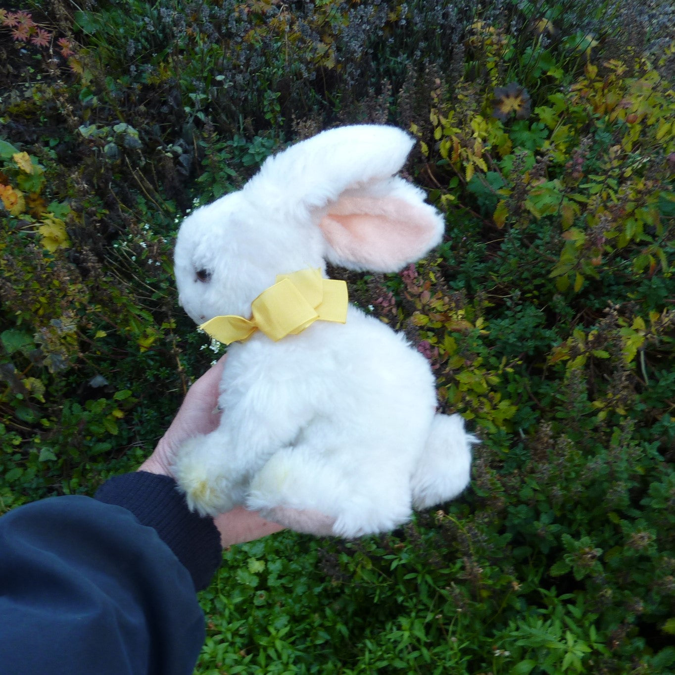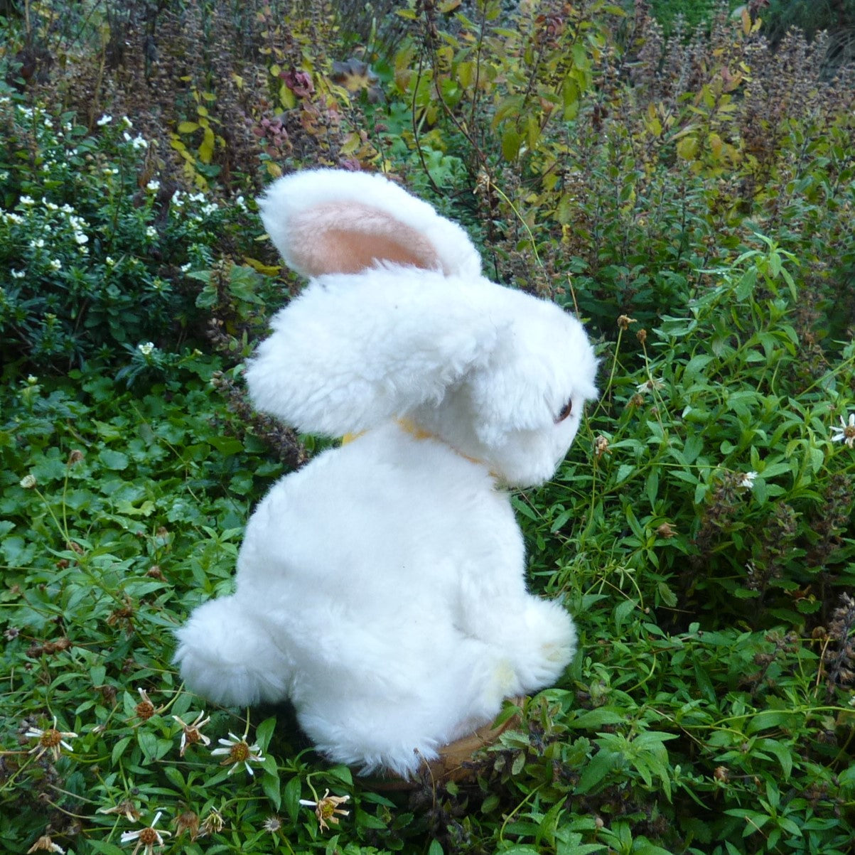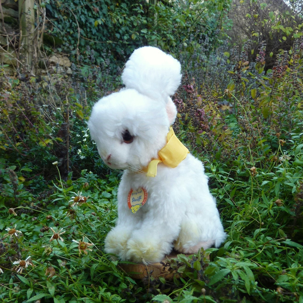 From Steiff’s archives in Giengen, this lovely, non-jointed and very soft rabbit is made of long pile, off-white manmade plush with brown and black eyes (believed glass) and whiskers. Never with button but in excellent condition with chest tag, original ribbon and Steiff archive labeldated 1968 (see photo).