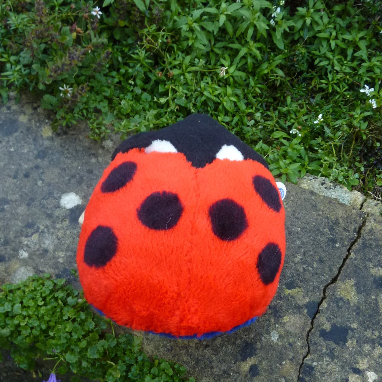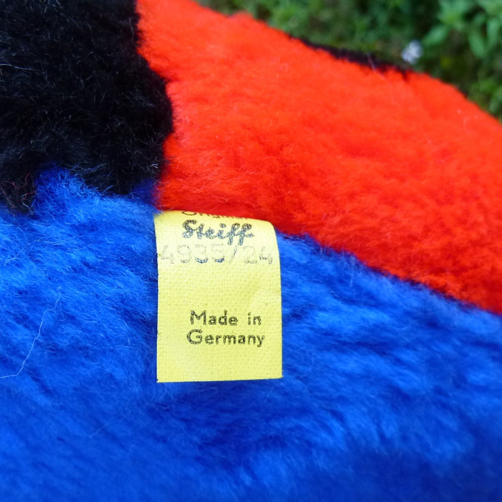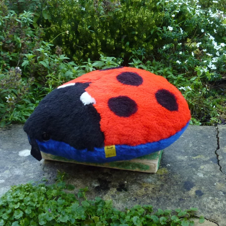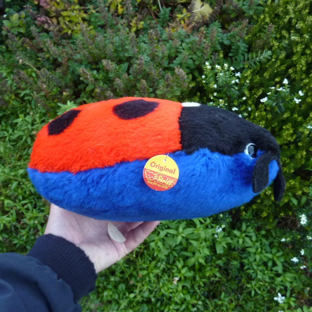 Large, light in weight, HIGHLY unusual and fun, this ladybird is made of red, black and blue Dralon plush with large white and black safety eyes, and felt antennae. Never with button but with sewn-in 4935/24 label, side tag and hand-written archive label dated 1972 (see photo).