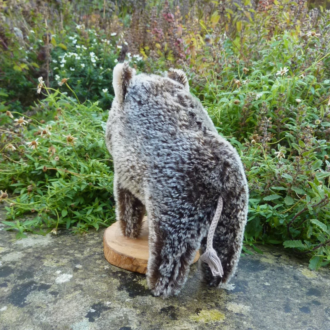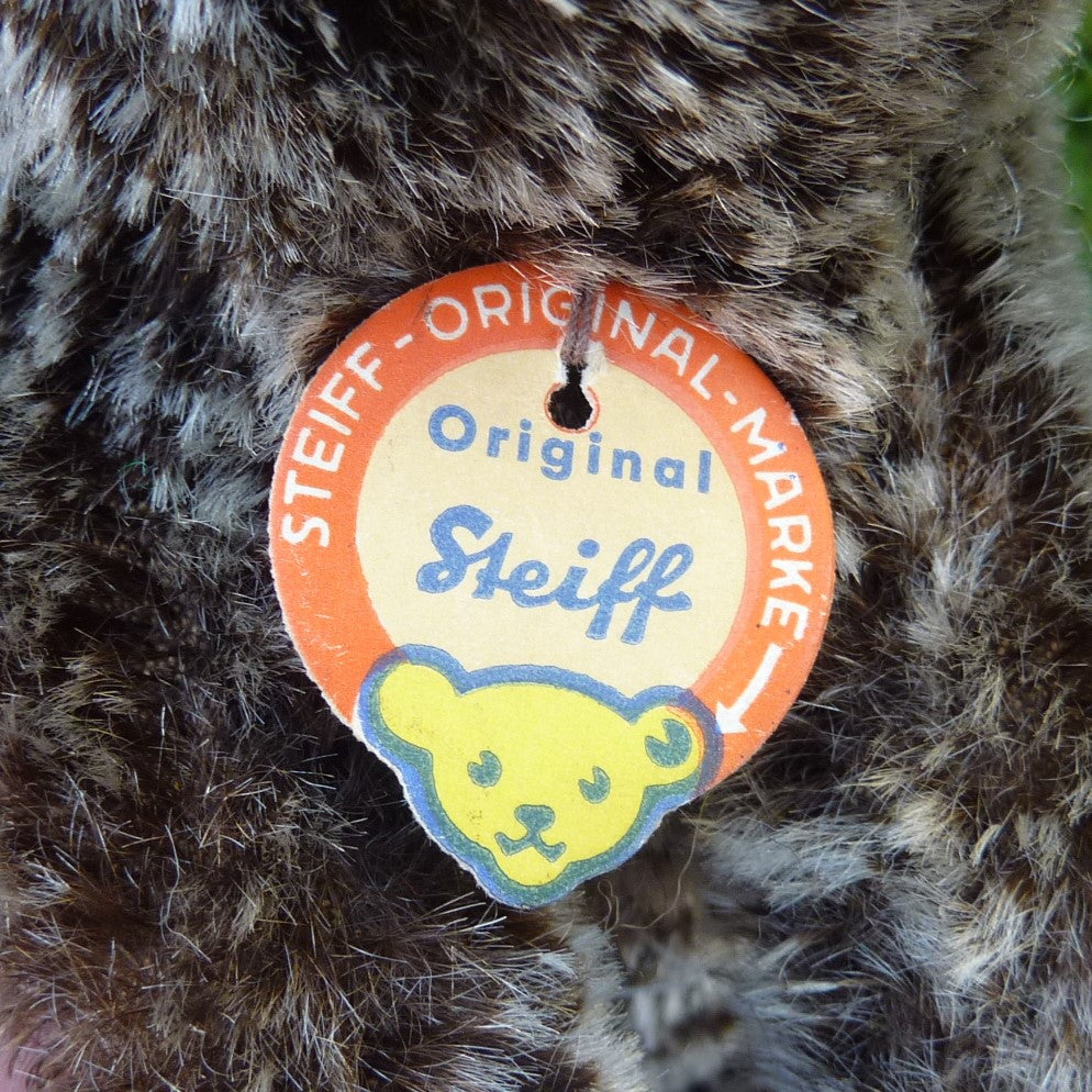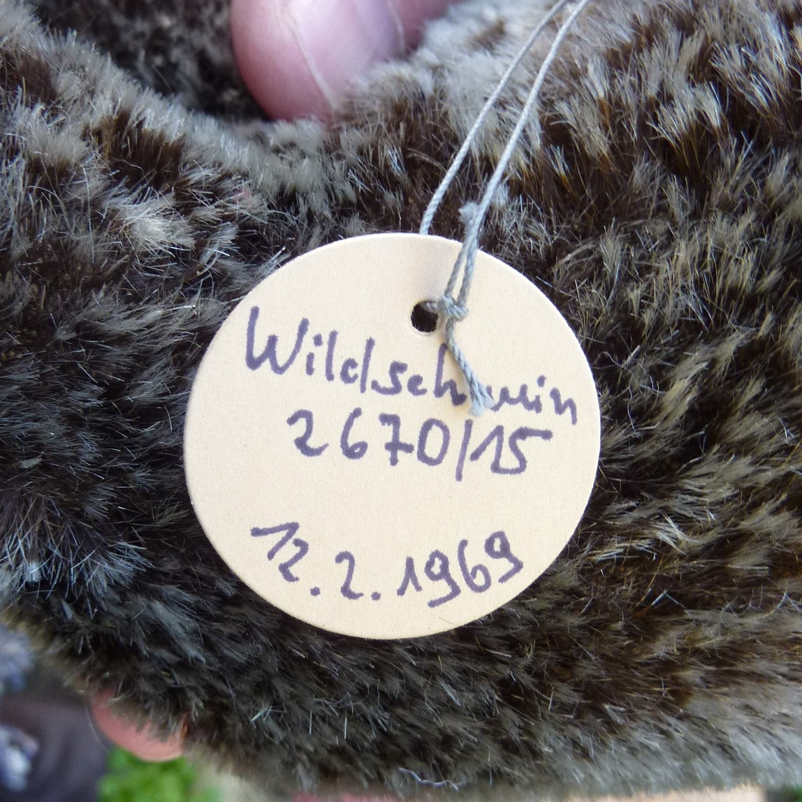This attractive, non-jointed wild boar is made of soft and tipped, dark brown mohair with brown and black safety eyes and plastic tusks. Never with buton. In mint condition with chest tag and. Steiff archive label dated 1969 (see photo).