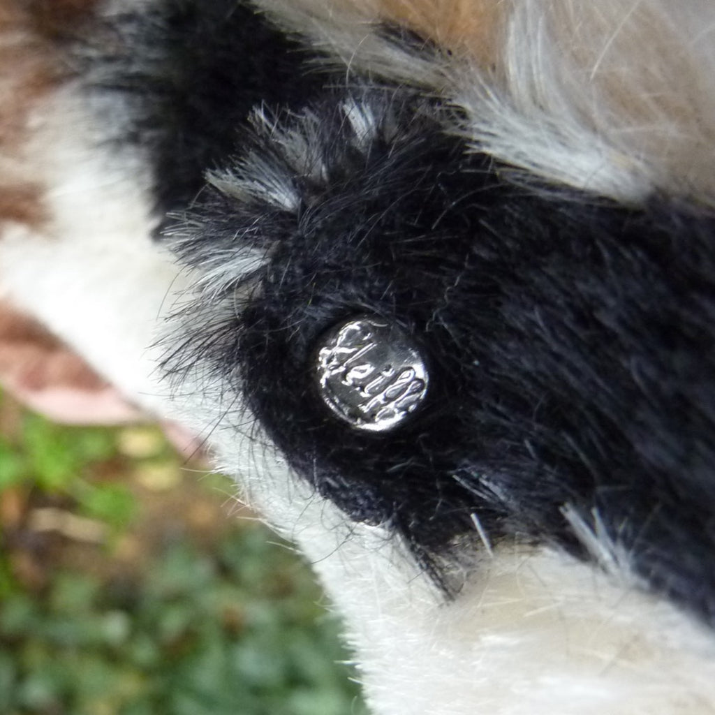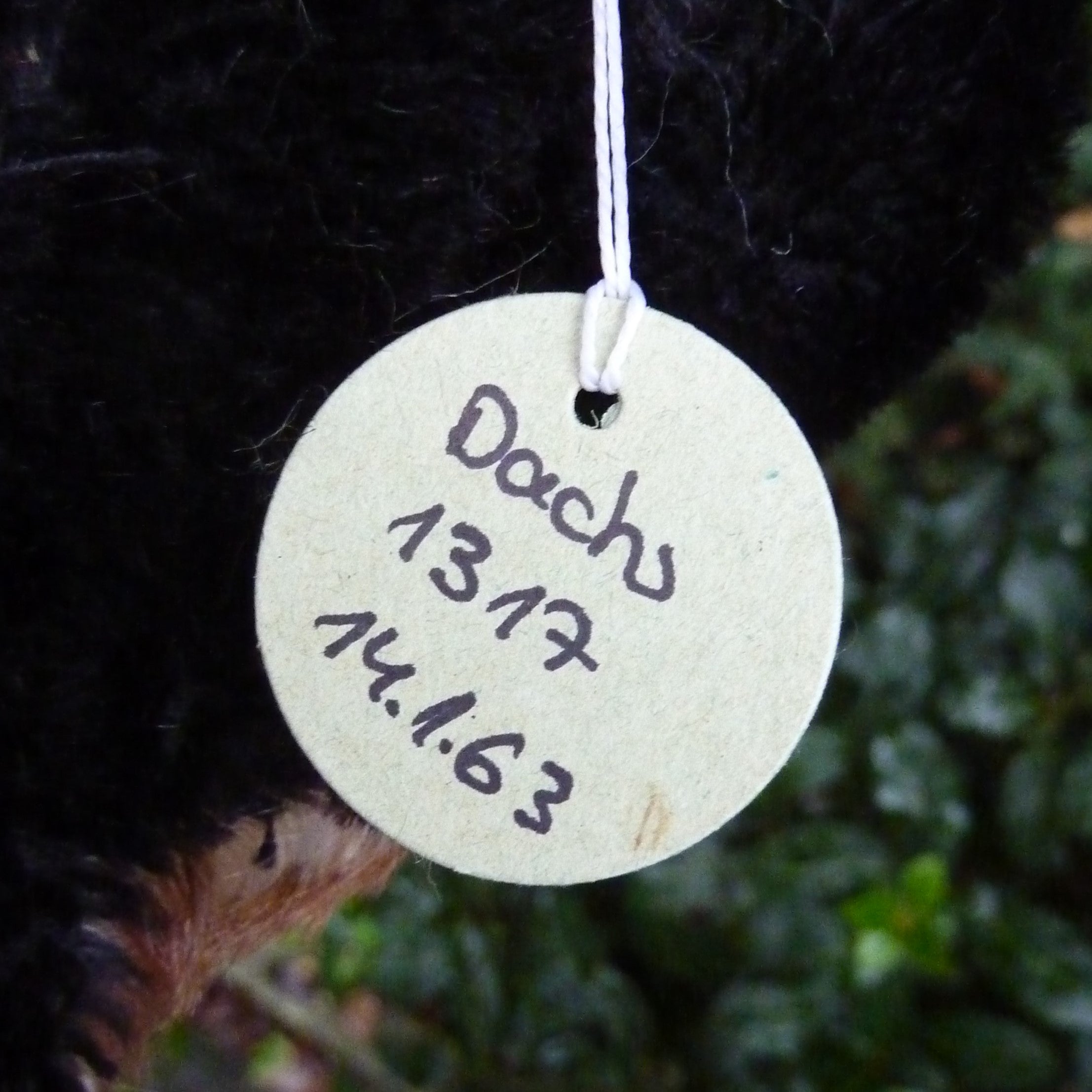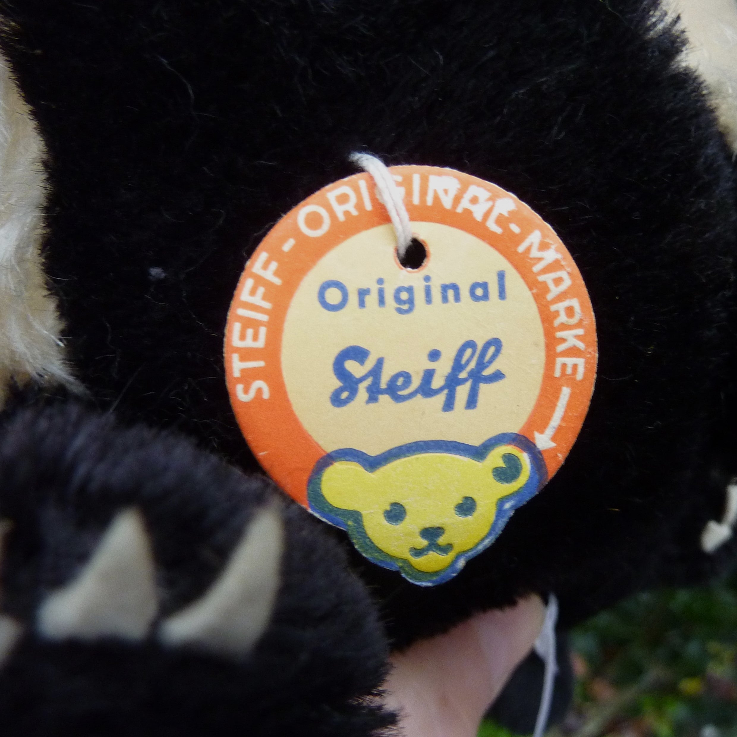 Made of black, off-white (in 2 different textures) and brown-tipped mohair, this hard-to-find badger has brown and black glass eyes and felt feet. In excellent, fresh condition with button and chest tag, as well as hand-written Steiff archive label dated 14.1.63 (see photo).