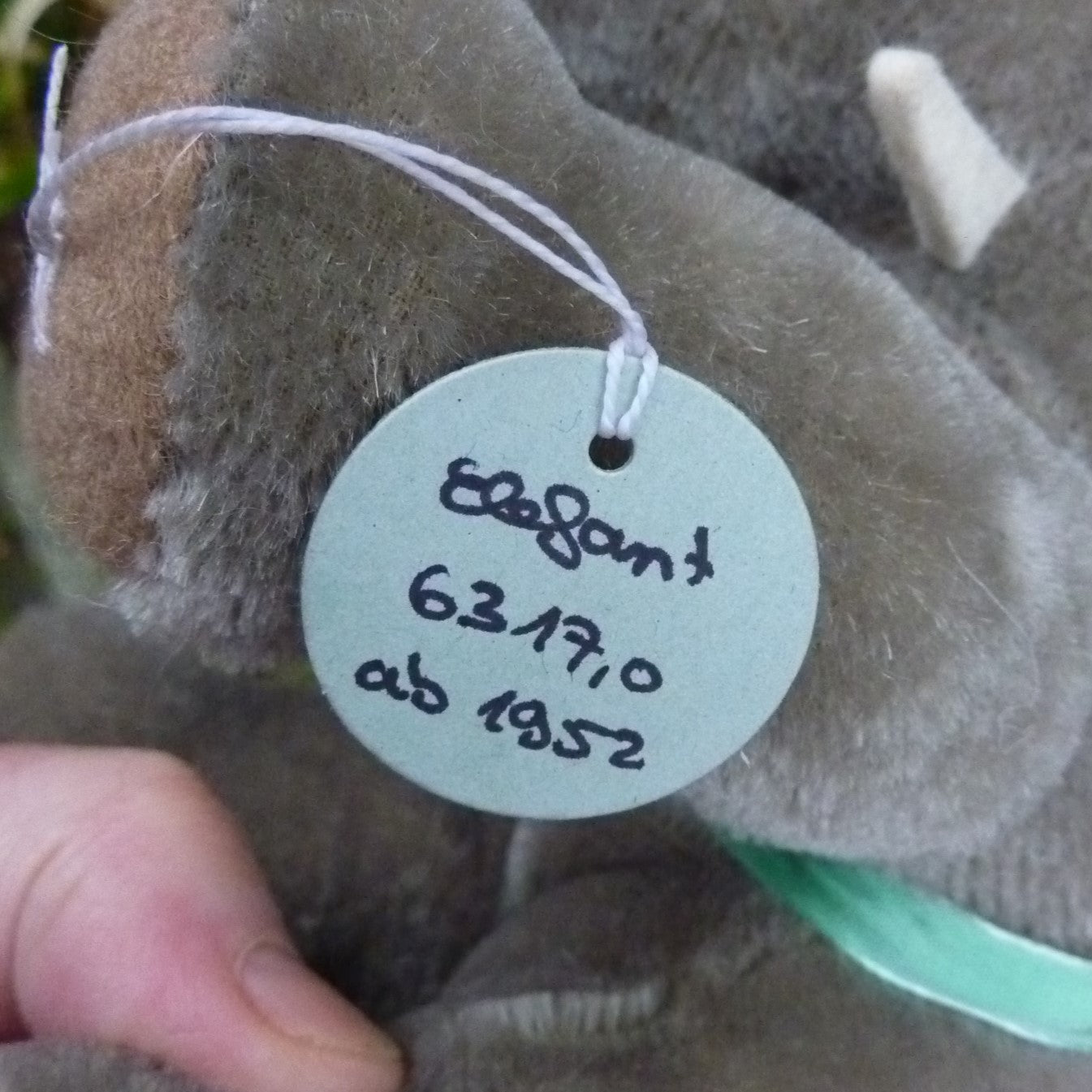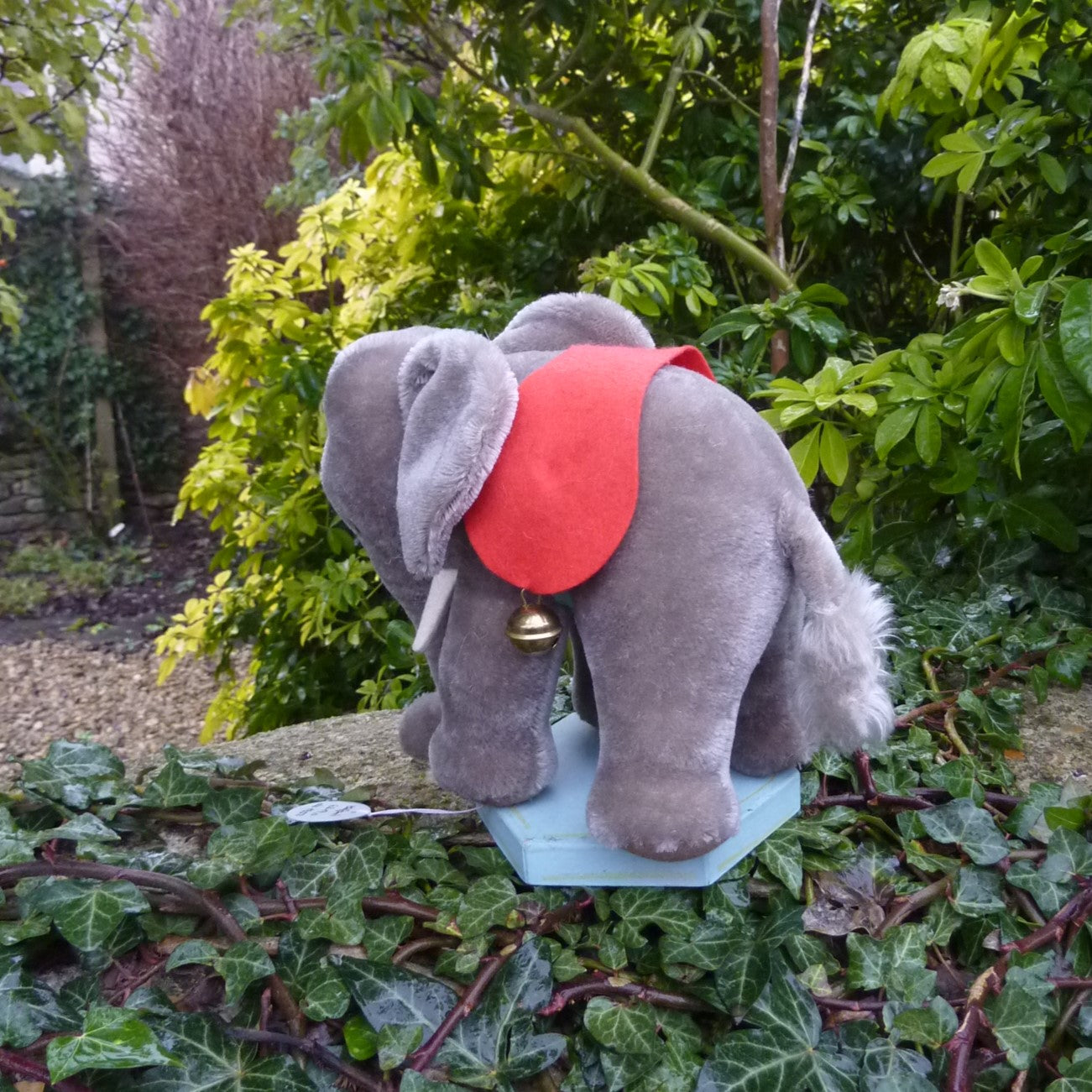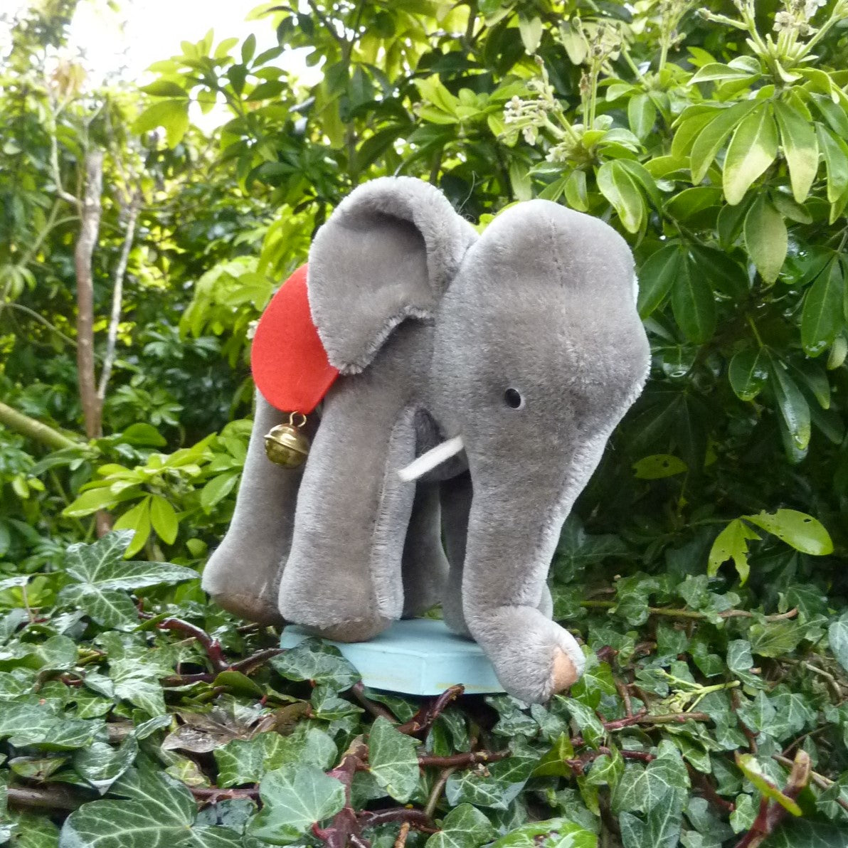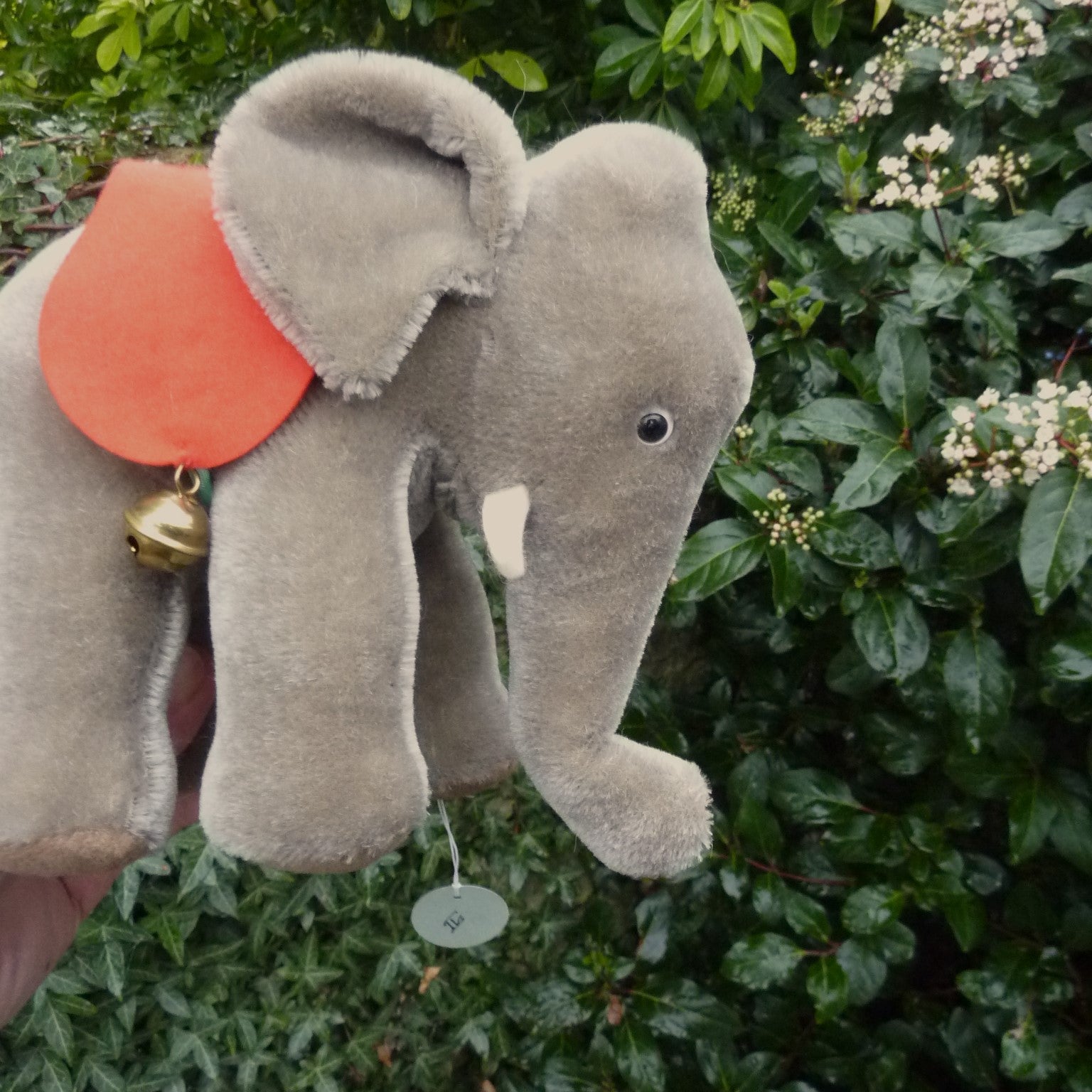 This standing elephant is made of dense grey mohair with deeply set black and white plastic eyes and felt tusks. He wears 2 brass bells on his red felt saddle. No button but in mint condition with hand-written Steiff archive label dated 1952 (see photo).