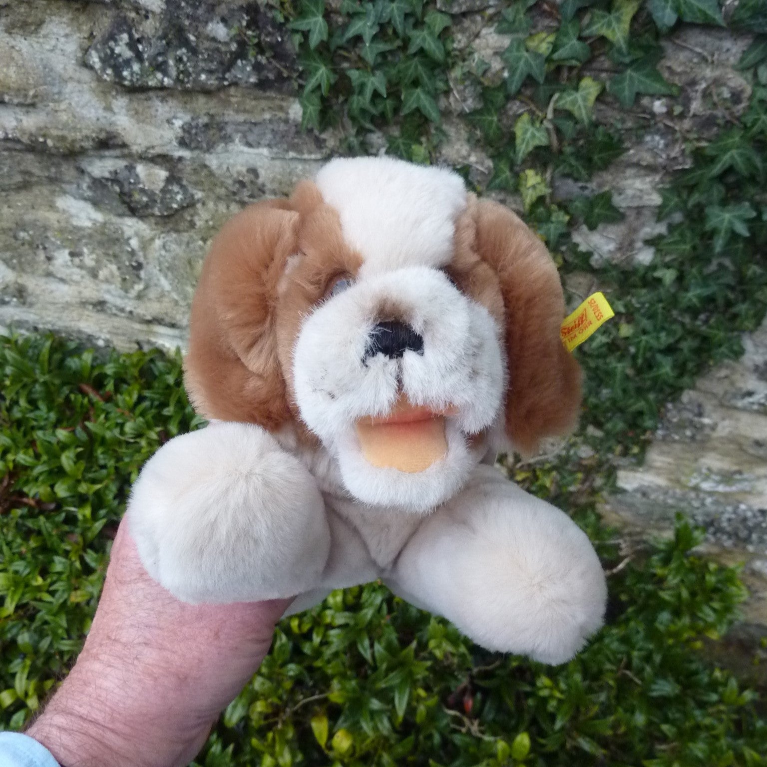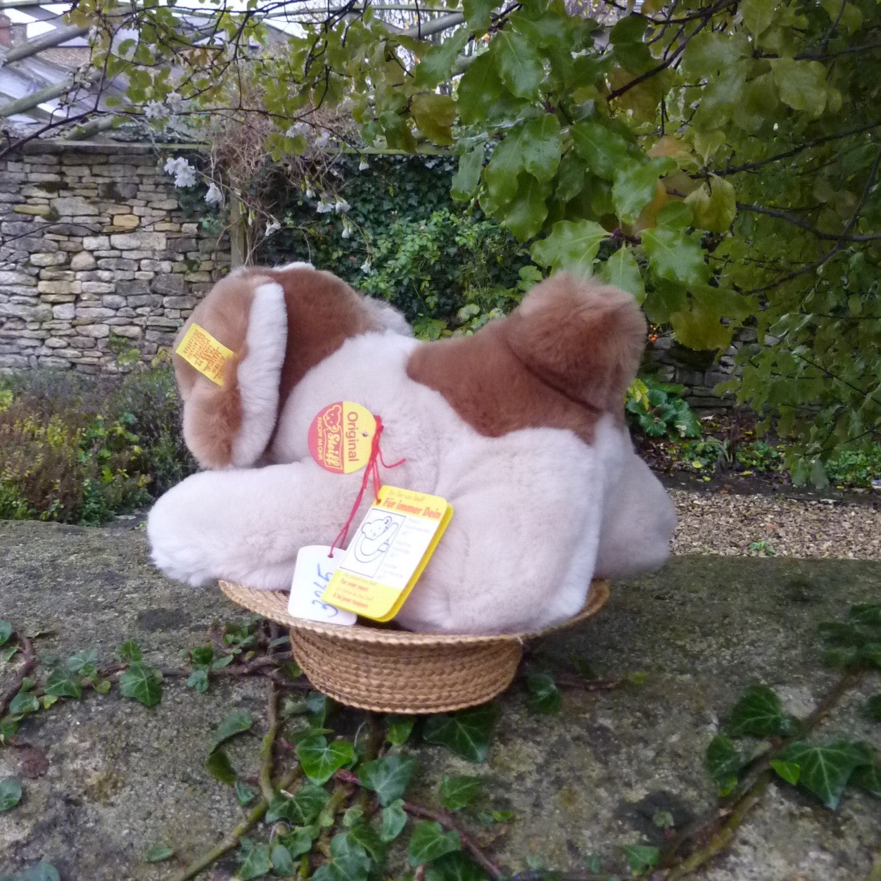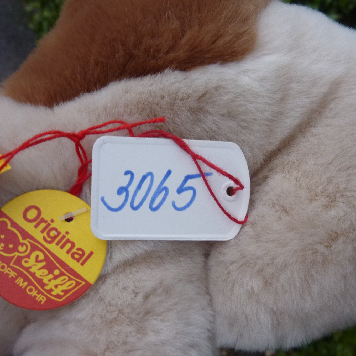 This cute and super-soft puppy is hand-made of pale beige and light brown manmade plush with large brown and black safety eyes, and an open mouth. In mint condition with all ID. No archive label but with a label, numbered 3065, which relates to the registered design application at the local court at Heidenheim. (see photo).