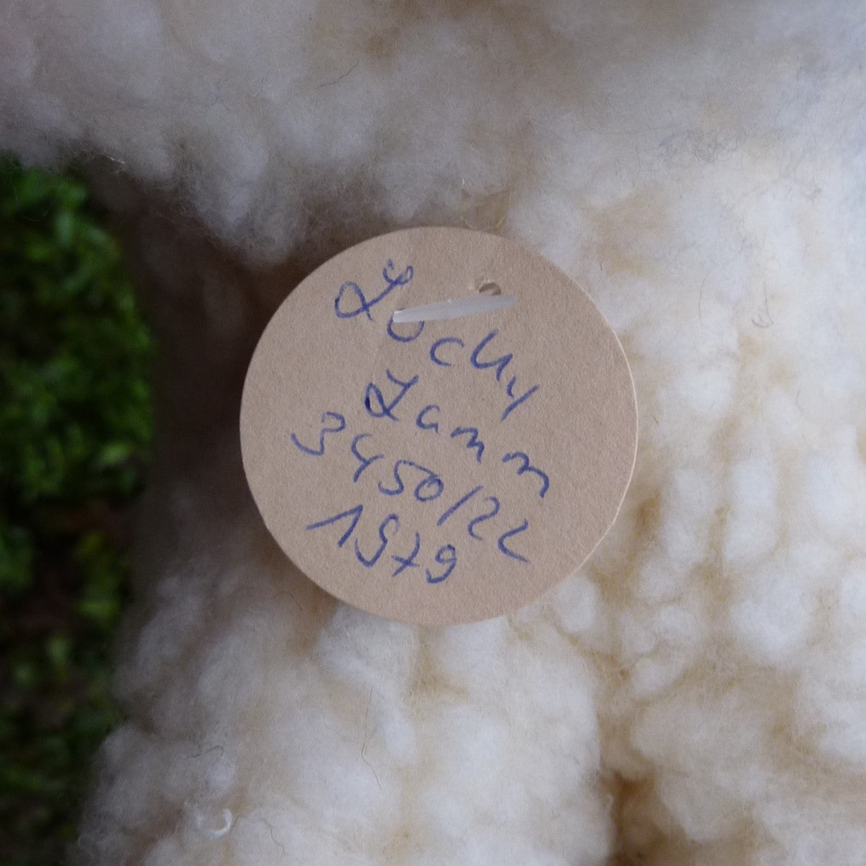 This very cute lamb is made of soft and textured, warm white manmade plush with green and black safety eyes. Never with button but in mint condition with chest tag, original ribbon and hand-written archive label dated 1979.