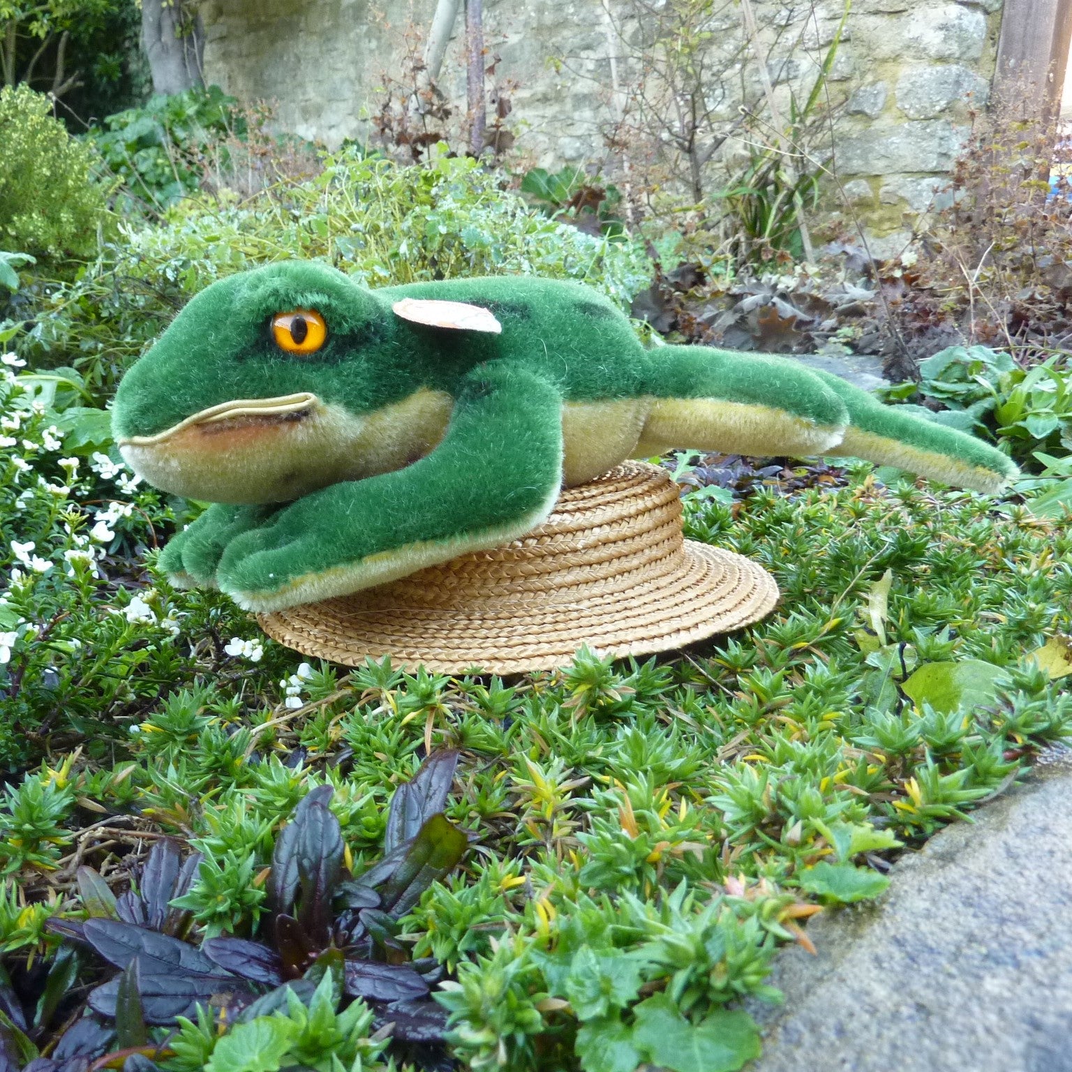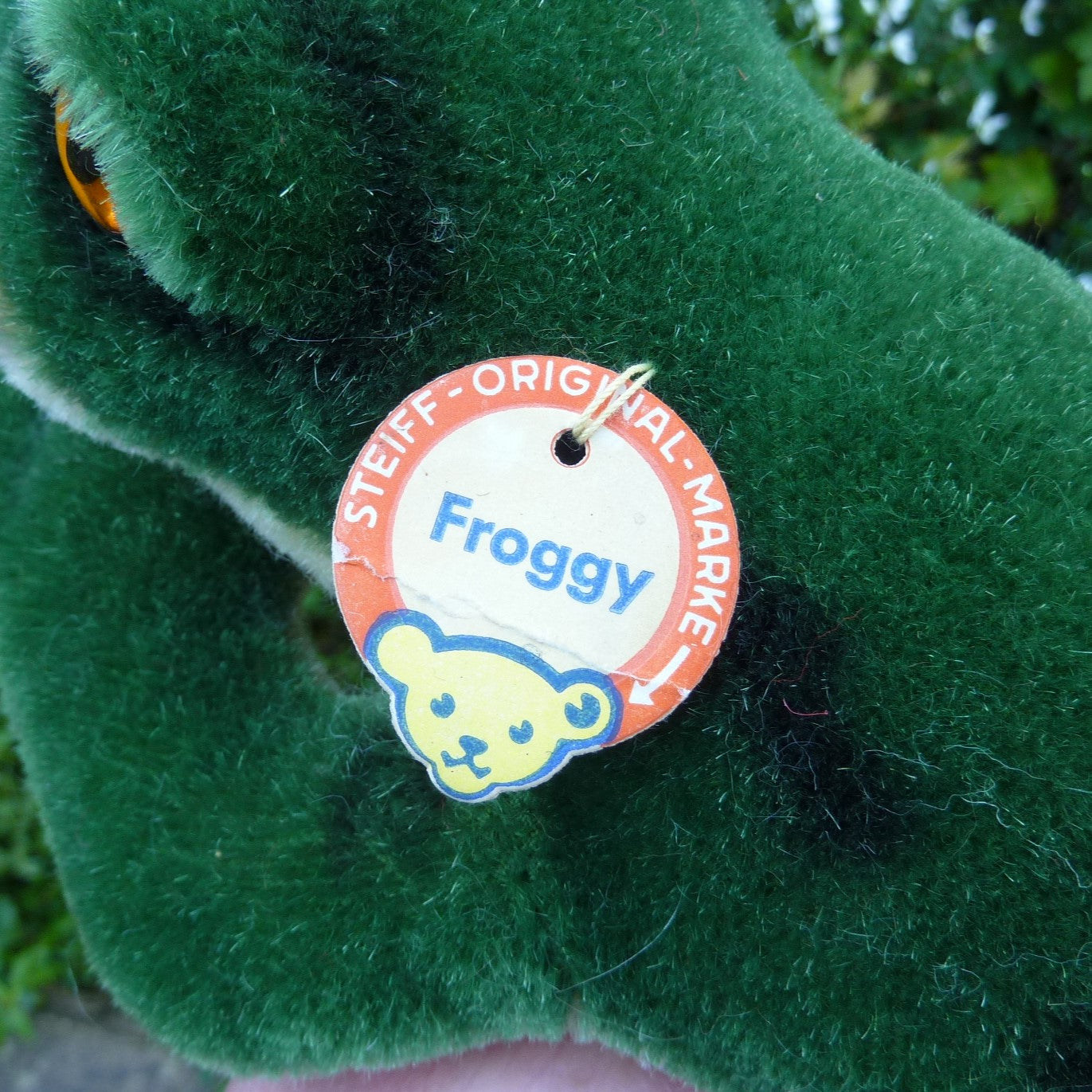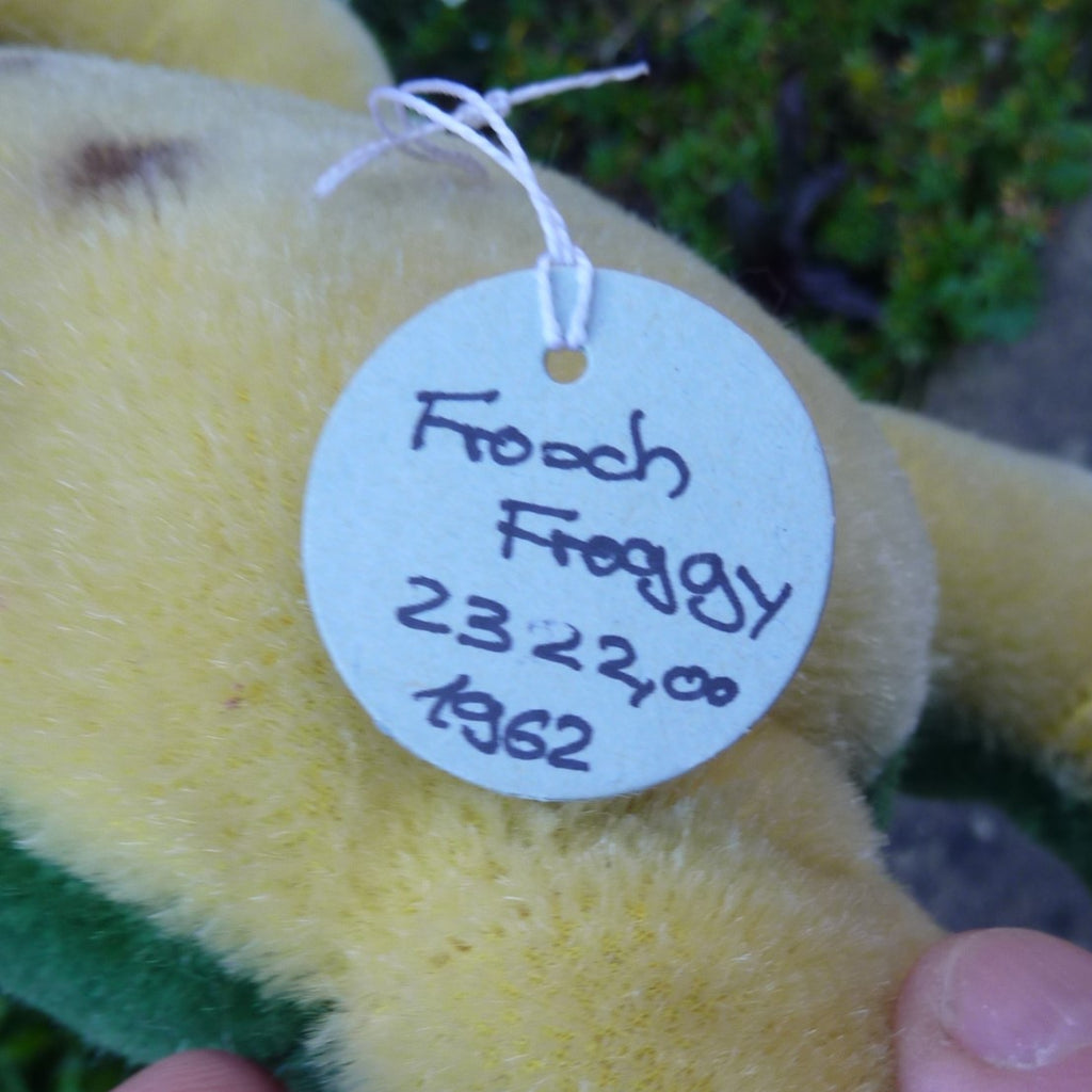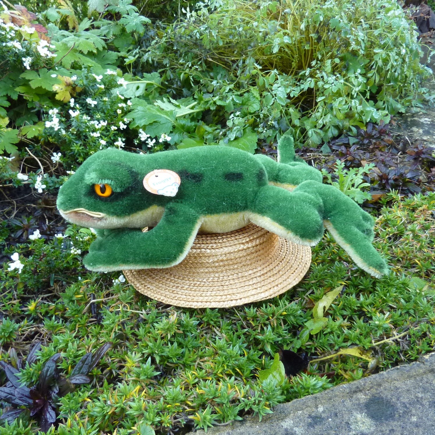 This non-jointed, crawling frog is made of dense, short pile, dark green and pale yellow mohair, with subtle airbrushed detail and large orange and black glass eyes. Never with button but in excellent condition with side tag and original, hand-written Steiff archive label dated 1962 (see photo).
