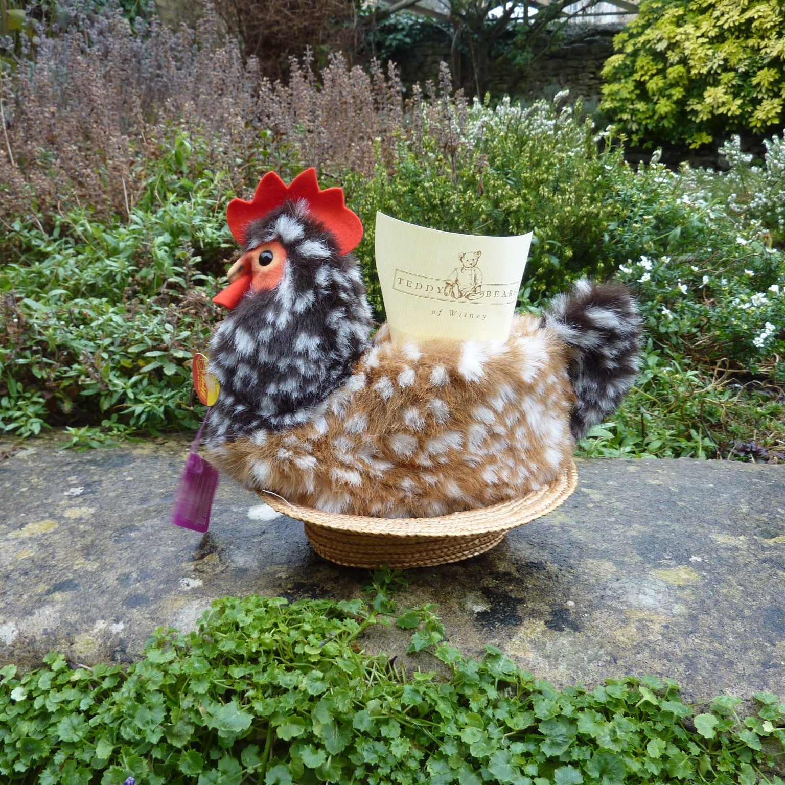 From the Steiff archives, unusual and eye-catching hen is made of speckled brown and black, manmade plush with a felt comb and wattle. Her back opens as a pocket so that she can be used as an egg cosy. Never with button but in mint condition with chest tag and original, hand-written Steiff archive label dated 1978 (see photo).