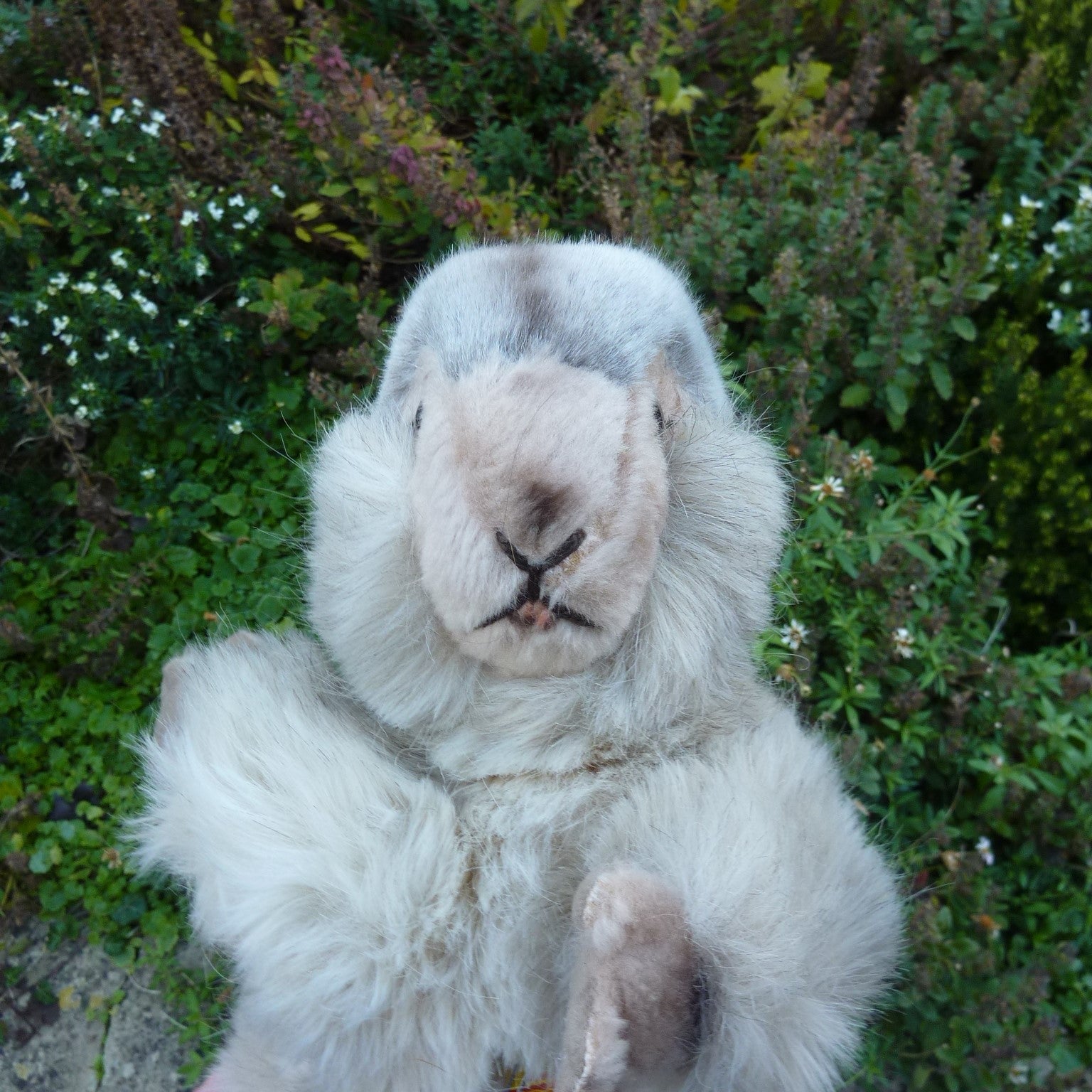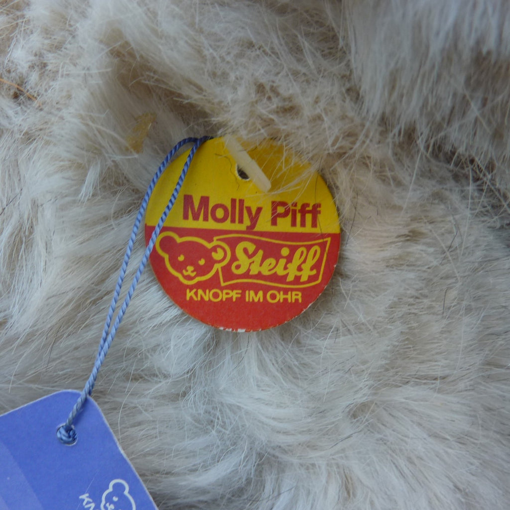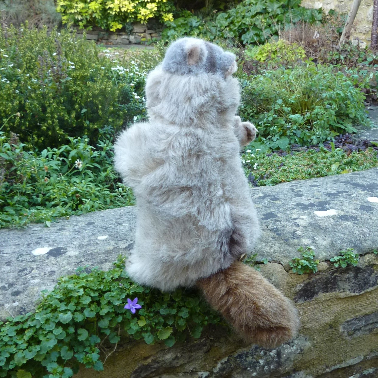 From the Steiff archives, this medium to large-sized marmot is made of soft and dense, long pile caramel-grey manmade plush with brown and black safety eyes, and a bushy brown tail. No button but, otherwise, in mint condition with chest tag and hand-written archive label dated 1976 (see photo).