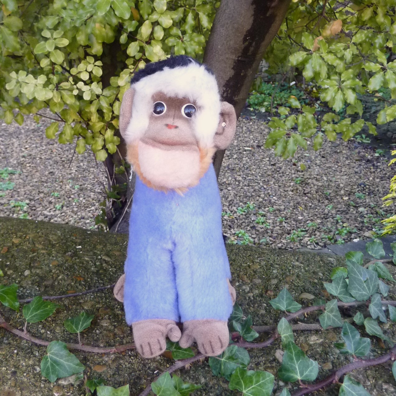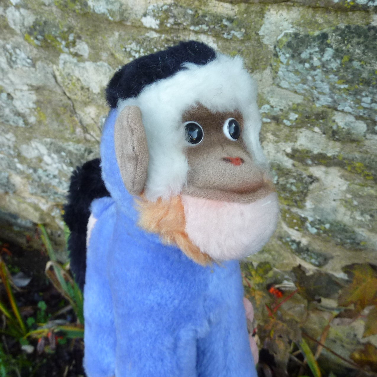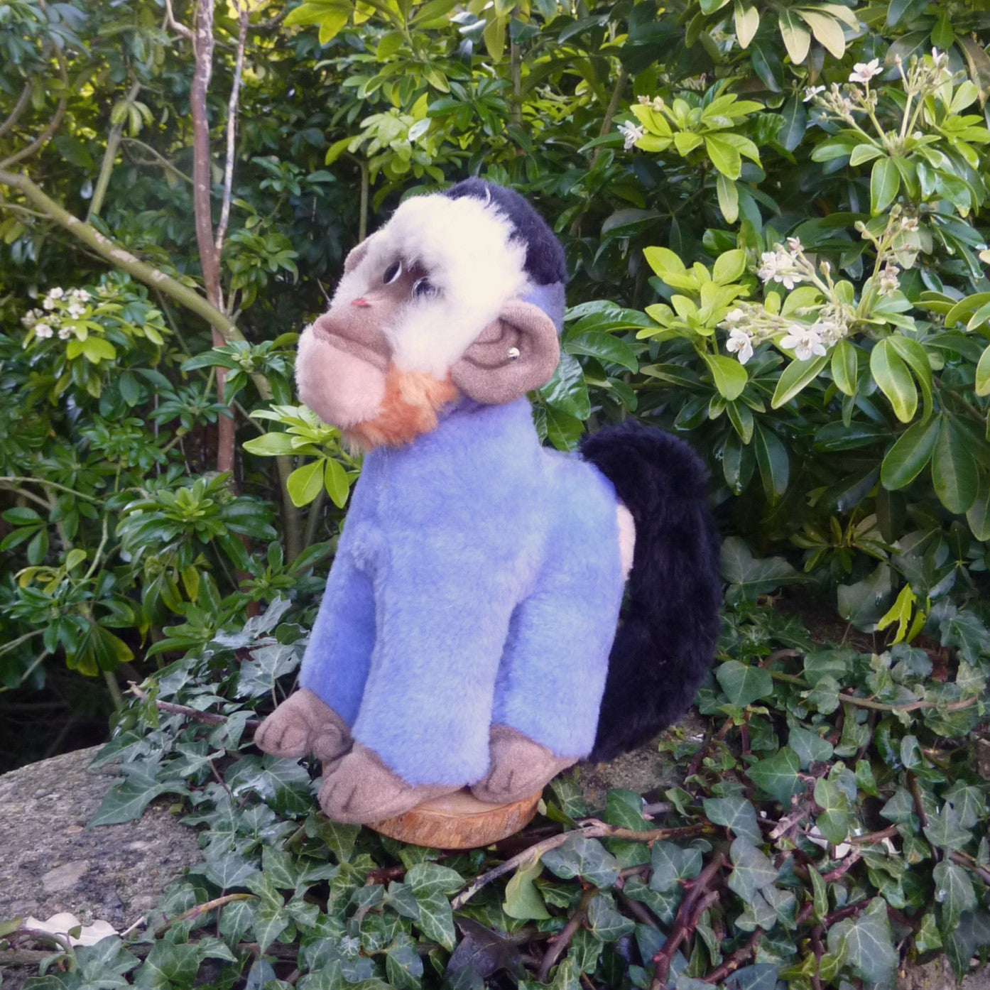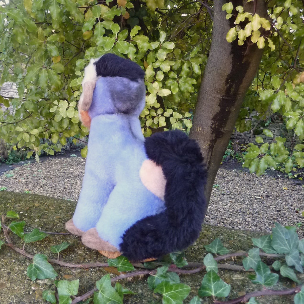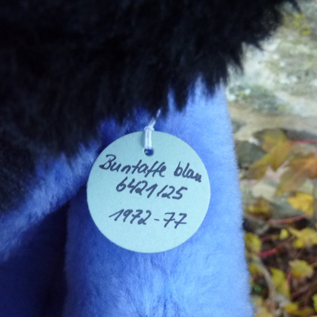 Highly unusual, this striking monkey is made of textured, (mainly) blue Dralon plush with black and white character eyes. Softly filled, he is in super condition with good, bright colouring. With button and hand-written archive label dated 1972-1977 (see photo).