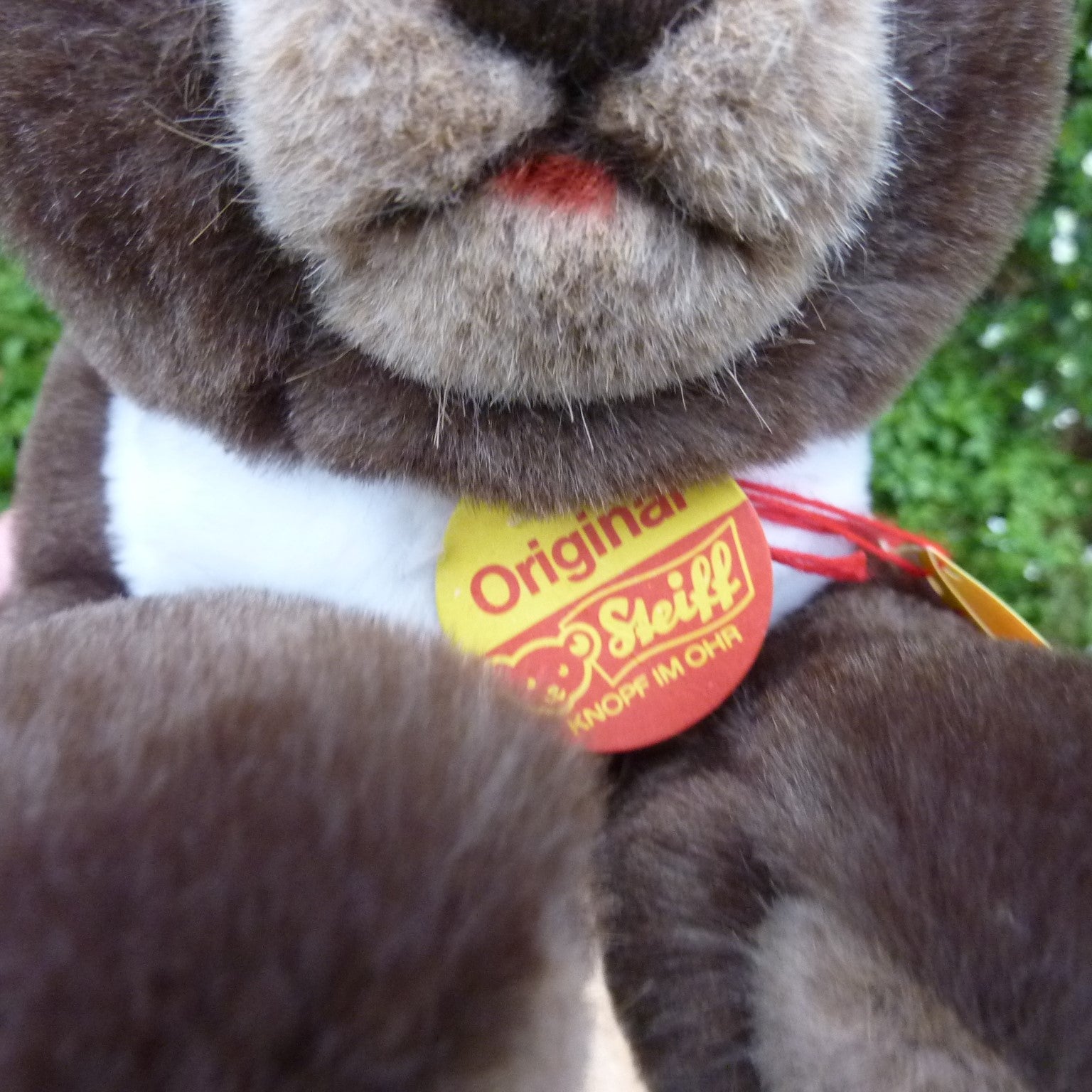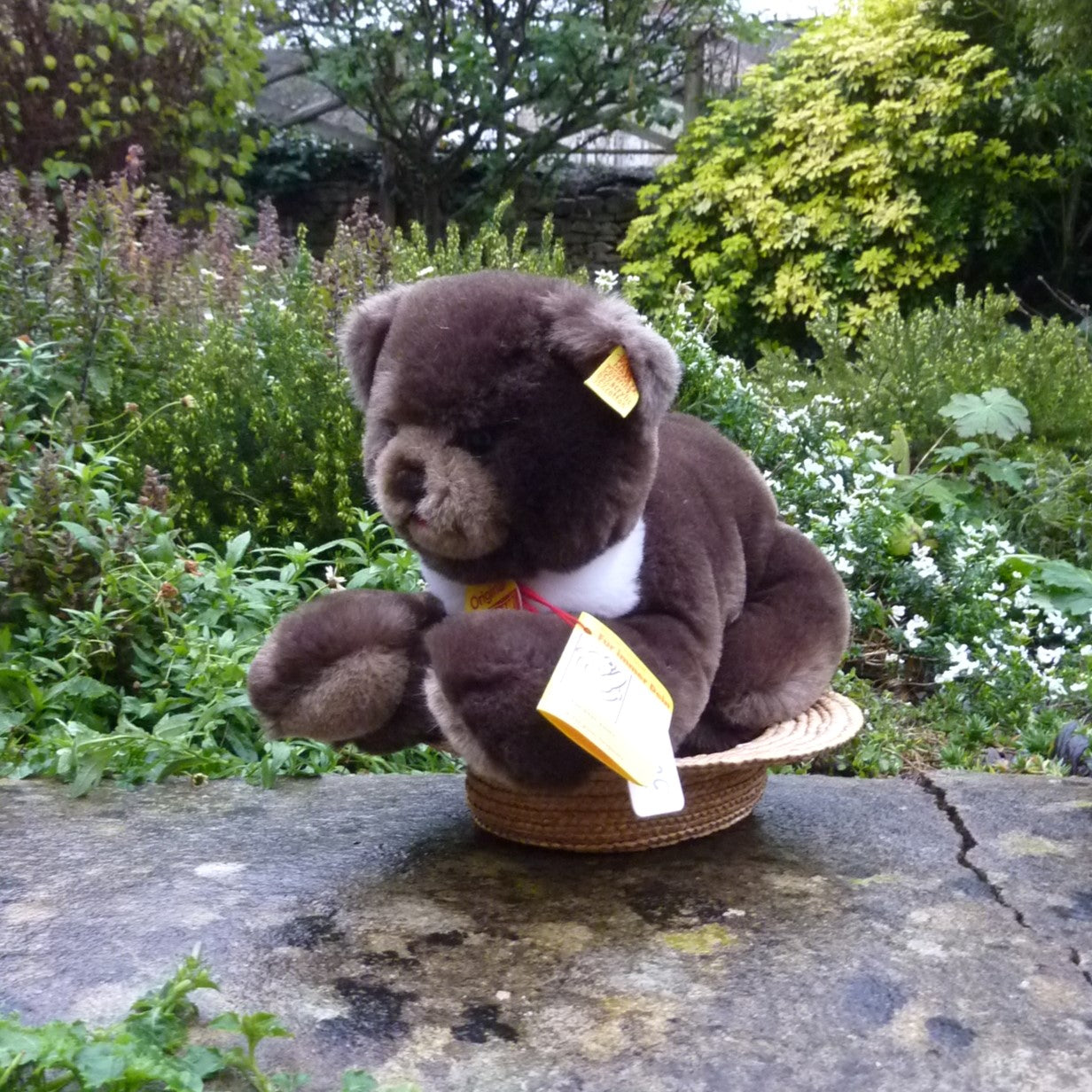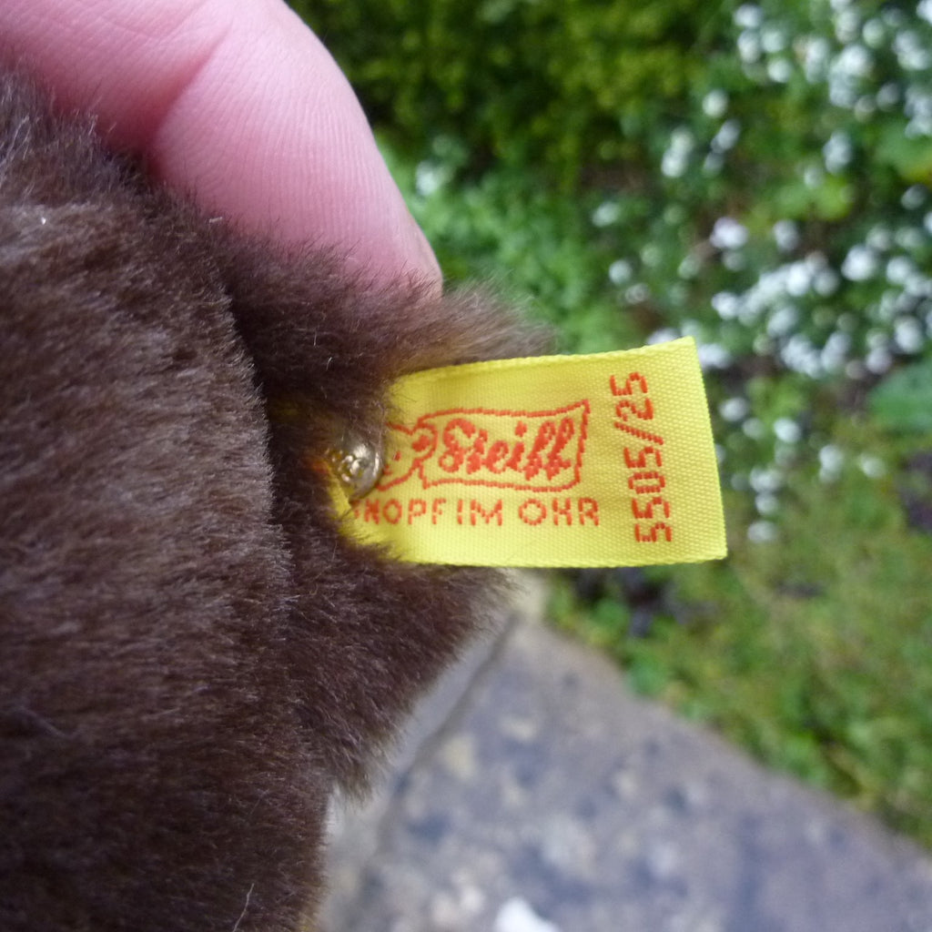 This cute and super-soft puppy is hand-made of dark brown manmade plush with large brown and black safety eyes, and an open mouth with an airbrushed tongue. In mint condition with all ID. No archive label but with a label, numbered 3060, which relates to the registered design application at the local court at Heidenheim. (see photo).