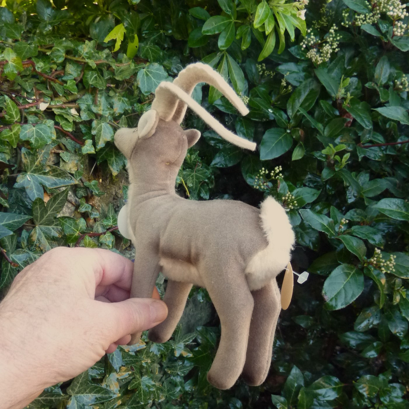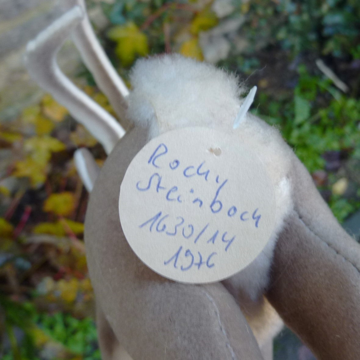 This standing, non-jointed, mountain goat is made of trevira velvet with brown and black safety eyes and long felt horns. Never with button. As new with chest tag and hand-written archive label dated 1976 (see photo).