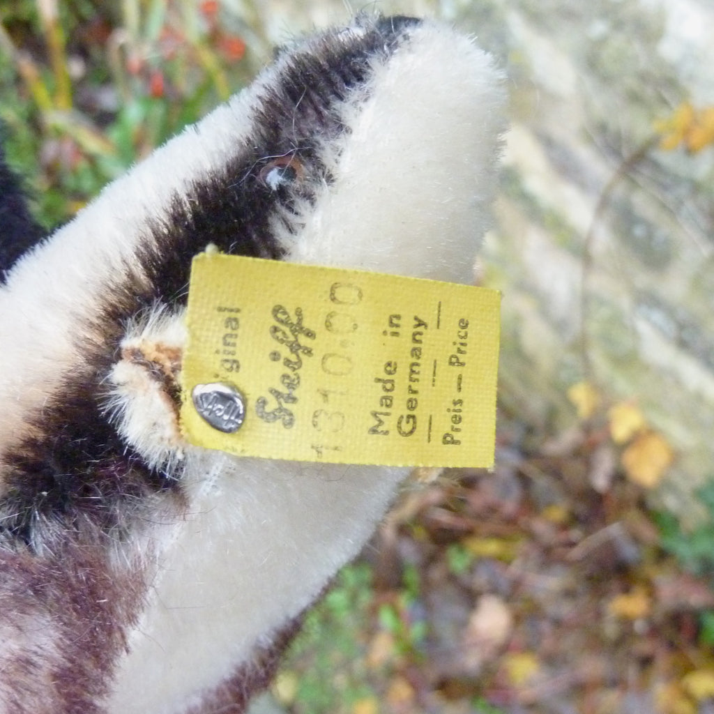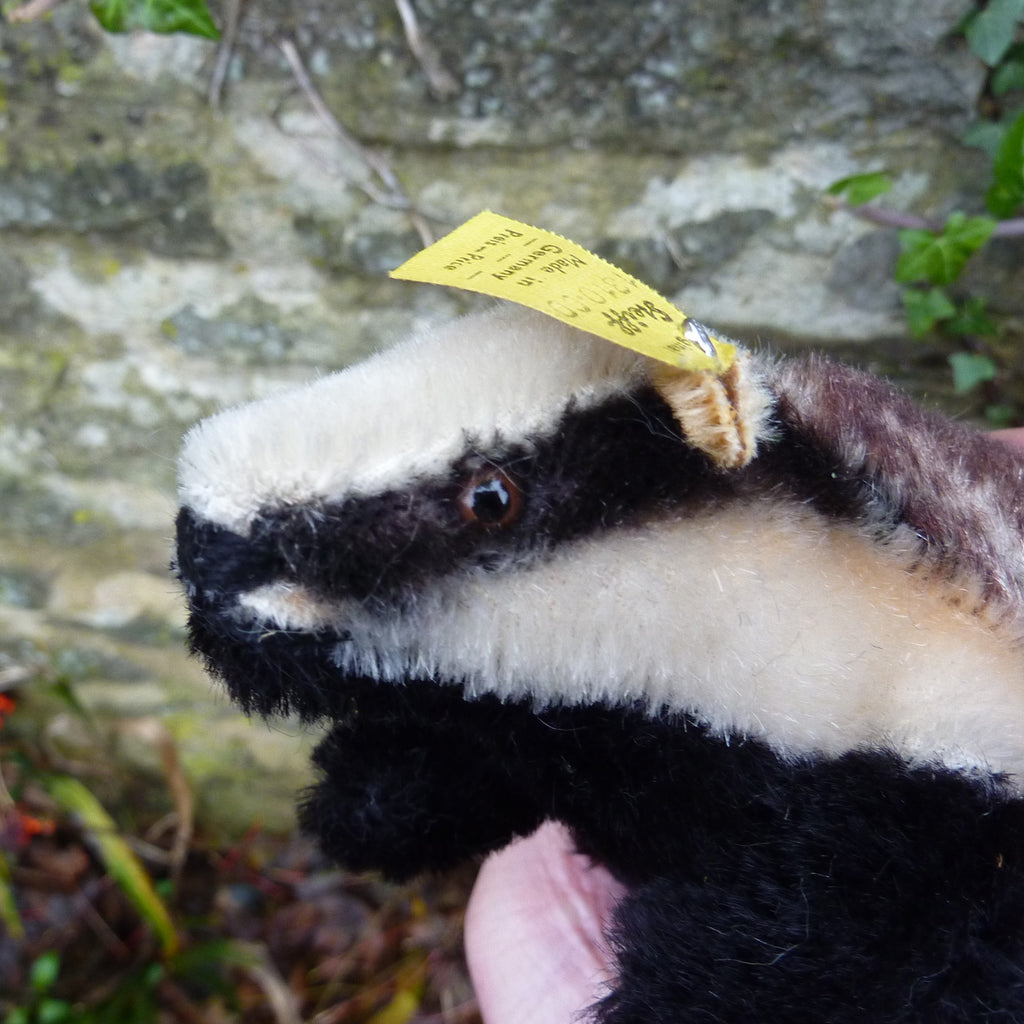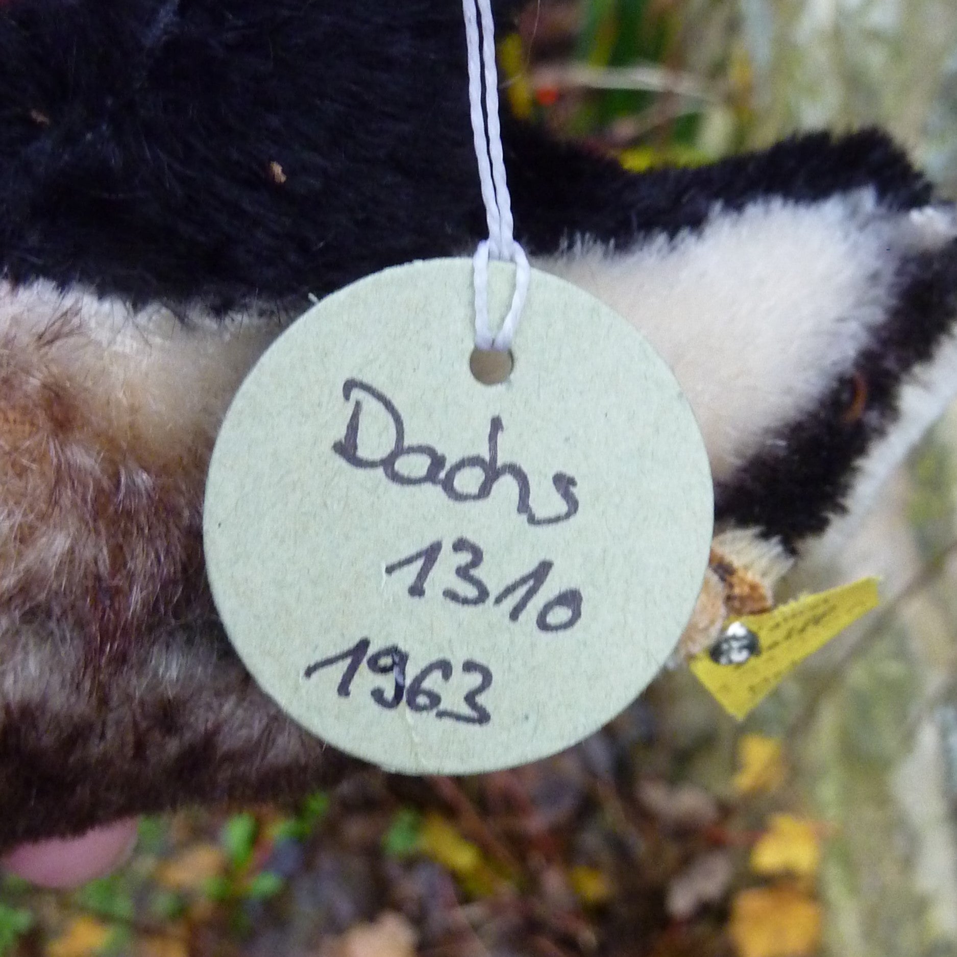 Made of white, black and brown-tipped, beige mohair with subtle airbrushed markings, this small badger has brown and black glass eyes and felt hands and feet. In excellent condition with button and full ear tag, as well as a hand-written Steiff archive label dated 1963 (see photo).